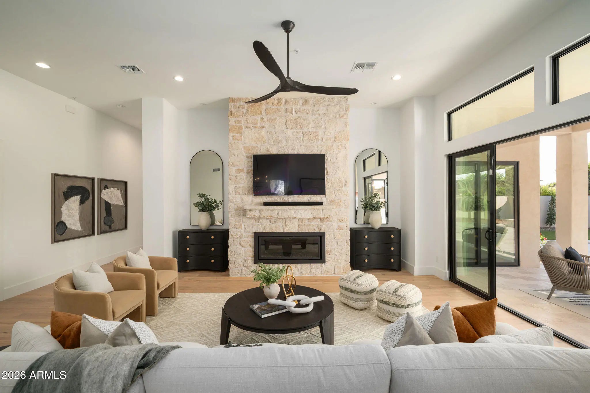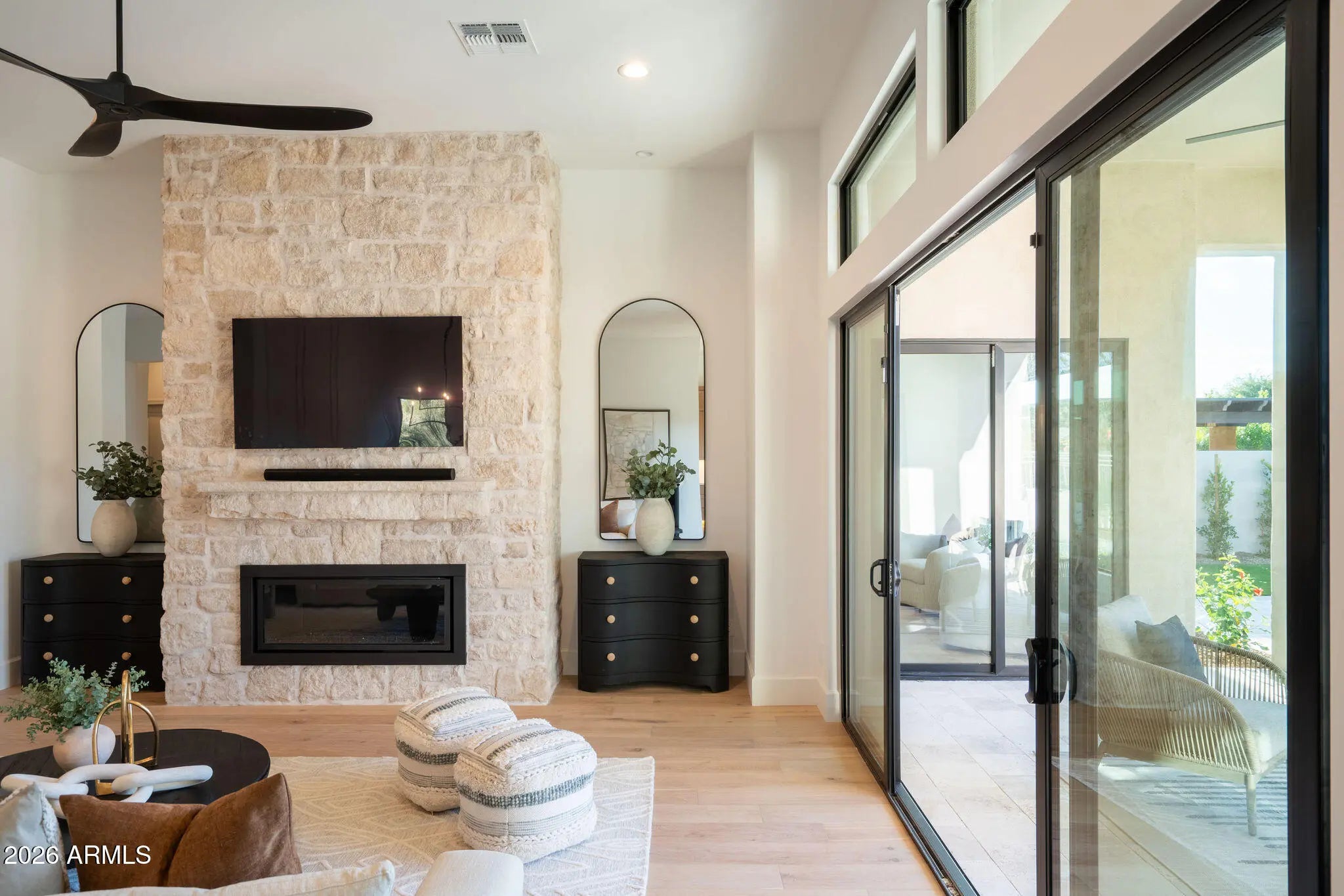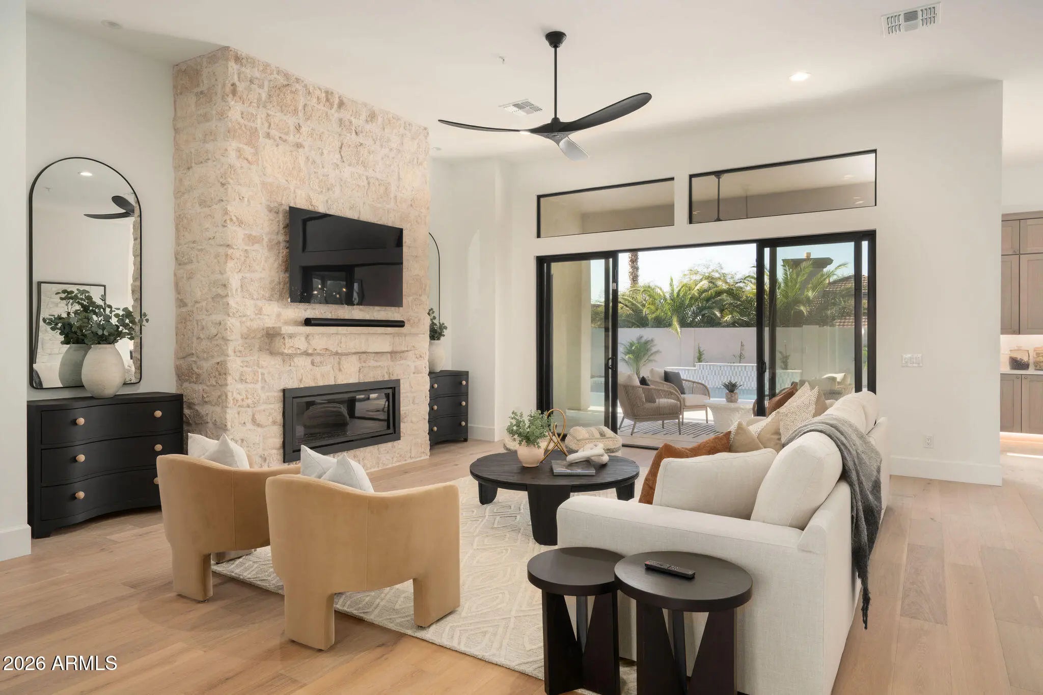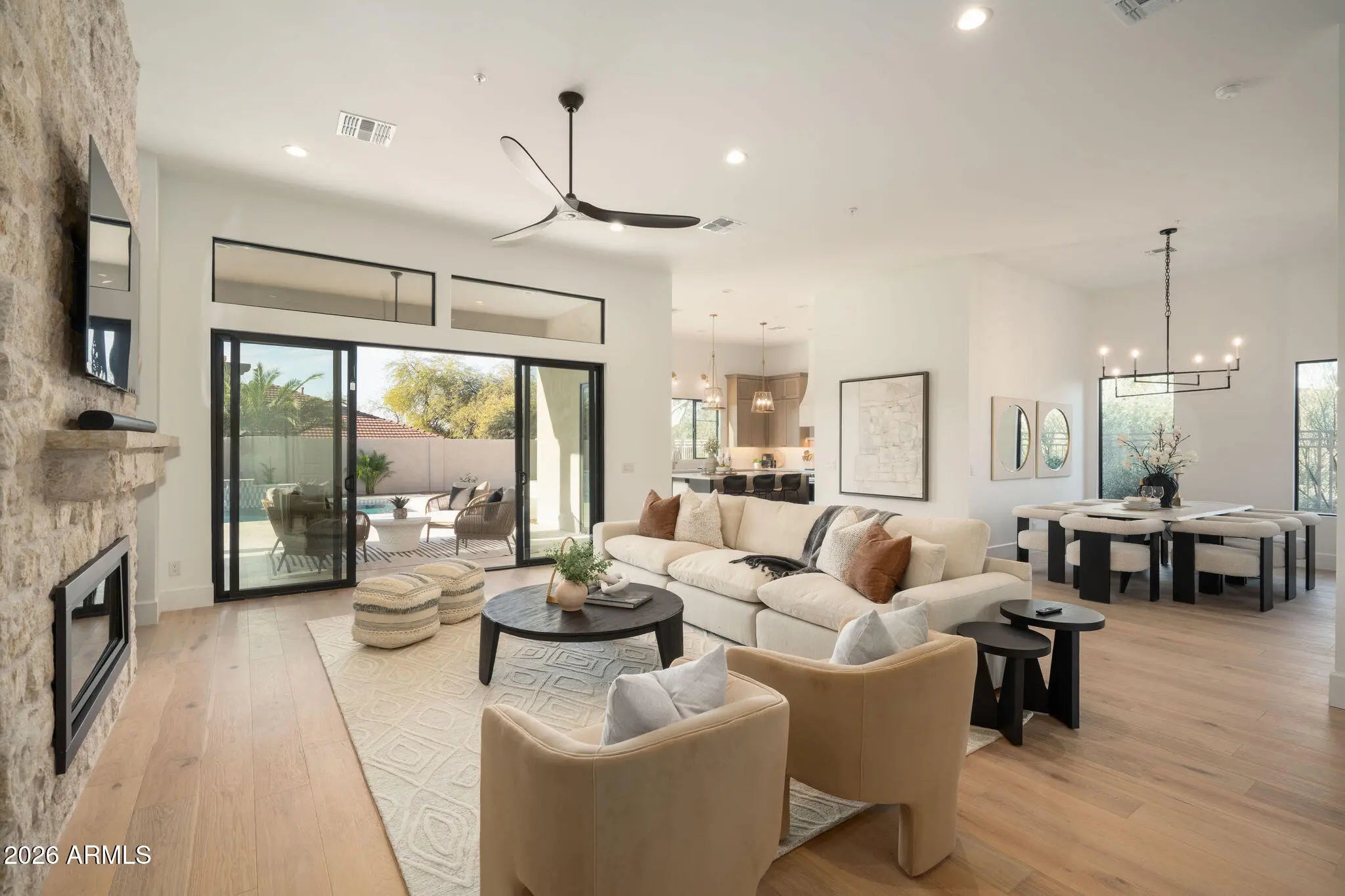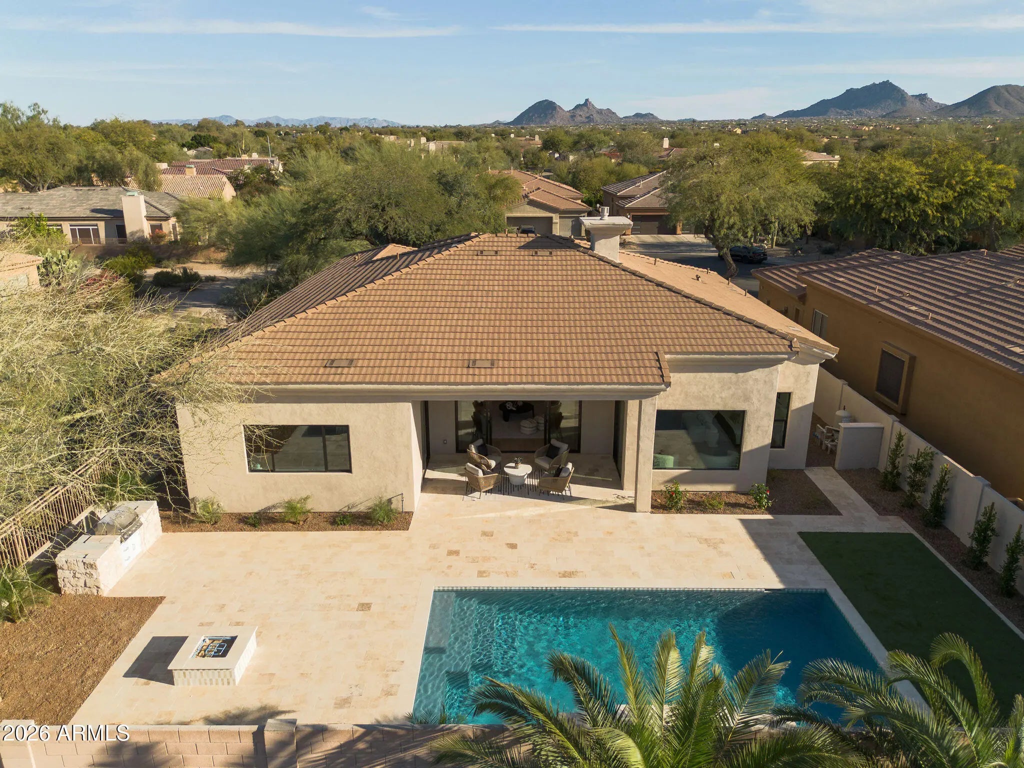 Welcome to Grayhawk! This 24/7 guard gated community is one of Scottsdale's most sought after neighborhoods offering privacy and security. This fully remodeled home features a sophisticated blend of French country charm and modern desert living. Situated on a corner lot, from the moment you walk in you are greeted by engineered wood floors and 12 foot ceilings. The heart of the home is the stunning floor-to-ceiling natural limestone fireplace, a timeless focal point that anchors the spacious living room with its organic elegance and warmth. Flanking this architectural centerpiece are two expansive 8-foot sliding doors that effortlessly disappear, seamlessly blending indoor comfort with the beautifully reimagined backyard creating an inviting indoor-outdoor flow. Perfect for effortless entertaining, relaxing evenings, or simply soaking in the natural light and fresh air. Step outside to a brand new resort-style pool framed in custom checkered tile with a wonderful built in stoned grill and built-in firepit perfect for relaxing and entertaining friends and family. Every inch of this home from the layout redesign, engineered wood floor , custom cabinetry, smoothed out drywall and new backyard, has been thoughtfully curated to deliver the feel of true elegance. Capturing the feel of a new build. The open-concept kitchen anchors the home featuring a 48" Monogram double oven gas range, matching refrigerator, and a hidden butler's pantry. The primary suite offers a spacious luxury bathroom with spa-level finishes and thoughtful lighting, designed to feel calm and restorative. On the other side of the home we have a 2 more bedrooms, a powder room and full bathroom offering their own unique style to the home. Making the flow and functionality of the home consistent throughout. Grayhawk has a wonderful country glub, nearby shopping and easy access to the freeway. Lastly, a neighborhood favorite within walking distance, Isabella's Kitchen.