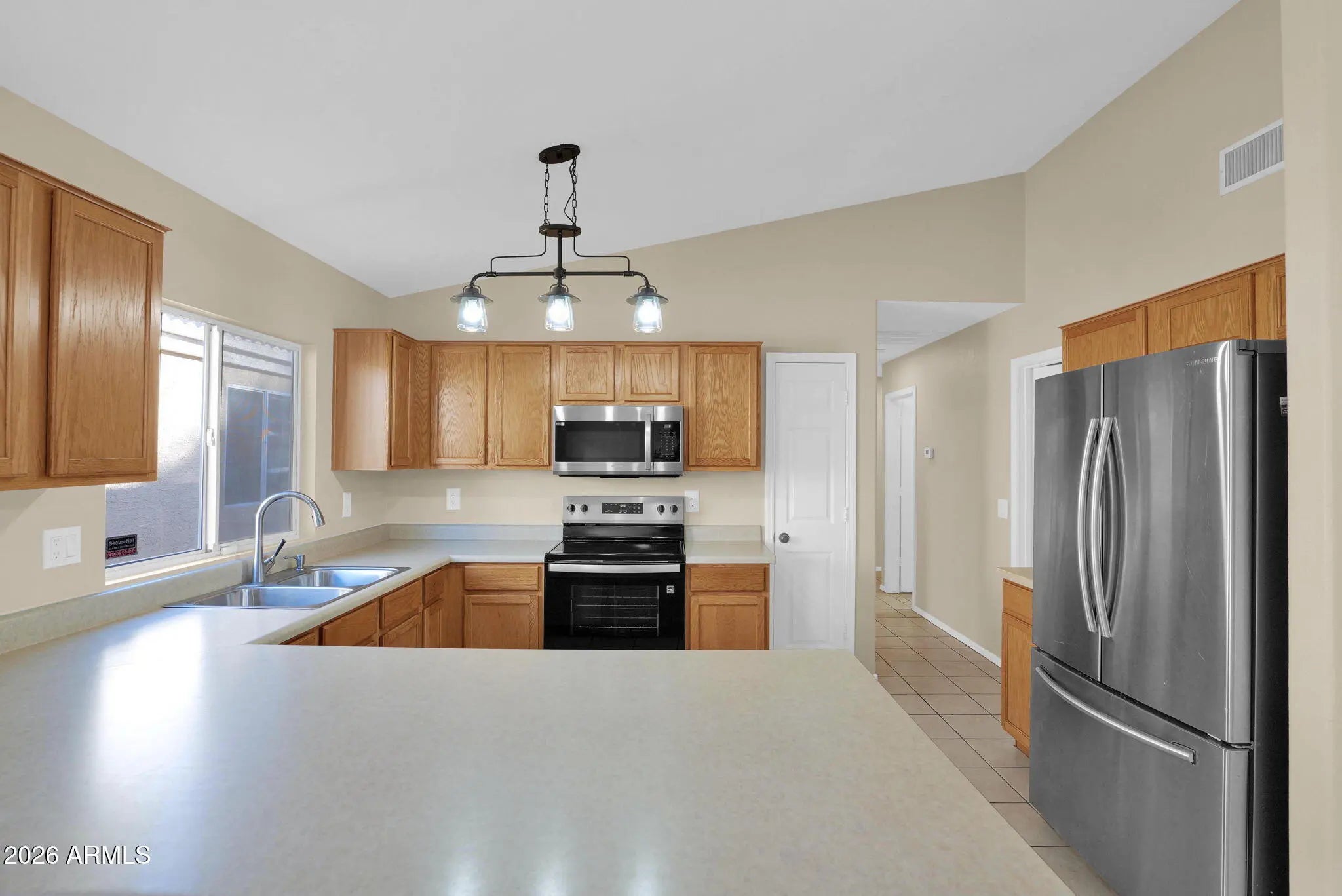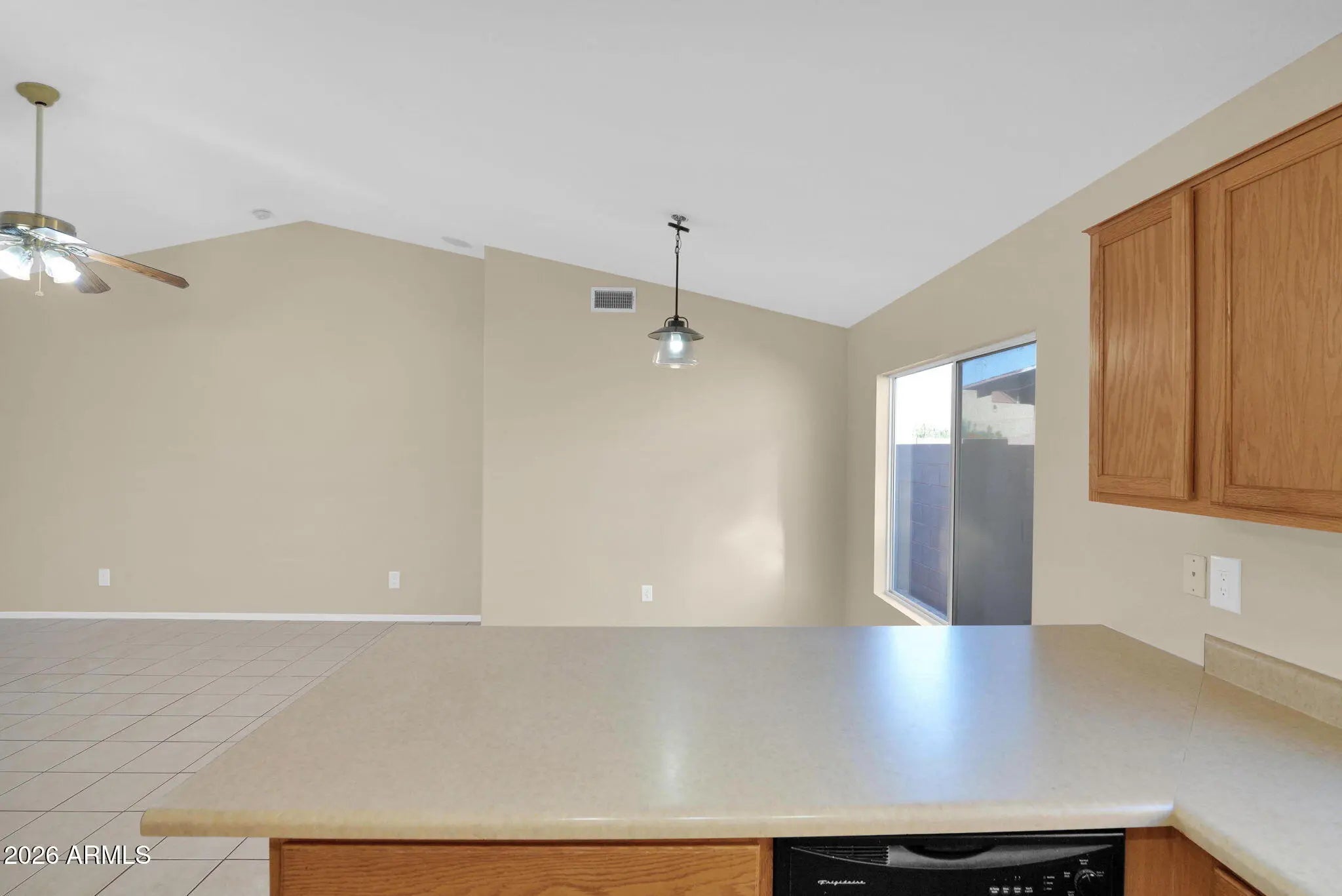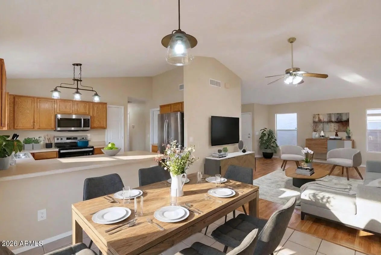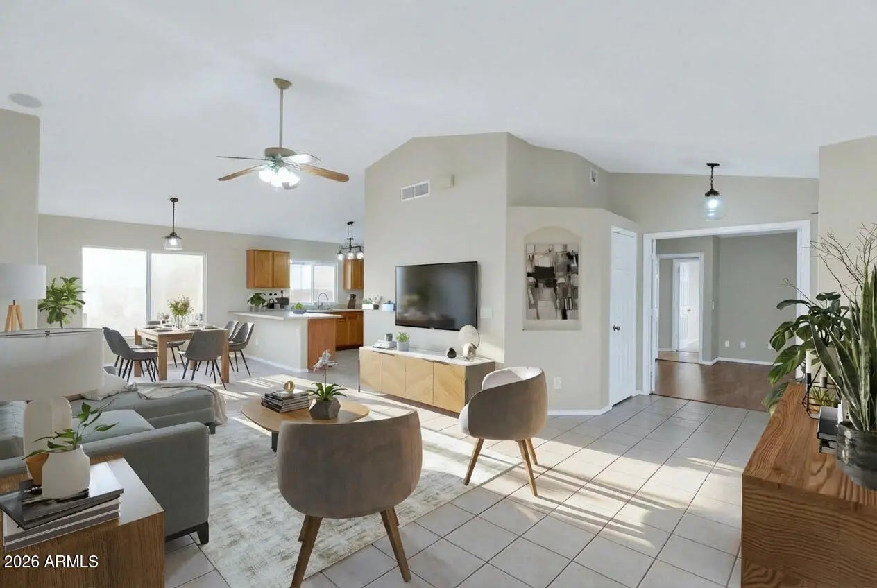 Light, bright, and move-in ready! This beautiful home features an open great-room floor plan with vaulted ceilings, tile flooring throughout the main living areas, creating a spacious and airy feel. The kitchen offers ample cabinetry, generous counter space, a breakfast bar, and stainless steel appliances, opening seamlessly to the dining and living areas—perfect for everyday living and entertaining. Large windows and sliding glass doors bring in natural light and provide easy access to the backyard. Step outside to a private patio and low-maintenance yard, ideal for relaxing, grilling, or enjoying Arizona evenings. The backyard also includes a raised planter area and block fencing for added privacy. Additional highlights include neutral fresh interior paint tones, updated lighting fixtures, an open layout that maximizes functionality and flow, and an efficient solar system to help reduce energy costs. This home is move-in ready! Conveniently located near Freeways 101 and 51. Must See!