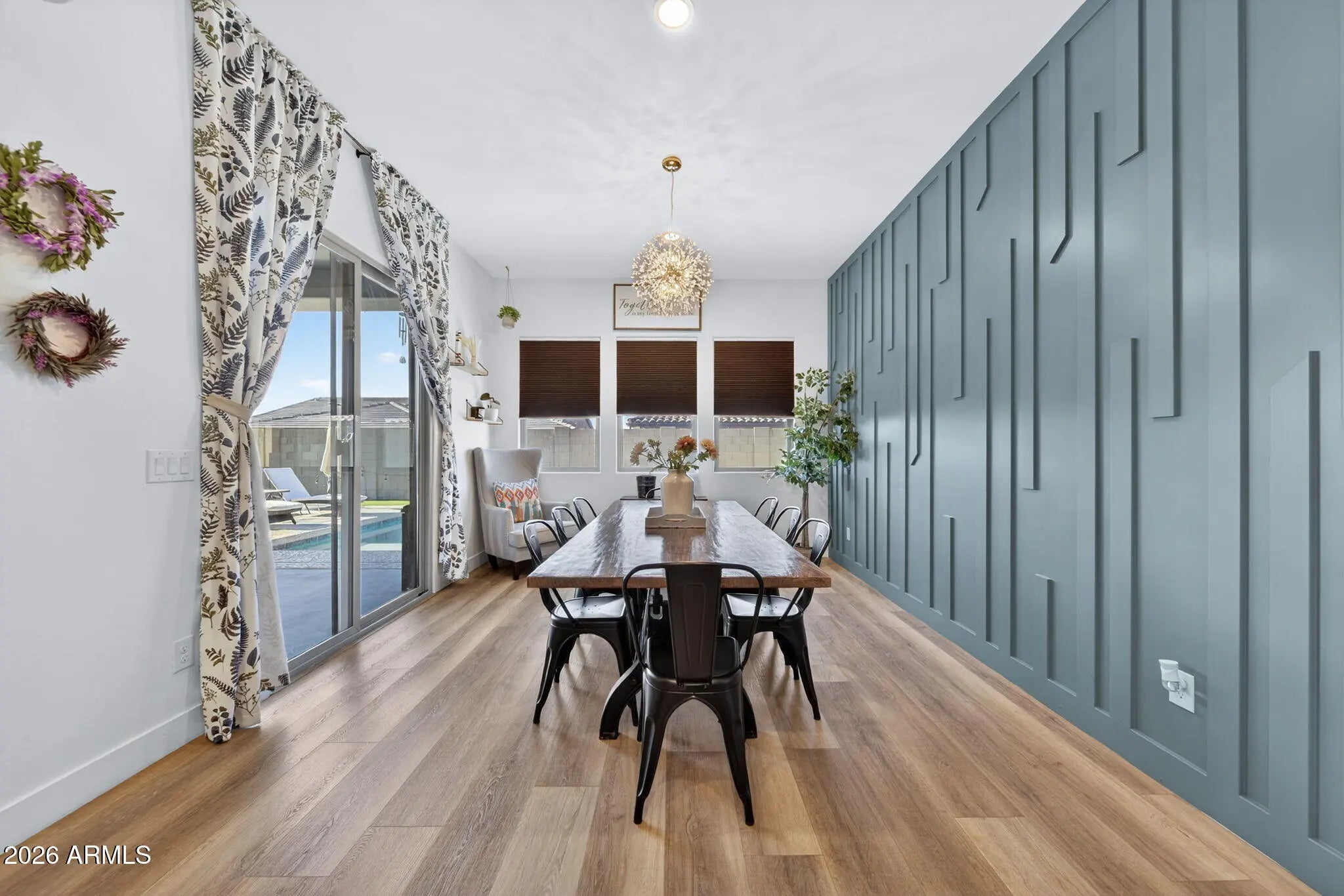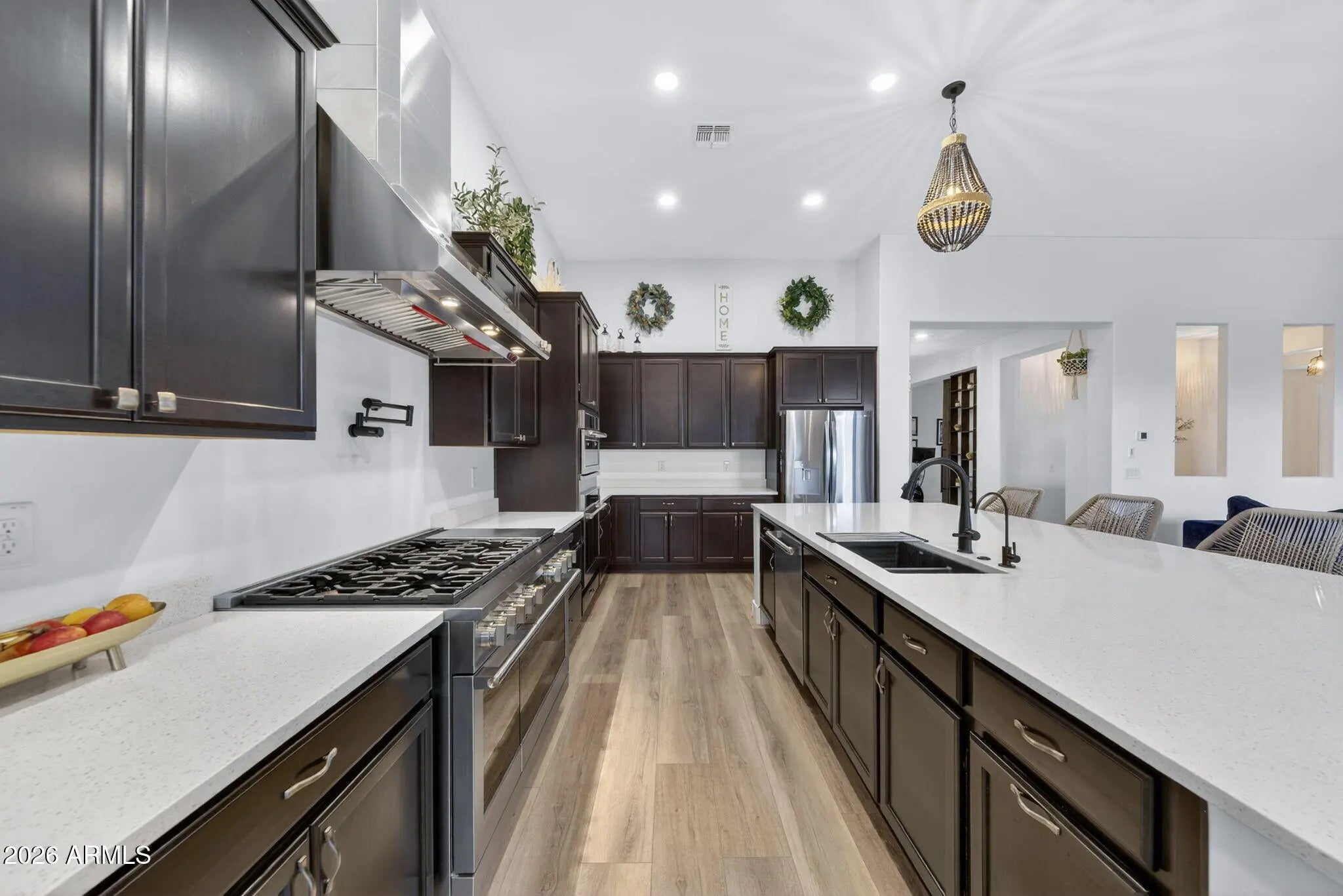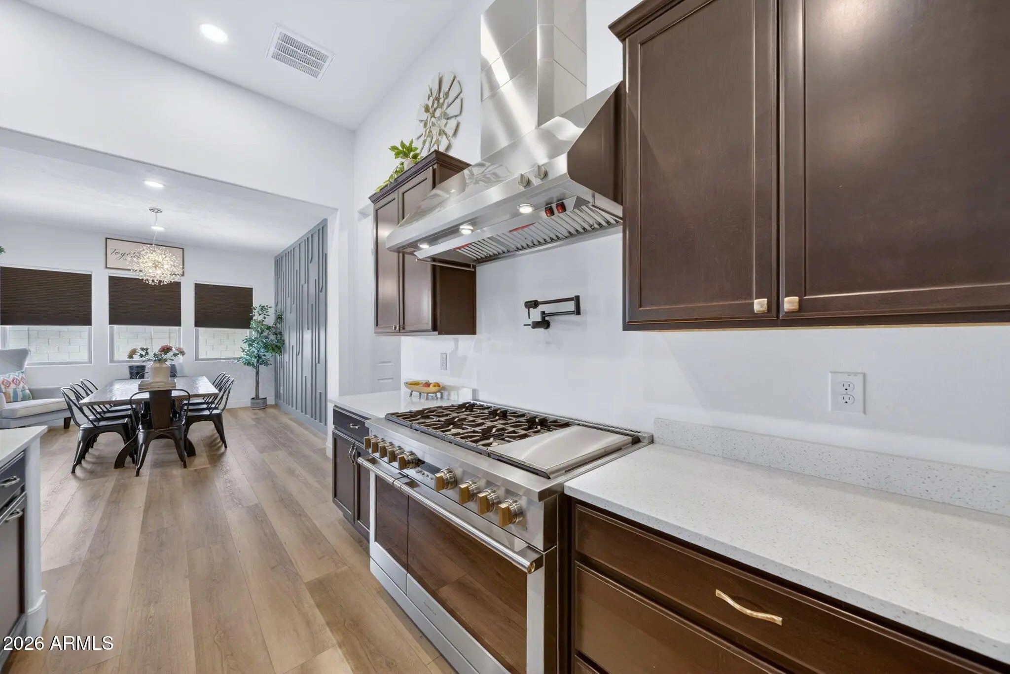 Spectacular Single-Story 4-Bedroom Home in Eastmark Mesa - Luxury Living at Its Finest! Discover this stunning single-level 4 bedroom, 4.5 bath home with a 3-car garage, perfectly situated in the highly sought-after Eastmark master-planned community in Mesa, AZ. This modern residence offers premium custom upgrades throughout and embodies the vibrant, connected lifestyle that makes Eastmark one of Arizona's top-selling communities. Step inside to an open-concept design flooded with natural light from a massive sliding glass door in the living room. Luxury vinyl plank flooring and recessed lighting flow seamlessly through the main areas. The chef's kitchen is a showstopper, featuring top-of-the-line stainless steel appliances, quartz countertops, multiple ovens, a gas range with hood and pot filler, a large island with breakfast bar, and an oversized walk-in pantry. The luxurious owner's suite includes a spa-like bath with his-and-hers sinks, an expanded walk-in shower, separate toilet room, and a generous walk-in closet with custom shelving. Three additional spacious bedrooms each boast their own attached bathrooms for ultimate privacy and comfort. Outside, enjoy resort-style living in your private backyard oasis: a covered patio, sparkling in-ground pool, and low-maintenance synthetic grass perfect for year-round enjoyment without the hassle. Eastmark delivers an exceptional neighborhood atmosphere with rich community connections, creativity, and spirited engagement. Residents love the innovative amenities, including the expansive Eastmark Great Park (splash pad, playgrounds like the Orange Monster, lake, riparian stream, event pavilion, trails, open fields, baseball fields, basketball courts, dog park, and more), neighborhood parks, top-rated schools (including BASIS Mesa and Eastmark High School), walking trails, and easy access to dining, shopping, entertainment, and major freeways like the US-60. This is more than a homeit's a lifestyle in one of Mesa's most desirable master-planned communities. Don't miss this rare opportunity to own a luxury single-story pool home in Eastmark!