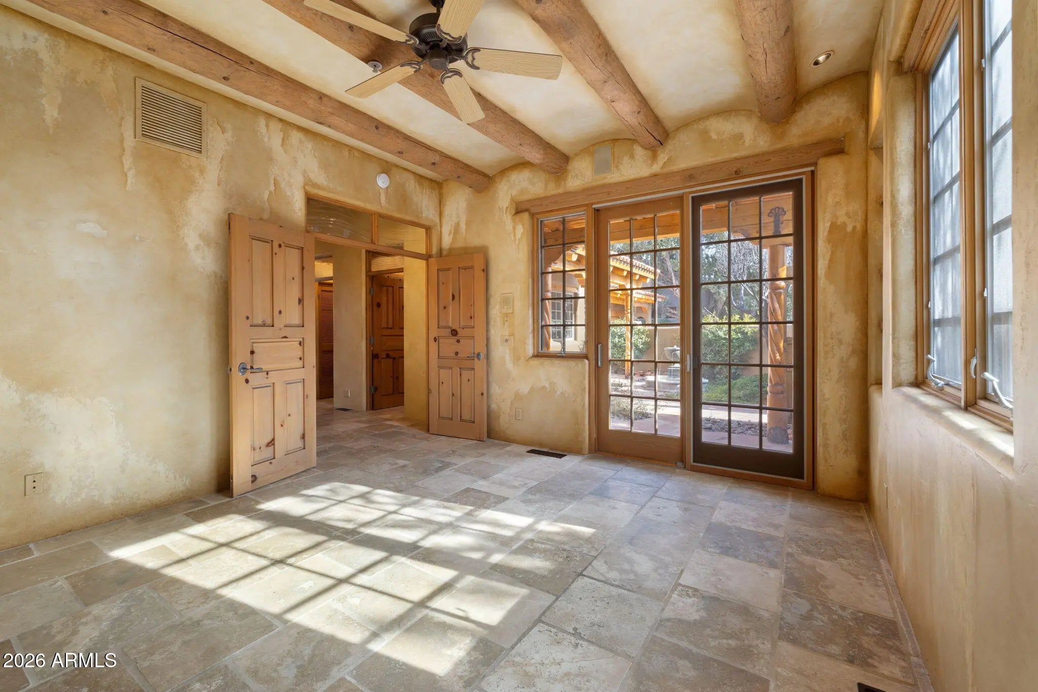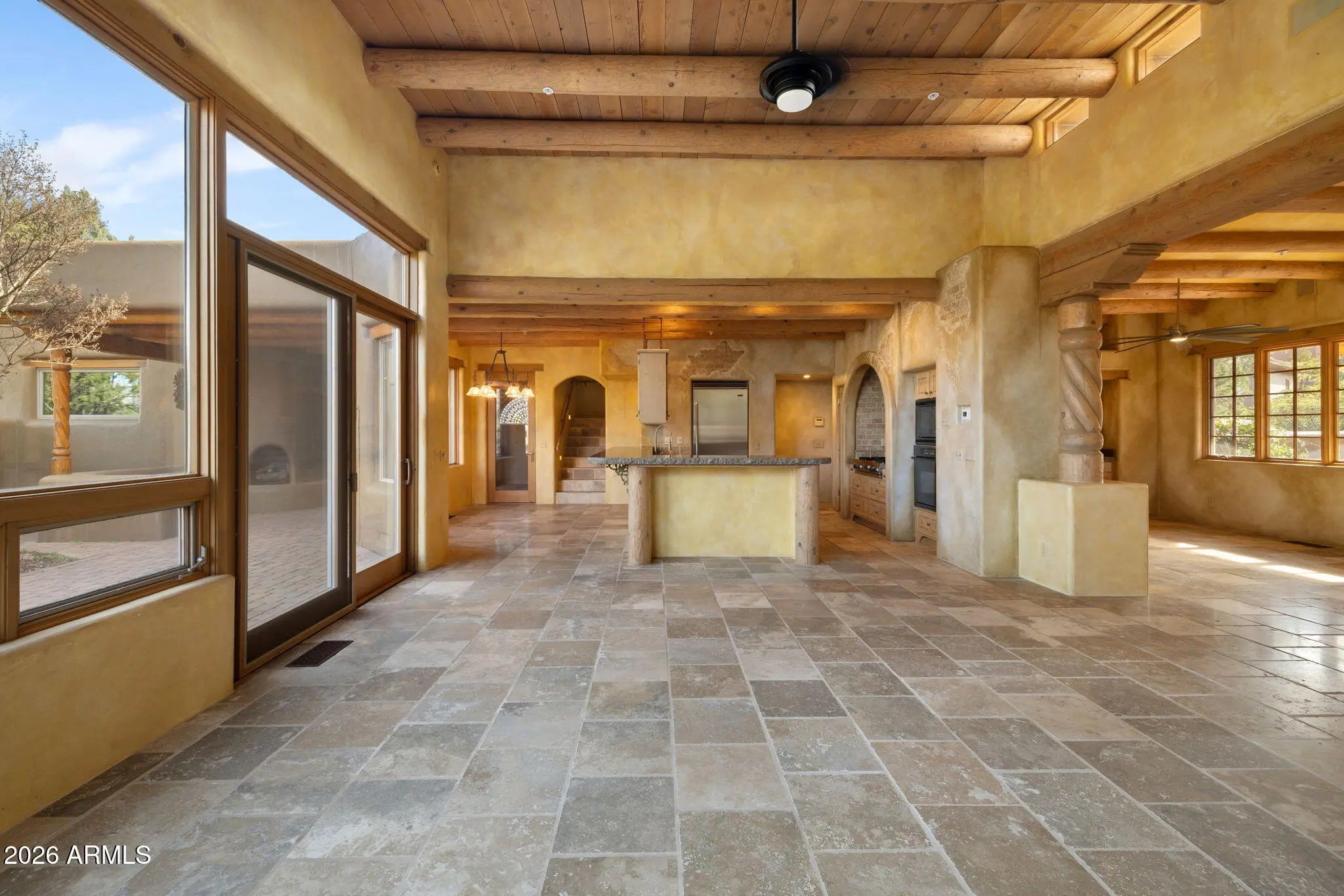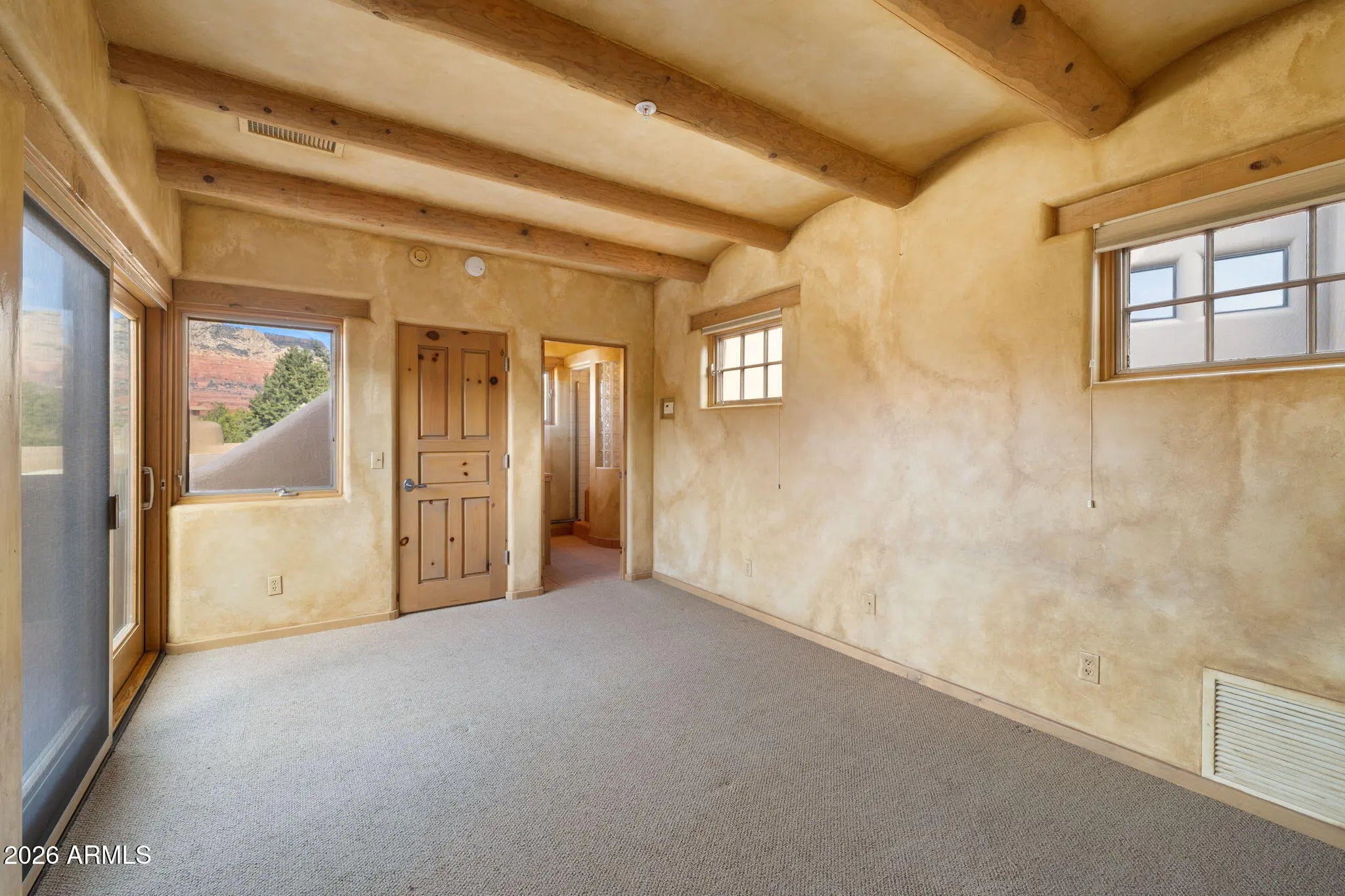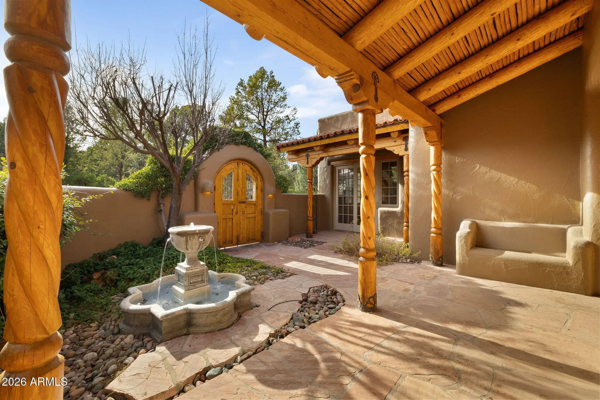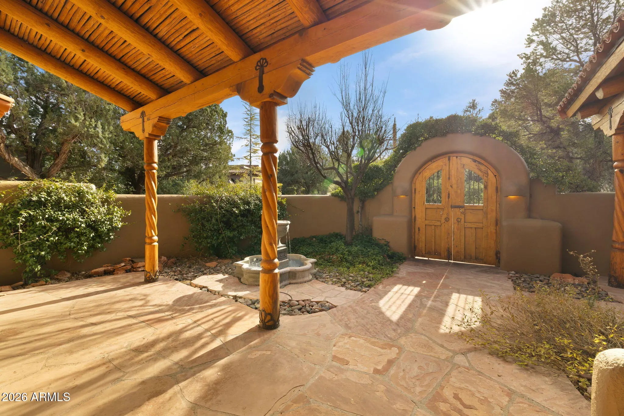 Located in the exclusive gated community of Casa Contenta, this distinctive hacienda-style home offers privacy, views, and a prime Sedona location just off Soldier's Pass Road. Enjoy direct access to nearby trails, stunning views of Coffee Pot Rock, and close proximity to restaurants, grocery stores, and everyday conveniences. The community features a resort-style pool, pickleball and tennis courts, and a clubhouse currently undergoing flooring upgrades. The home backs a wash, preserving unobstructed views and enhancing privacy, with immaculate landscaping throughout. The residence includes three suites, each with an en-suite bathroom and generous closets, one of which is detached with a separate entrance. Two of three of the bedrooms have their own fireplaces, creating a lovely ambiance. Interior highlights include three gas fireplaces, a den/library with built-in bookshelves and sliding glass doors opening to a private courtyard with fountain, and a well-appointed kitchen with Viking refrigerator and cooktop. Outdoor amenities include a built-in gas fireplace, built-in grill, and an in-ground jacuzzi. The primary suite offers a steam shower and jetted tub. A rare combination of location, community amenities, and thoughtful design in one of Sedona's most desirable areas. This one is a rare gem!!