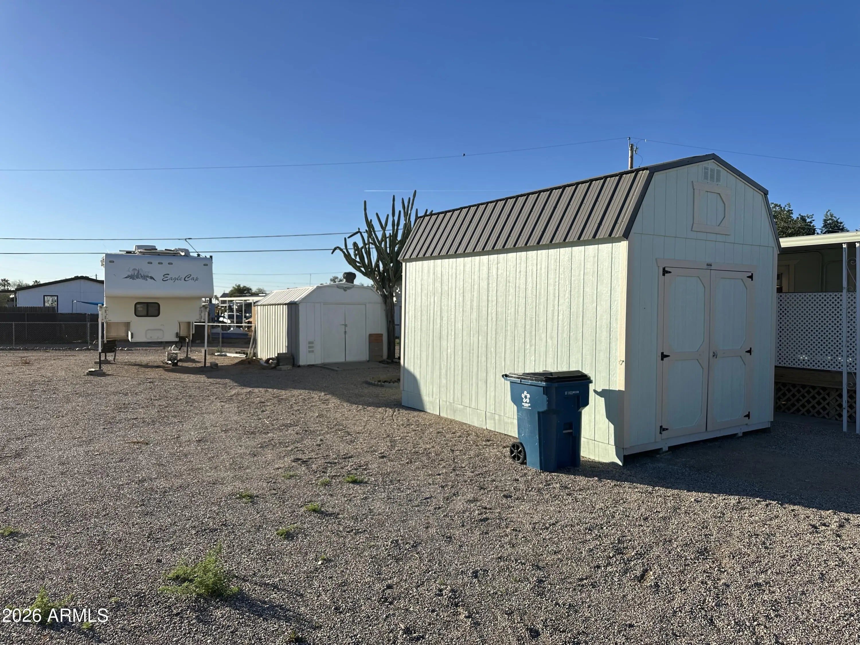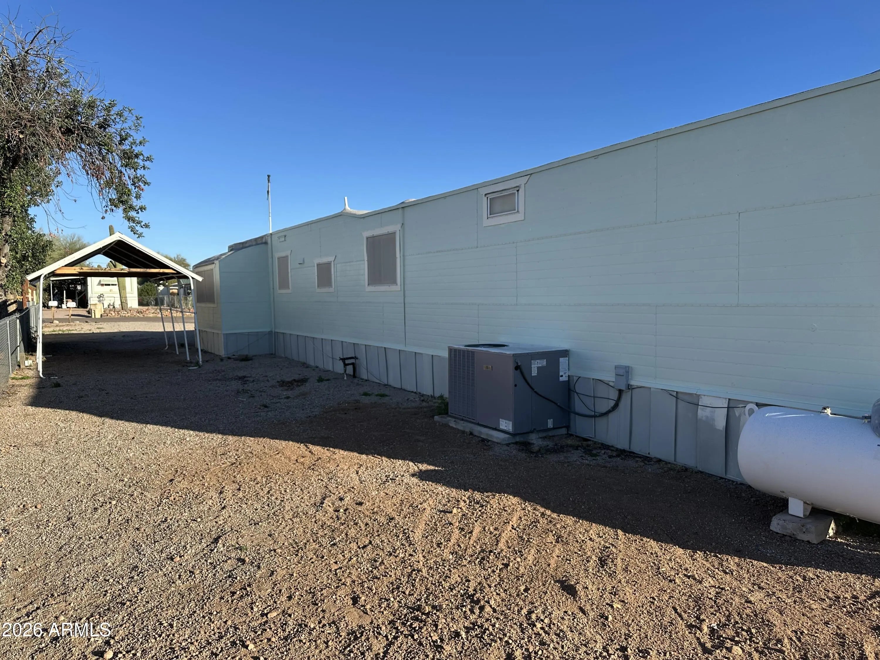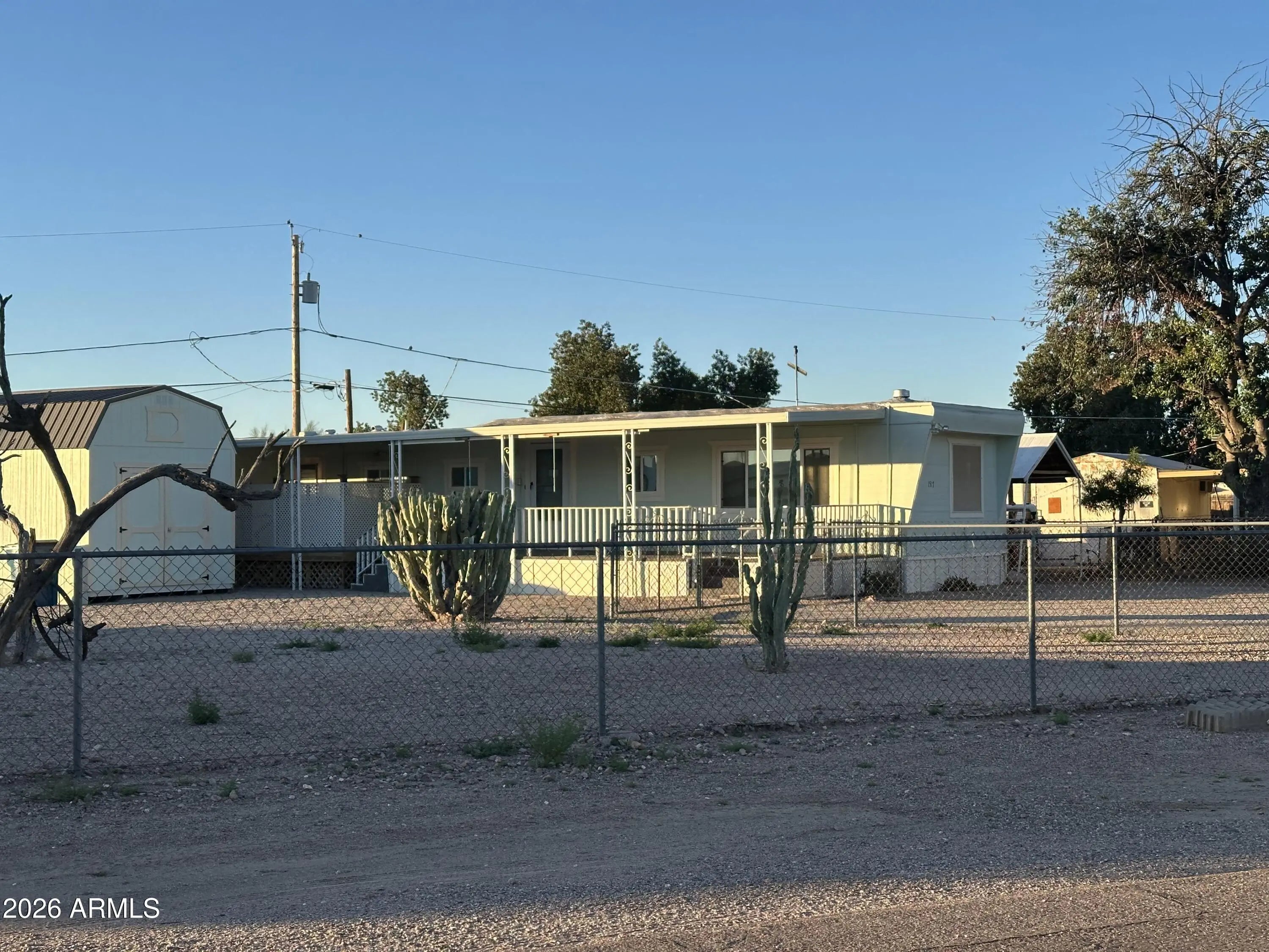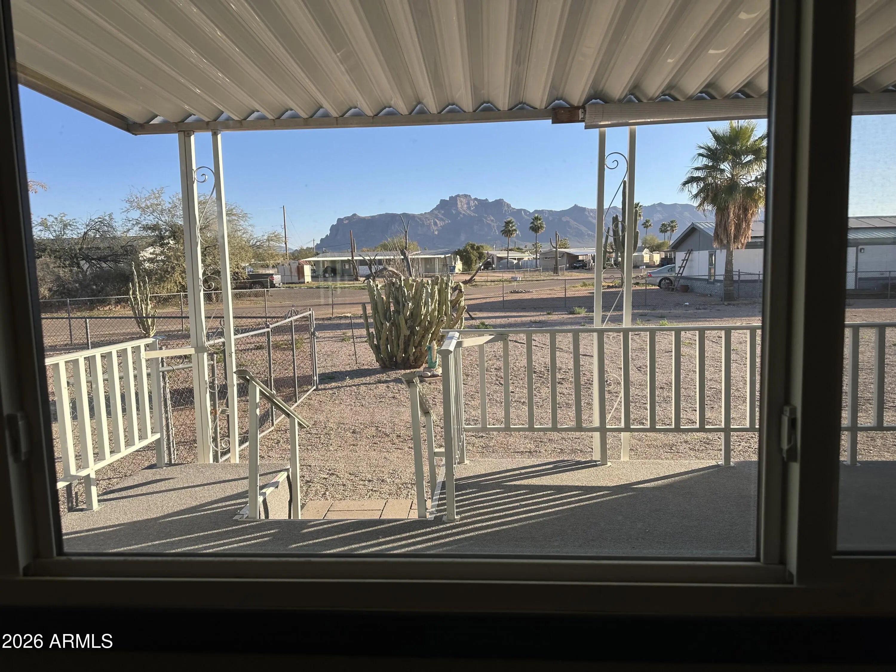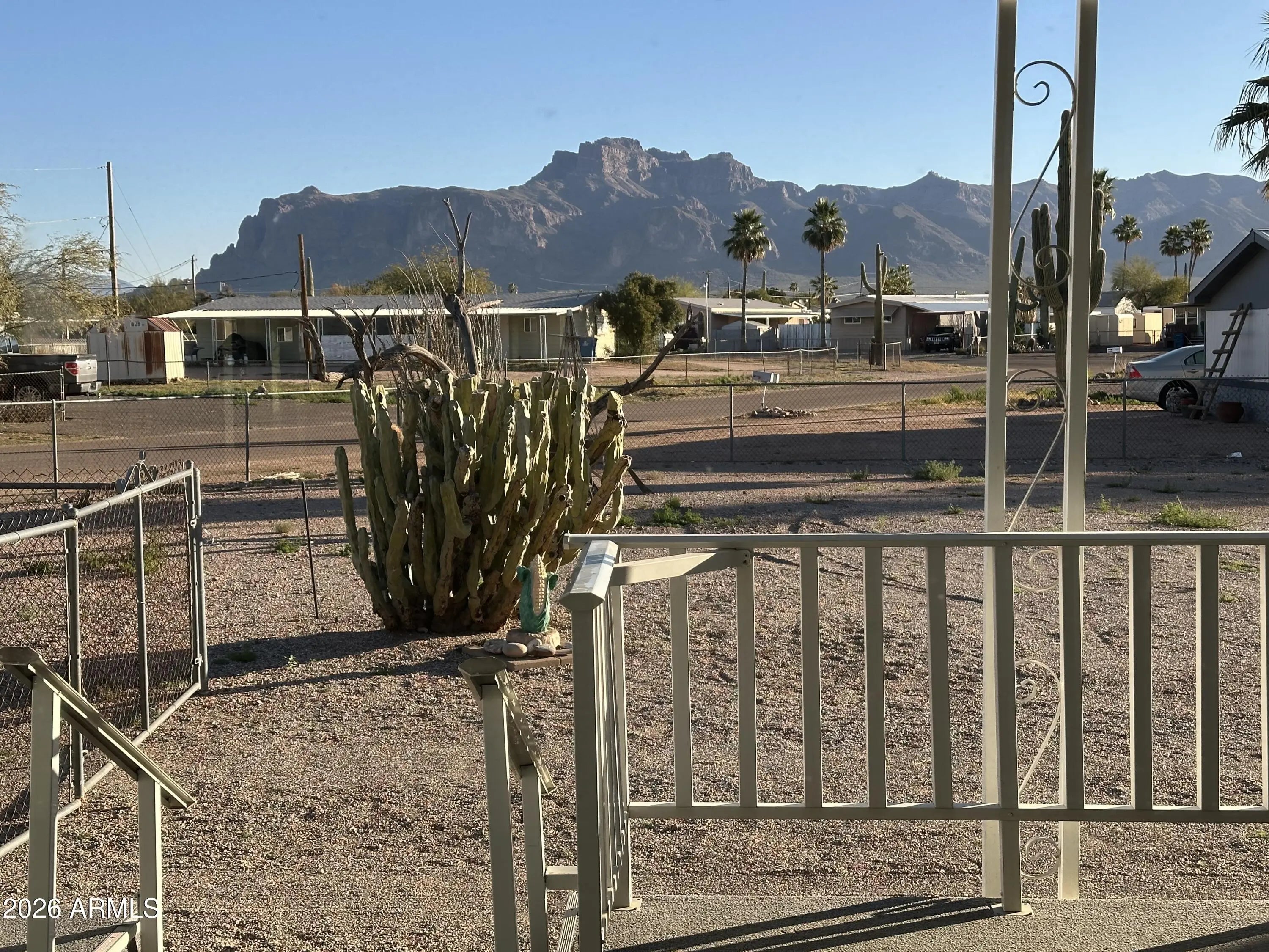 You Own the Land!! Charming updated 2 bedroom 1 bath home with Awesome Views of the Superstition Mountains. 2 fantastic decks. Upgraded Vinyl Windows throughout. Front living room with tip out addition. Corner Electric Fireplace with produces heat. 3 burner gas stove/oven. French 3 door refrigerator. Ceiling fans throughout. Mirrored closed doors. Updated water heater & HVAC heatpump. Inside laundry including washer & dryer. There is also like new 10x16 workshop / storage shed included plus another 8x10 metal shed. Covered parking for 3 autos, fenced in yard and much more. This is only for the home and 1 lot. The additional lot to the East can also be purchased if you want something with a larger lot or multi-family situation / large workshop etc. Great potential