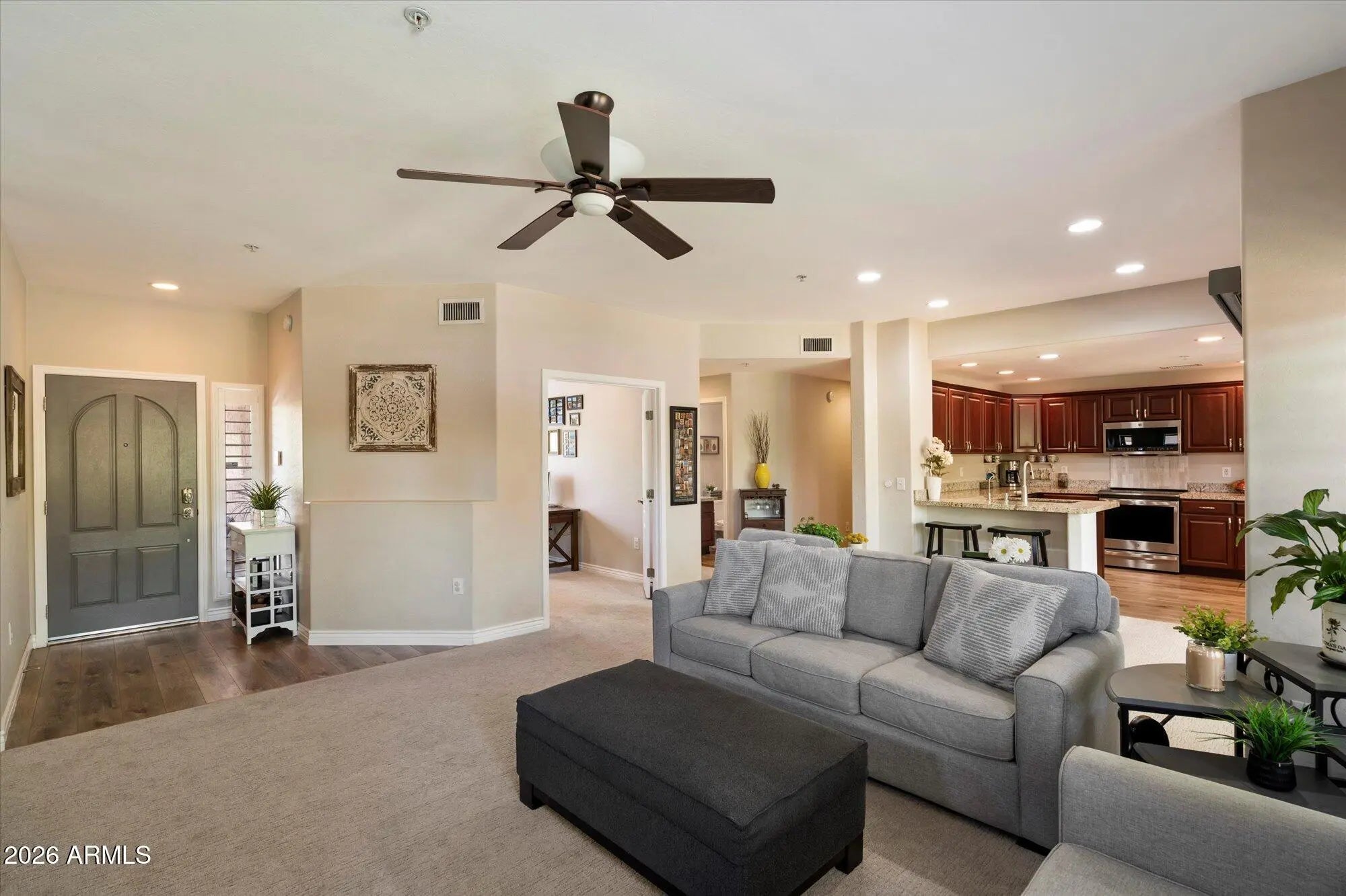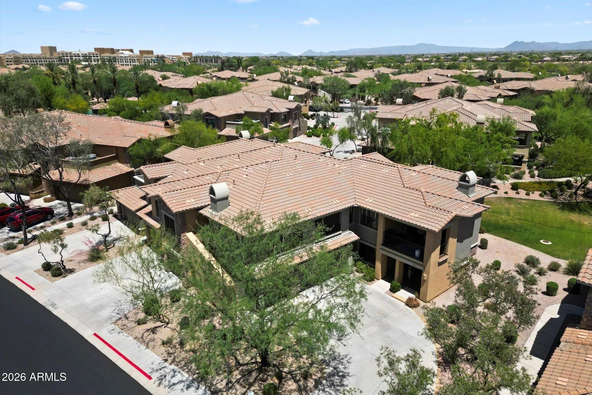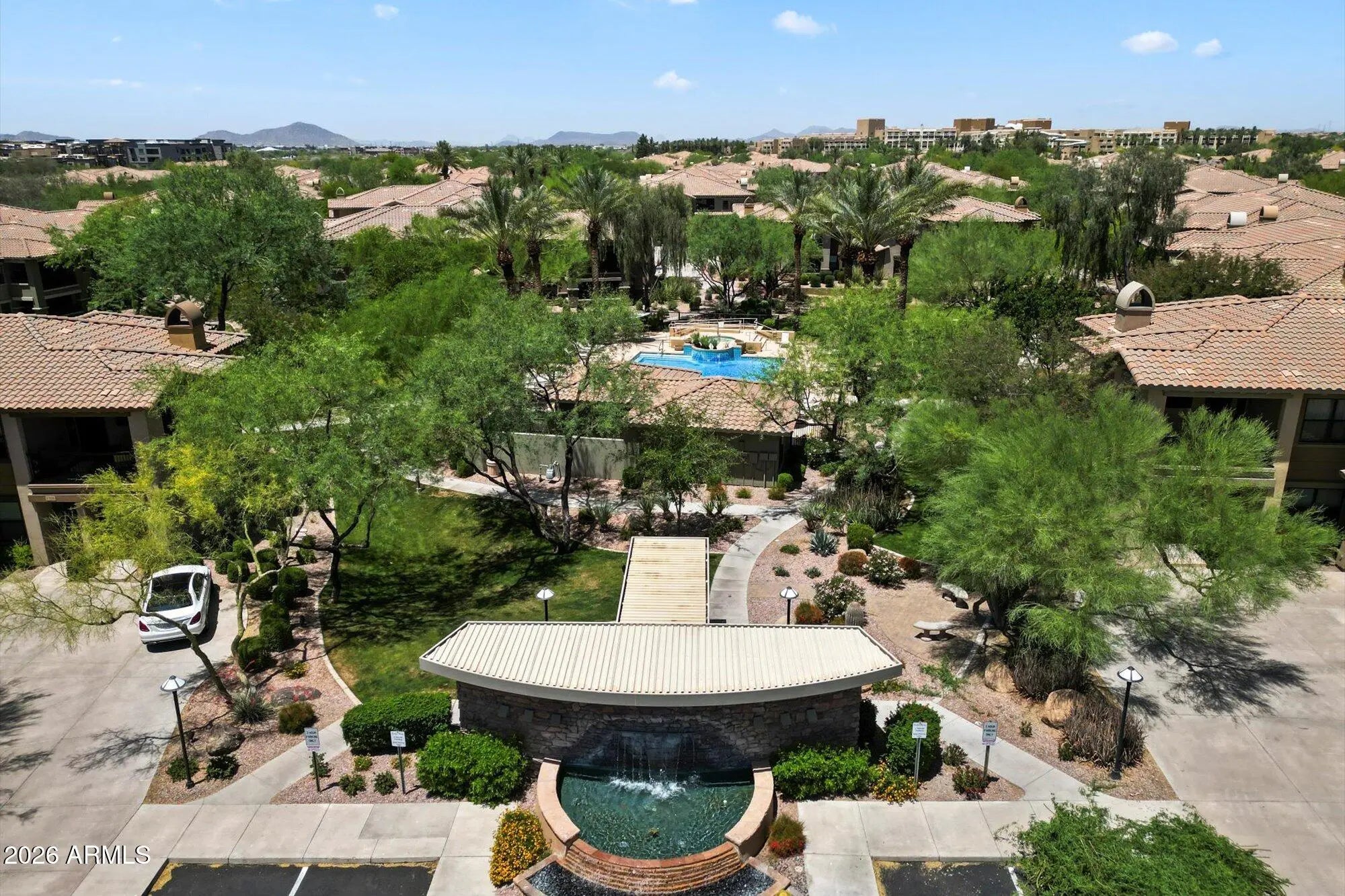 Experience elevated resort living in the coveted, gated community of Bella Monte. This beautifully updated & impeccably maintained condo offers a rare blend of privacy, and a versatile layout with 2 bedrooms, a den/office, 2 full baths, & dual walk-in closets, providing both comfort & flexibility. The main living area is warm, inviting, features a gas fireplace (you'll enjoy even in AZ) and a glass slider outfitted with a Hunter Douglas remote-controlled shade—programmable or operated at the touch of a button. The kitchen is designed for both everyday living and entertaining, featuring a breakfast bar, GE Profile appliances, an induction/convection range with built-in air fryer, abundant counter space, generous cabinetry, and a pantry. This rare and desirable floor plan—one of only one per buildingboasts TWO private decks, perfectly positioned with north-south exposure for year-round enjoyment. Additional storage is exceptional. It includes a large under-stair storage room and an extra-large walk-in storage area off the laundry room. This condo was recently recarpeted and AC is less than 2 years old. Enjoy serene open greenbelt views from the north-facing rooms, with no neighboring patios or decks directly behind. It'sprivacy and tranquility at its best. The 2-car garage offers two heavy-duty storage racks and a delayed-close garage door system for added convenience. Bella Monte offers true resort-style amenities, including three heated pools, three heated spas, and two natural-gas grills at each pool area. Each pool is fully fenced and thoughtfully designed with tables, loungers, umbrellas, covered seating, bathrooms, and an on-site fitness facility. Meandering walking paths and lush, manicured landscaping complete the experience. Ideally located, you can walk to High Street for seasonal farmers' markets, dining, and exciting new developments. The JW Marriott is just around the corner, and the community backs to one of its scenic golf courses. You'll also enjoy close proximity to Desert Ridge Marketplace (less than a mile away), Loop 101, Mayo Clinic (under two miles), and Sky Harbor Airport (approximately 25 minutes). Note that the HOA includes; water, sewer, trash, roof repair and replacement, exterior pest control, exterior paint along with gated entry and all amenities.