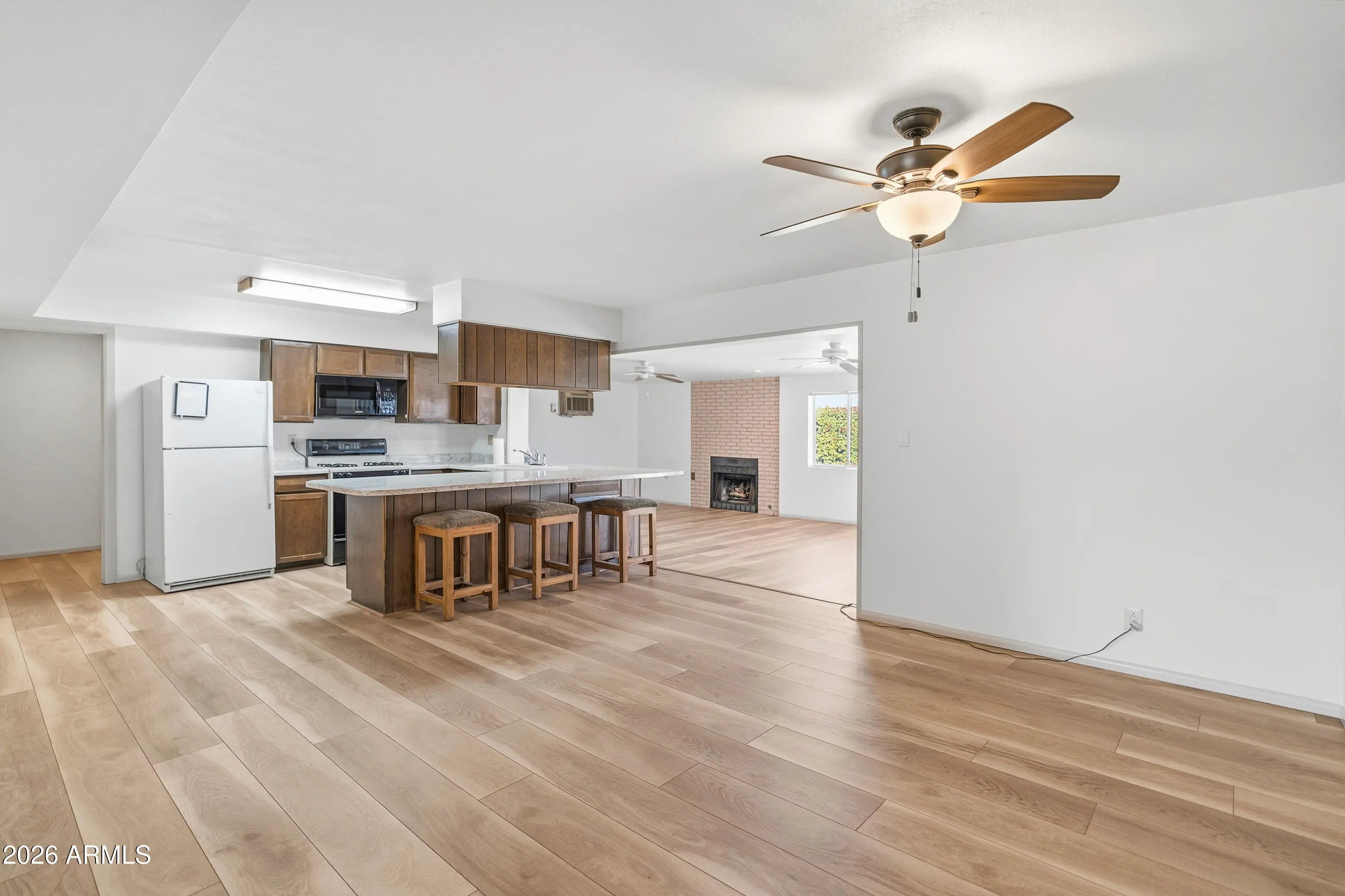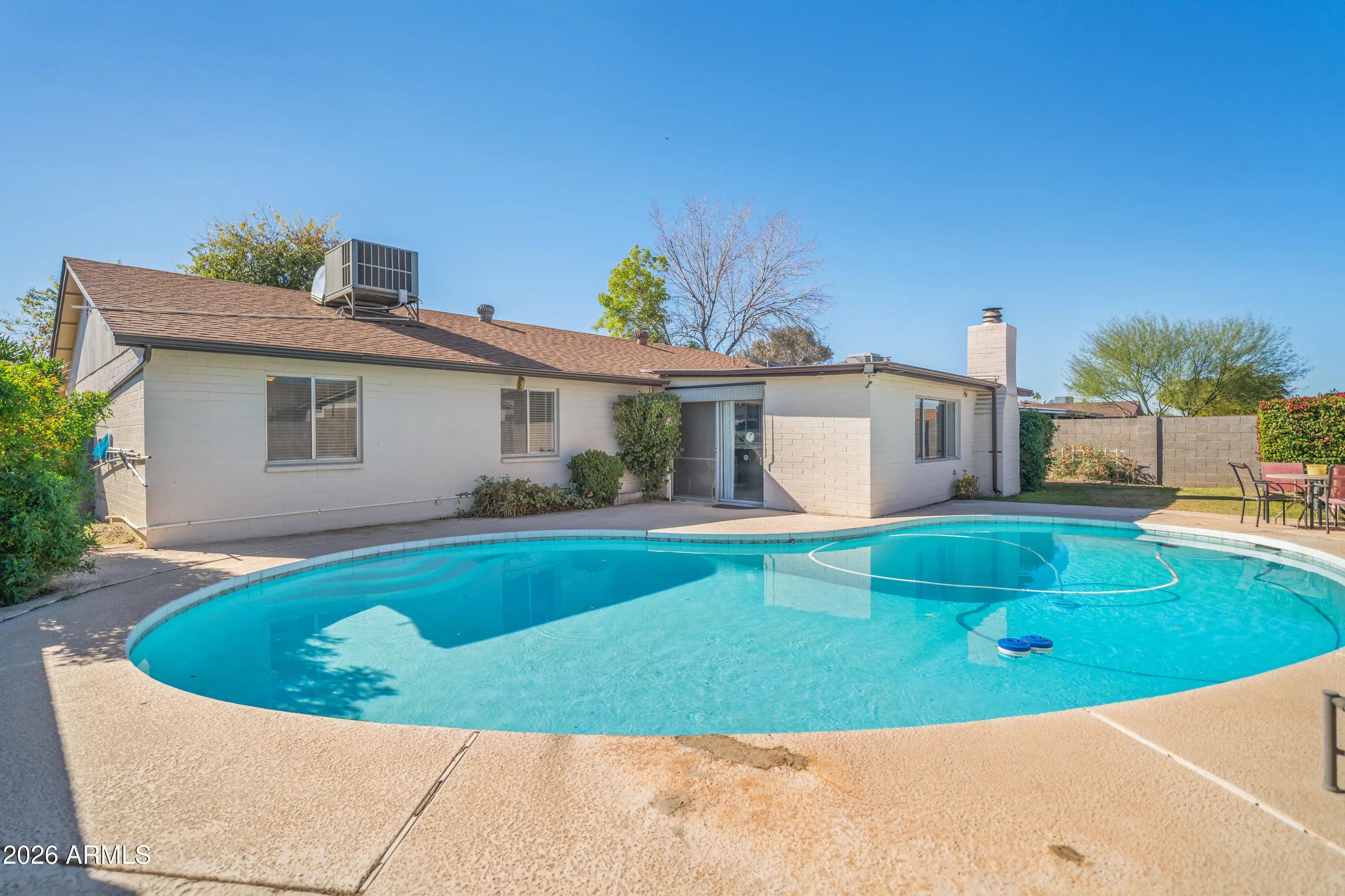 This charming classic Arizona ranch home blends timeless character with fresh updates. The open floor plan is enhanced by new flooring and a freshly painted interior, creating a bright and inviting living space. Exposed warm wood beams add rich character to the living room, while the family room flows seamlessly into the kitchen which features a large pantry and opens to a cozy fireplace—perfect for cool desert evenings. The home also includes a indoor laundry. Step outside to enjoy your own backyard retreat with a sparkling pool and a lush green lawn, ideal for relaxing, entertaining, or enjoying Arizona's beautiful weather year-round. A wonderful combination of comfort, charm, and indoor-outdoor living—this home is ready to be enjoyed.