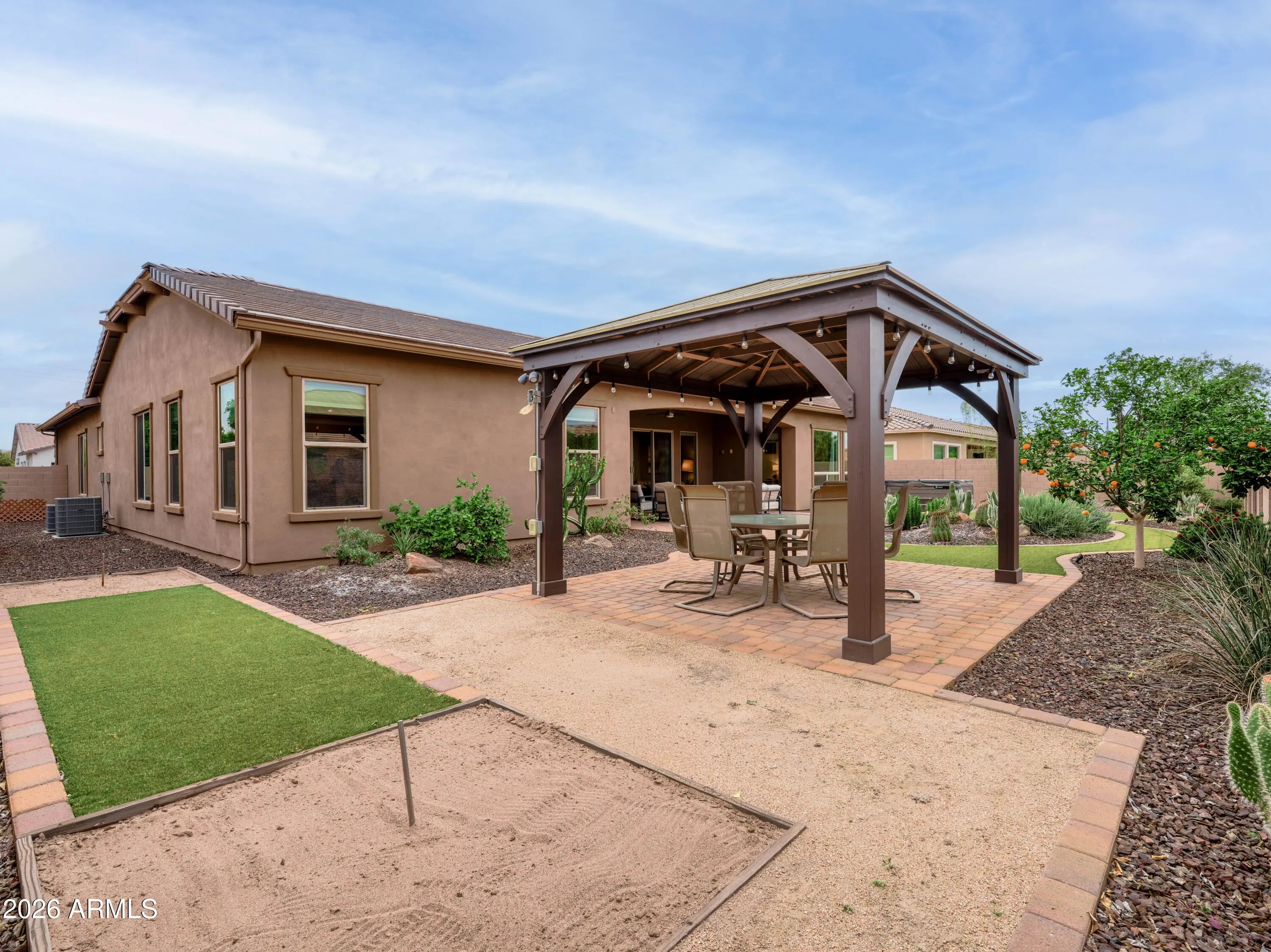 SO CLEAN! IMMACULATELY MAINTAINED -PRIDE OF OWNERSHIP one-story home in coveted Gilbert neighborhood of Layton Lakes with four bedrooms, den, bonus room, 3 car garage, and utility gate, this home has room for all the things & everyone in your life and is move-in ready! Be wowed from the moment you walk through the courtyard and into your front door! You are greeted with tall ceilings, gorgeous engineered hardwood flooring throughout all the main living areas, and upgraded tile flooring & showers in the bathrooms! Beyond the extended sliding glass doors, you are greeted with a spacious paver patio, lighted gazebo, turf, horseshoe pit, and heated and cooled spa perfect for hosting & year-round enjoyment! With new HVAC system installed in 2025 & fresh exterior paint this home is PERFECT!!