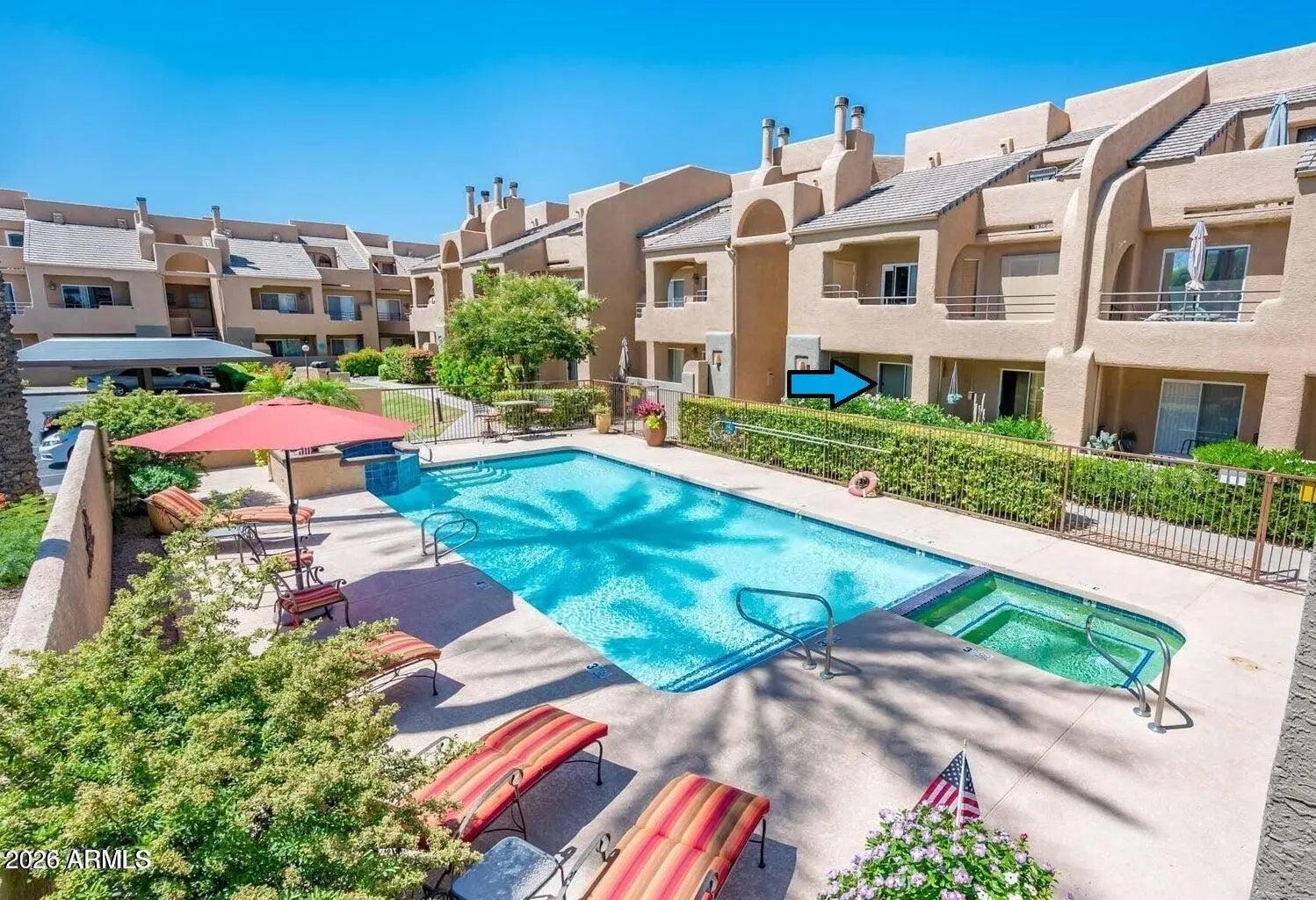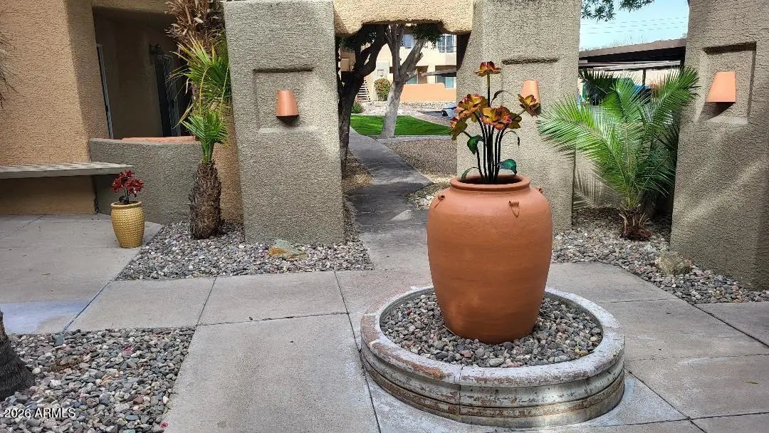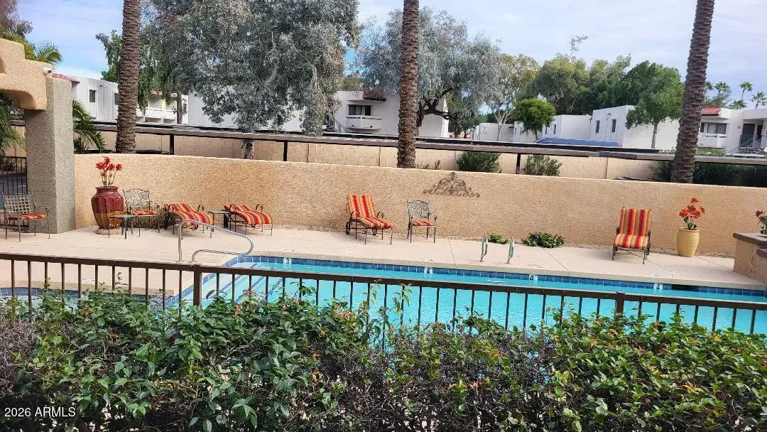 Luxury living at its best. Discover this updated, ground-floor, one-bedroom condo located in the exclusive gated community of Rancho Mirada. Perhaps the best location in the complex directly adjacent to the quiet refreshing pool and heated spa and just seconds away from the community work-out room. You'll feel like you are at a resort. This unit has brand new (never lived on) laminate flooring throughout and a brand new (never used) four-piece, Whirlpool appliance package. The living room exudes warmth with a cozy wood-burning fireplace, built-in shelving and easy access to the patio. The large bedroom features a nook for a desk, a walk-in closet and access to the patio. Private interior laundry and there are no stairs or steps in this unit. HOA fee is a low $198 per month and includes water, sewer, trash, insurance, roofs, streets and common areas. A new roof was recently installed and there are no special assessments pending. Ideal opportunity for first-time buyers, retirees looking downsize, or investors! The location is perfect with easy access to freeways, the airport, areas such as Desert Ridge, Kierland, entertainment and shopping and the Mayo Clinic. Rancho Mirada is a very quiet, hidden gem. Don't miss this opportunity. Owner has already purchased indoor / outdoor carpeting for the patio. It is currently on back order and should be installed by approximately Feb 17. Please do your best to use your imagination until then. Thanks.