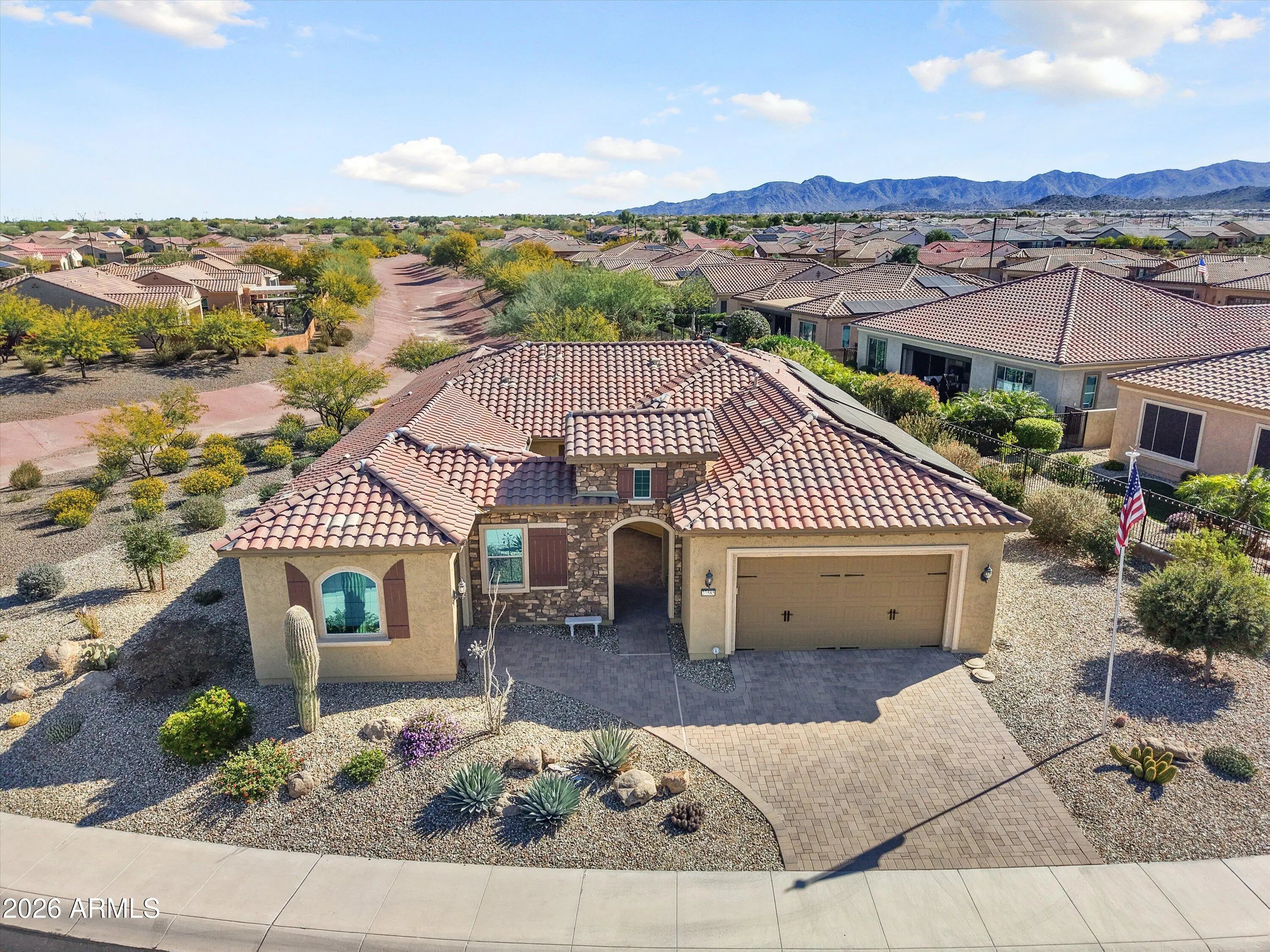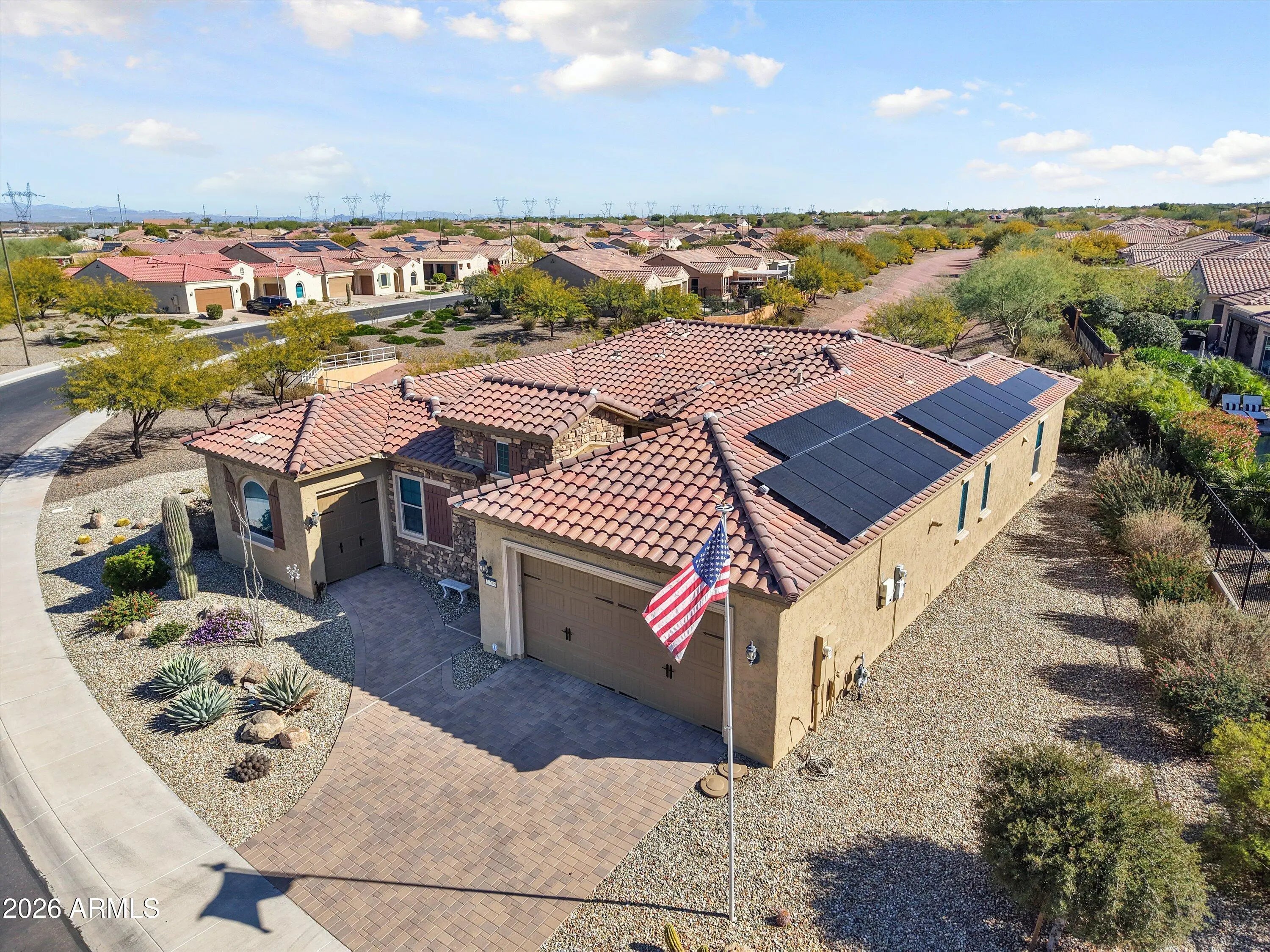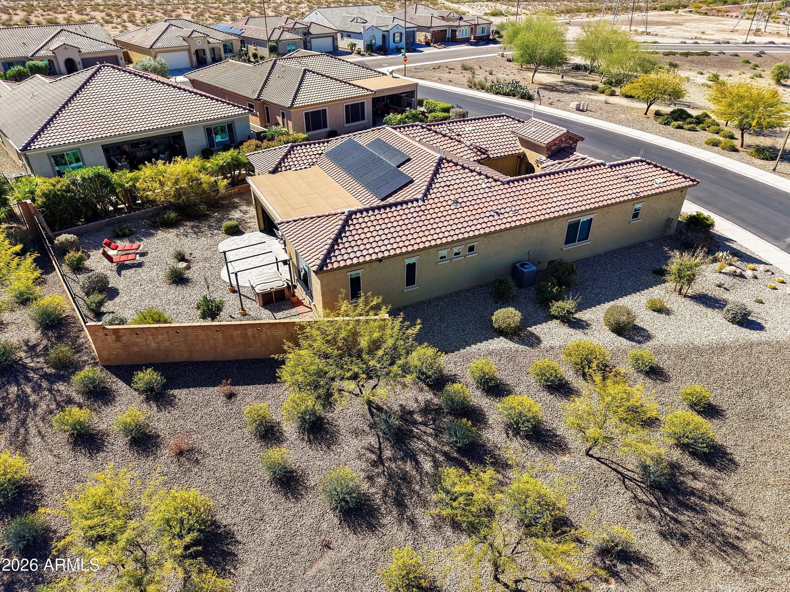 THIS STELLAR JOURNEY MODEL WITH A 2.25% ASSUMABLE VA LOAN, OWNED SOLAR, 4 FT EXTENDED GARAGE AND SITUATED ON A PREMIUM VIEW LOT IS A MUST SEE! Enter this open concept, split floor plan w/contemporary flooring, lighting & window treatments throughout. The spacious living area w/media wall offers plenty of room for dining & entertainment. A chef's kitchen w/upgraded cabinets, backsplash, center island w/pendant lights, gas cook top, & butler's pantry w/boot bench. The extended master suite offers a private patio door & bath w/tile surround shower & large walk-in closet. 2 flex rooms for lounge, office, or hobbies. The 2nd bedroom is complete w/ bath & separate entrance. Relax on your patio w/remote sunshade & misters overlooking the backyard w/spa, ramada & view of the desert landscape.