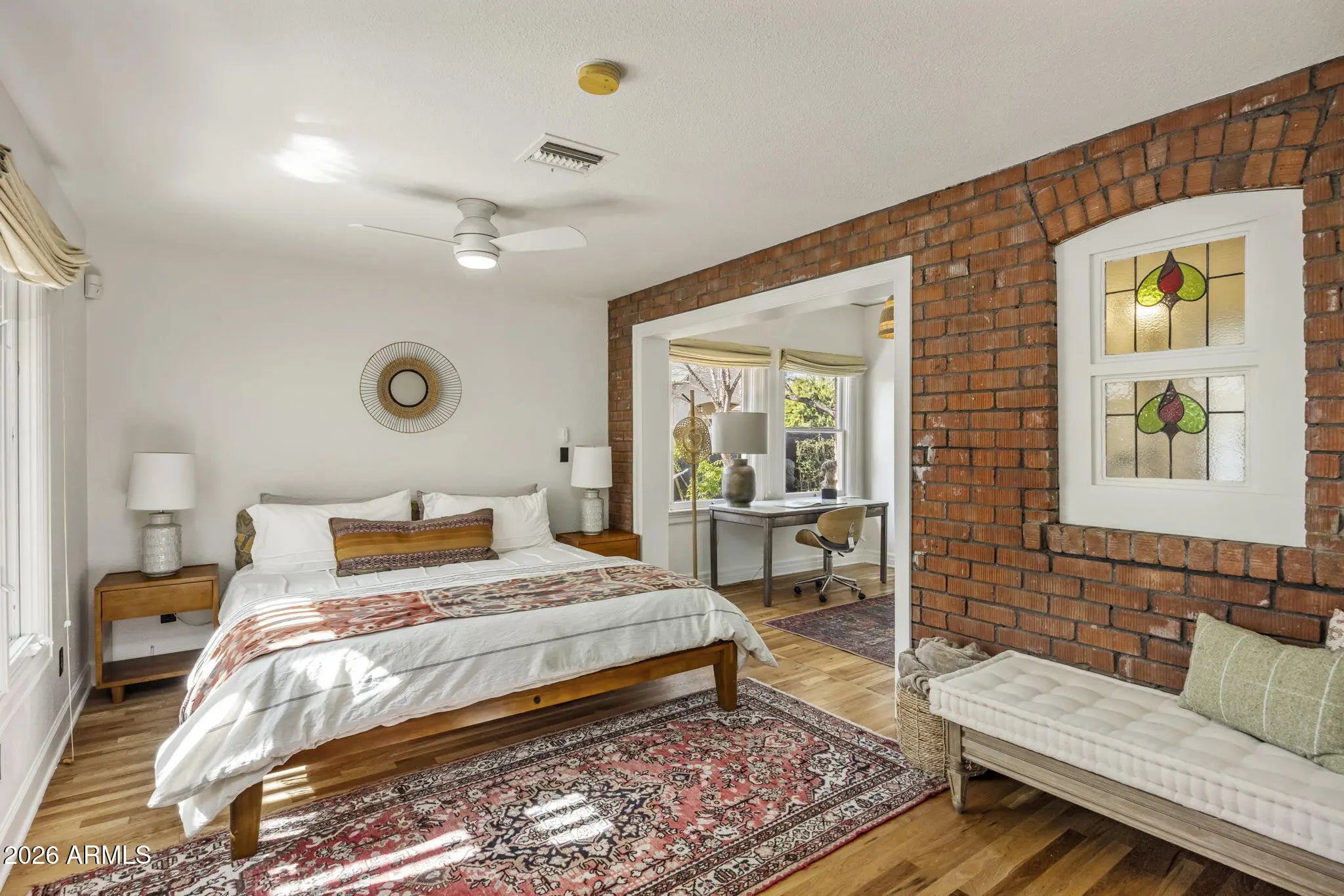 This refreshed 2 bedroom/1 bath red brick Willo bungalow with separate 1 bedroom/1 bath CASITA blends timeless character with thoughtful updates and flexible living, wrapped in inviting outdoor spaces. A grassy front yard with a pavered walkway creates a warm first impression, while inside the main home original hardwood floors, coved ceilings, and vintage windows set a welcoming tone around a cozy fireplace. The light, bright kitchen features a large walk-in pantry for everyday function. The owner's suite includes a flexible bonus room and walk-in closet, and the bathroom showcases an iconic clawfoot tub which honors the home's historic roots. A separate 1 bdrm open concept studio provides add'l +/- 260 SF with a 3/4 bath, closet, and space for a kitchenette, ideal for multigenerational living, guests, or potential rental use. The backyard is designed for both relaxation and entertaining, featuring turf, mature trees including bountiful citrus, and a curated mix of desert plantings that provide shade, texture, and privacy. A covered back porch with trellis offers the perfect spot to sit outdoors and enjoy the expansive yard year-round. Additional highlights include a dedicated laundry room, oversized one car garage, dual street access from Central AND 3rd Avenue, plentiful parking with 2 separate driveways. Located near light rail, downtown dining, and cultural attractions, this special Willo property delivers character, versatility, and lifestyle convenience. Buyer to verify all facts, figures, measurements.