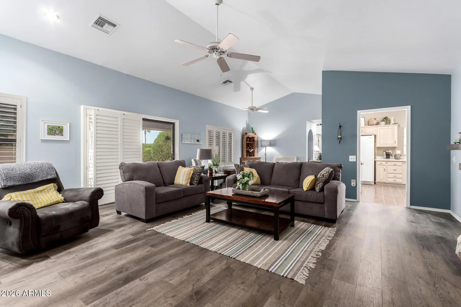 This pristinely maintained home welcomes you with a charming front courtyard and a bright, open floor plan accented by soft blue designer paint tones. The living and dining areas feature beautiful flooring installed just one year ago, adding a fresh, modern feel to the main living spaces. The updated kitchen shines with gorgeous countertops and a layout that flows seamlessly into the living areas—perfect for both everyday living and entertaining. Step outside to a lovely backyard designed with low-maintenance desert landscaping, offering a peaceful retreat with minimal upkeep. Located in Sun City West, one of the Valley's premier 55+ communities, residents enjoy an exceptional lifestyle with 9 golf courses, 4 major recreation centers, and an incredible variety of clubs, classes, and hobby groups. This home combines comfort, style, and access to world-class amenities in a community that truly has it all.
