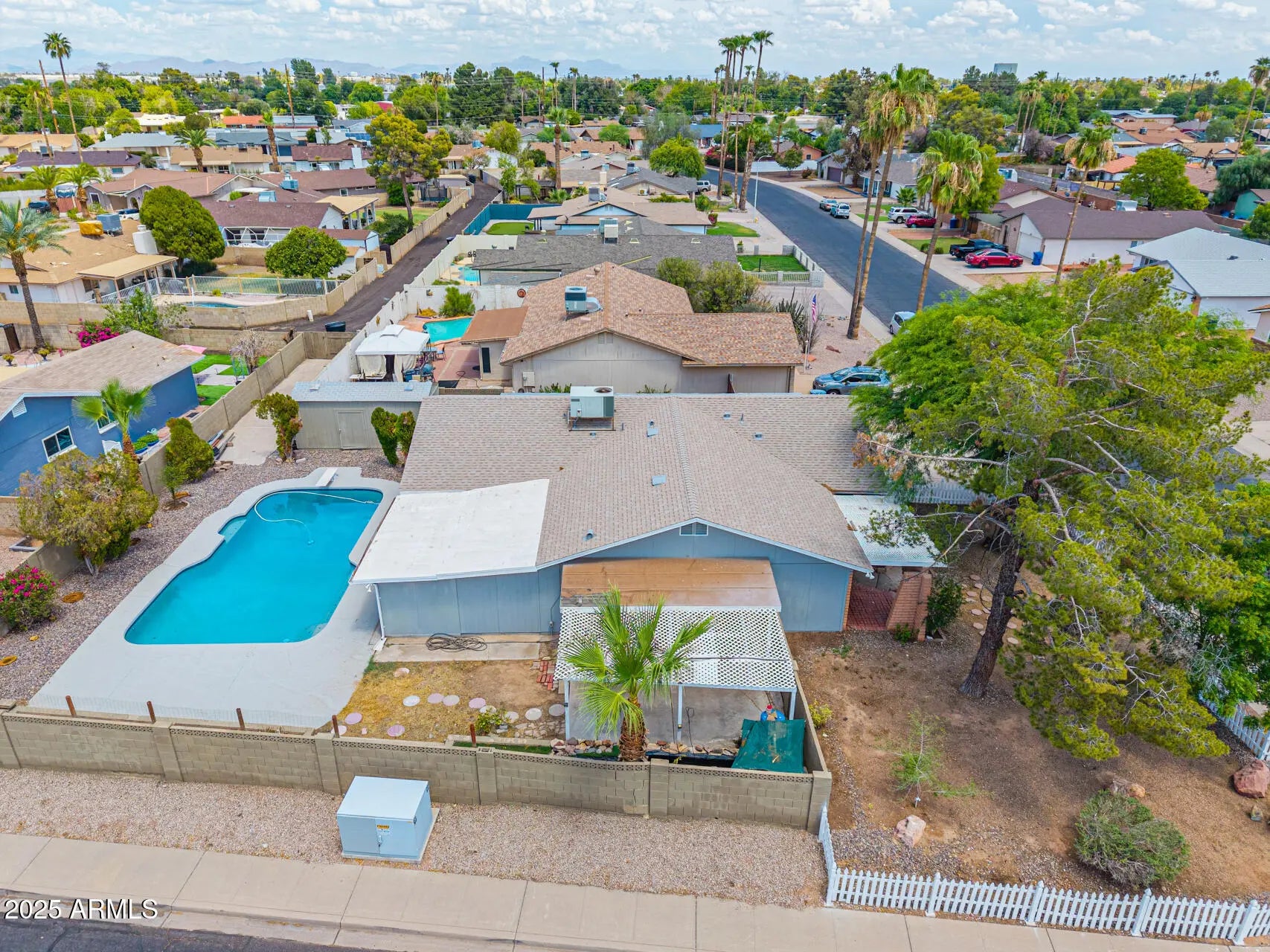 Single-story corner lot home with no HOA, diving pool, RV gate, and extended RV parking. Open great room layout with wood-look flooring and sliding door to backyard. Kitchen with large island, stone counters, wood cabinetry, stainless vent hood and eat-in dining area. Updated bath with tiled walk-in shower and mosaic accent. Backyard features diving pool, concrete pool deck, desert landscaping, and detached storage shed. Long driveway and side yard RV access provide flexible parking and storage. Convenient Tempe location near ASU, Tempe Marketplace, Loop 101 and Loop 202 with access to shopping, dining and commuter routes.