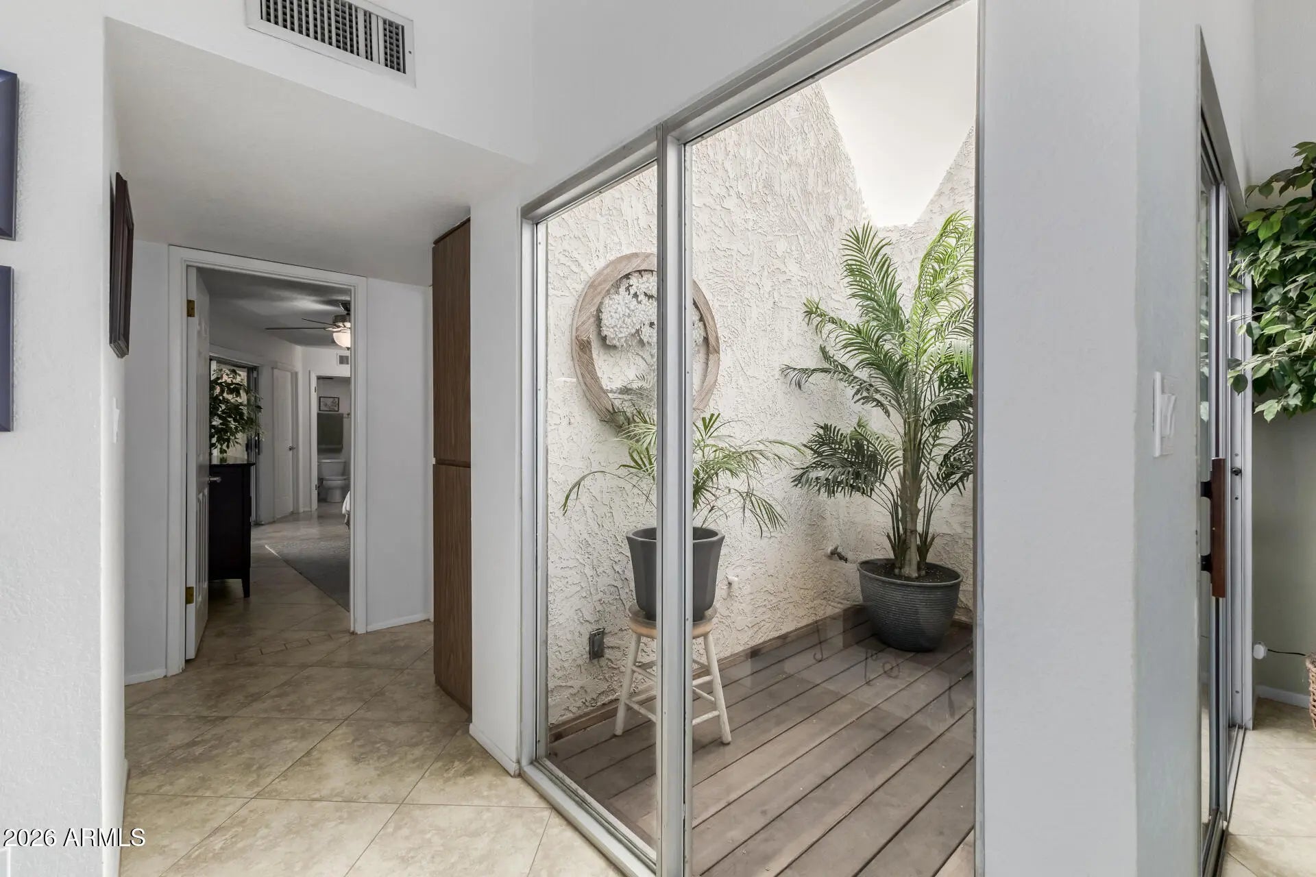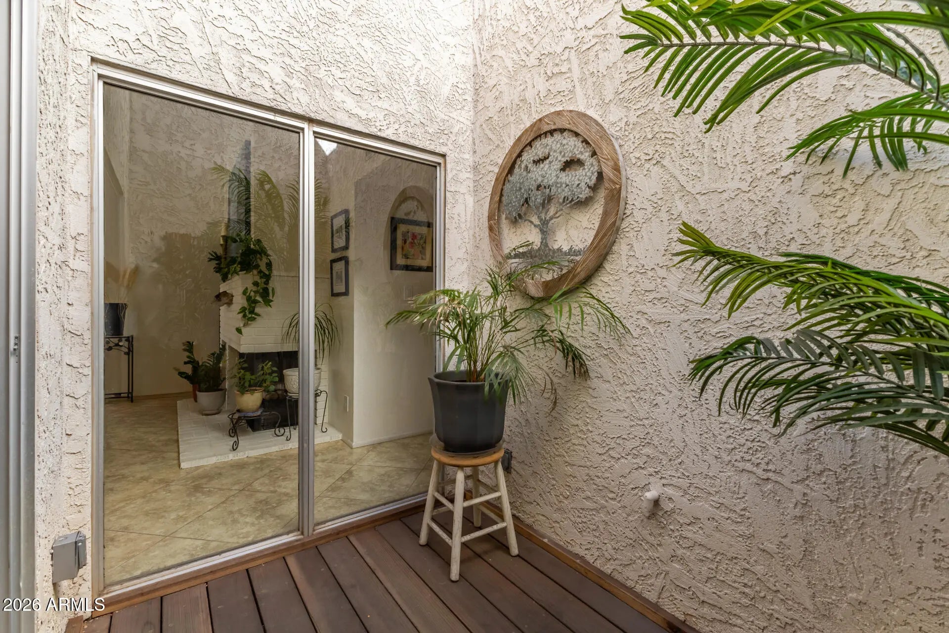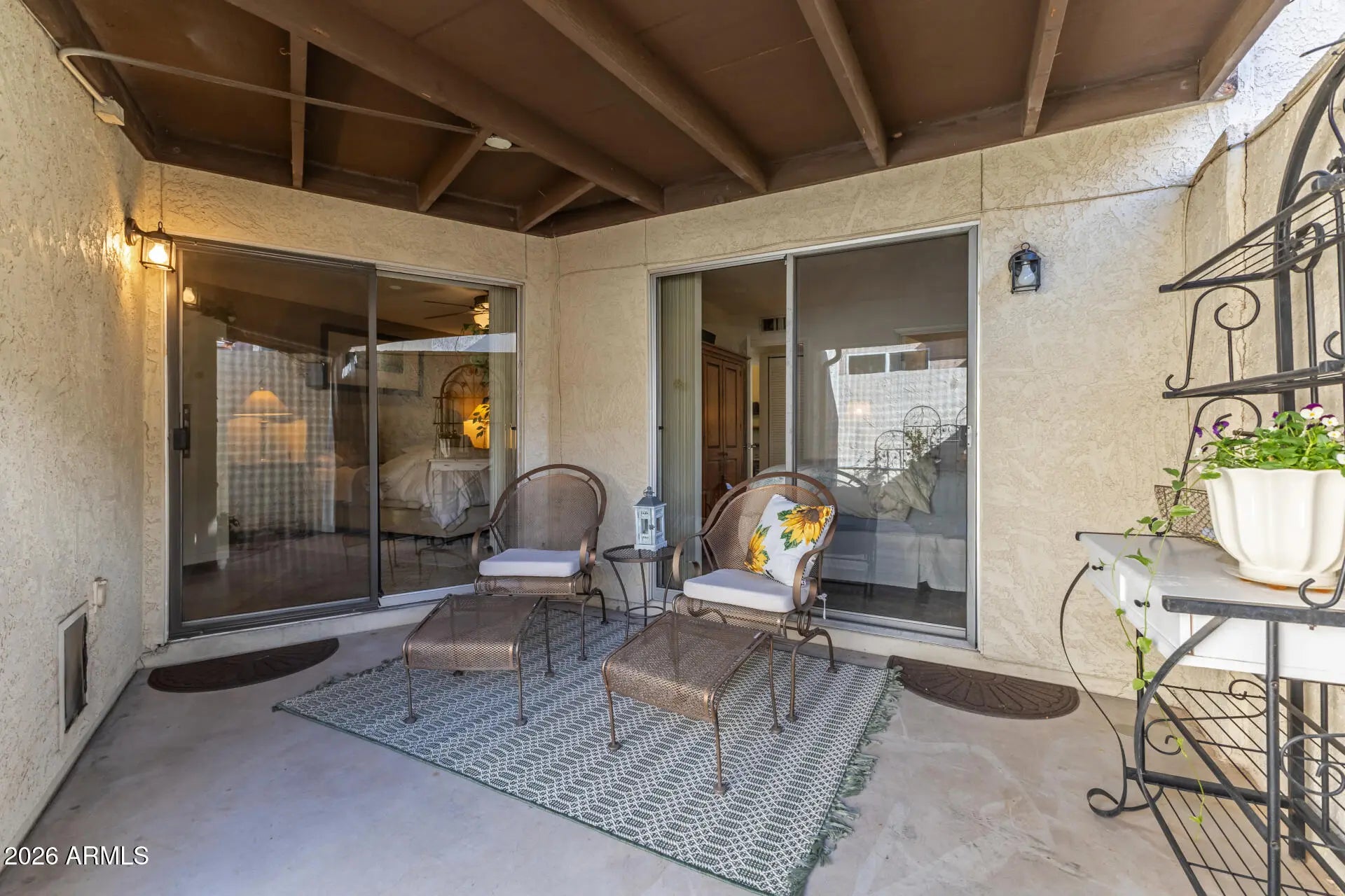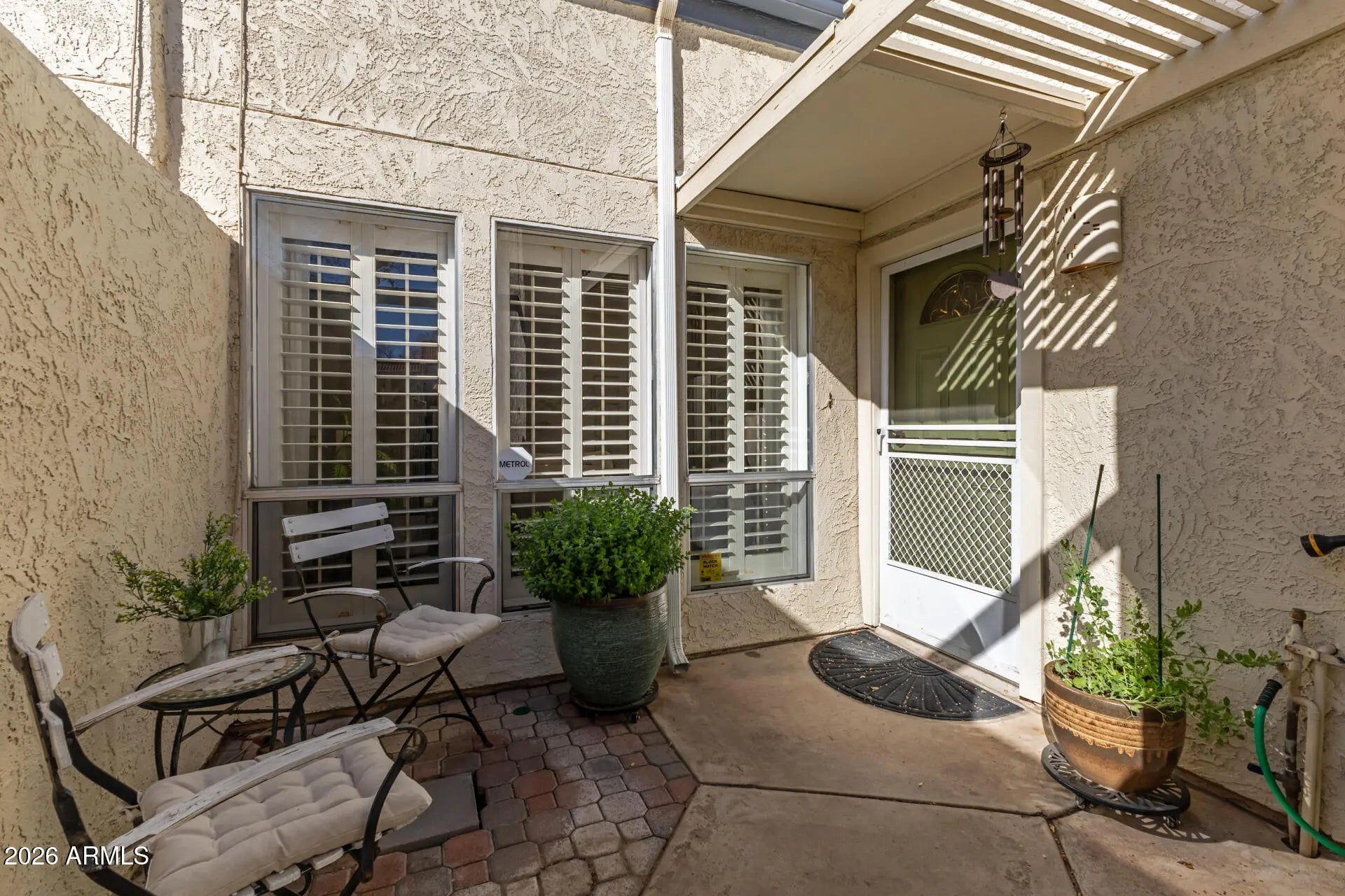 Welcome to this gated single-story townhouse that blends timeless character with comfortable living. This 2 bedroom, 2 bathroom home features vaulted ceilings with exposed wood beams, creating an open and airy feel throughout the main living space. A classic brick fireplace anchors the living room, perfect for cozy evenings at home. At the heart of the property is a private atrium, bringing in natural light and a unique indoor-outdoor ambiance. The spacious primary suite and secondary bedroom offer flexibility for guests, a home office, or personal retreat. Step outside to your private back patio, ideal for relaxing or entertaining. Additional highlights include a garage with built-in cabinets, providing excellent extra storage. Under 5 miles to Grand Canyon University