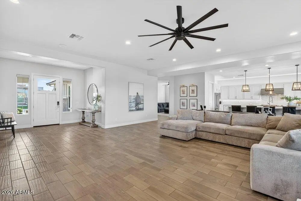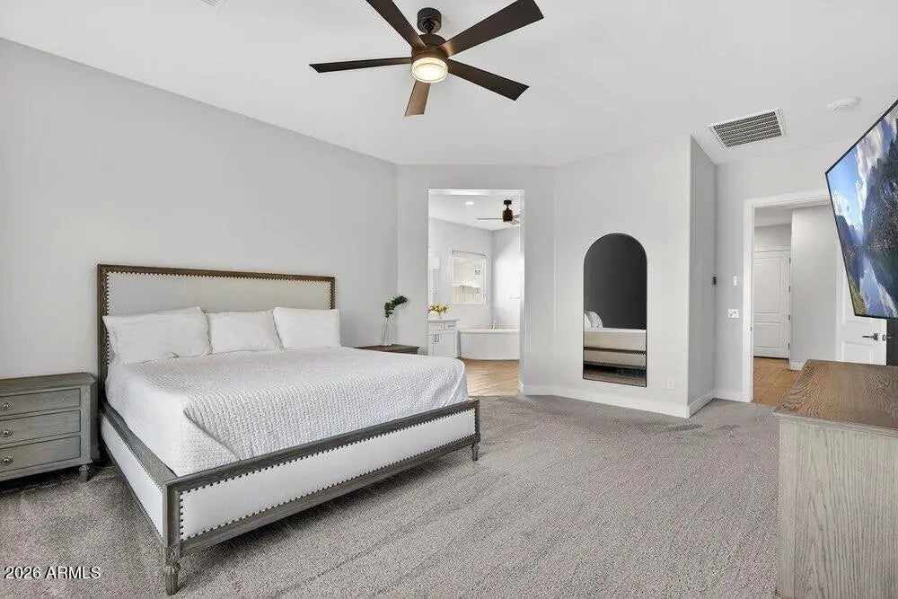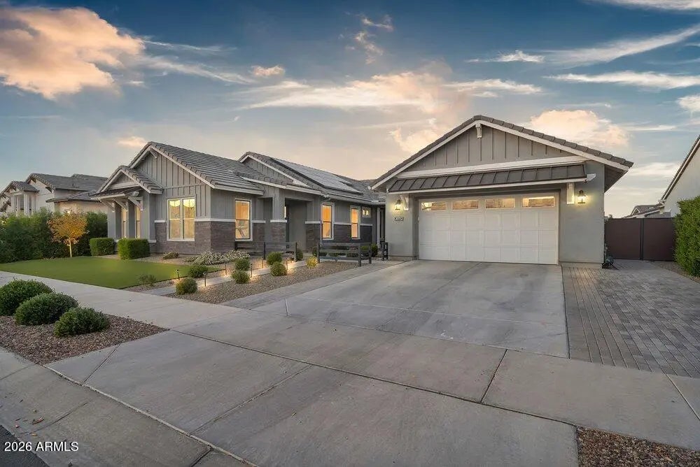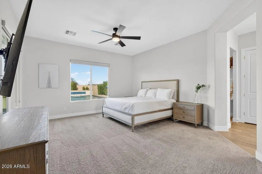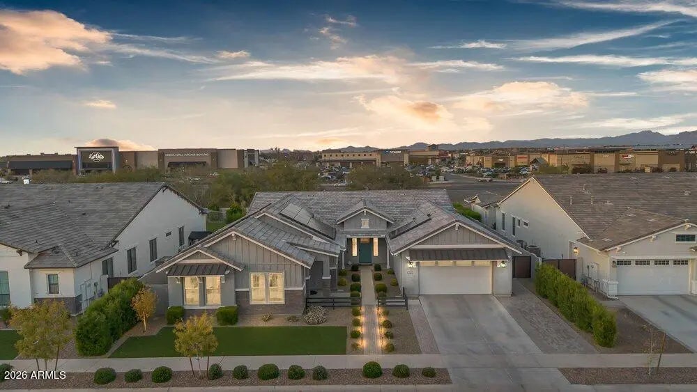 Located within the luxury estates of the gated Bridle Ranch community, this exceptional residence offers refined living in the heart of Queen Creek, just minutes from the area's most popular dining, shopping, and entertainment destinations. Built by Toll Brothers, the highly sought after Costellana floorplan is known for its wide open, functional design and seamless flow. The main living space is bright and airy, enhanced by custom built ins and expansive windows that create an inviting atmosphere throughout the home. The expansive kitchen serves as the heart of the home and features a waterfall edge quartz island, custom corner cabinetry, a 48 inch commercial style range with griddle, matching hood, double ovens, and thoughtfully curated finishes ideal for both everyday living and entertaining. Electrical shades throughout add modern convenience and comfort. The primary suite is thoughtfully designed with a split floorplan, offering privacy and a peaceful retreat. Four bedrooms plus a functional flex space provide exceptional versatility for a home office, gym, or additional living area to suit your lifestyle. A standout feature of this estate is the attached casita with a private entrance, offering true flexibility and independence. The casita includes tile flooring, a living area, a kitchenette with mini fridge, canned lighting, ceiling fan, ensuite bathroom, and dedicated central heating and cooling. This space is ideal for multigenerational living, extended guests, a private office retreat, or fitness studio. The resort inspired backyard is designed for year round enjoyment and relaxation. This private outdoor space features a gated layout, spa with waterfall, mature landscaping, and low maintenance turf, creating an ideal setting for entertaining or unwinding in comfort and privacy. Adding to the home's appeal is owned solar by Tesla, enhancing energy efficiency and long term savings. This is luxury estate living at its finest, offering privacy, thoughtful design, and an unbeatable location within one of Queen Creek's most prestigious gated communities.