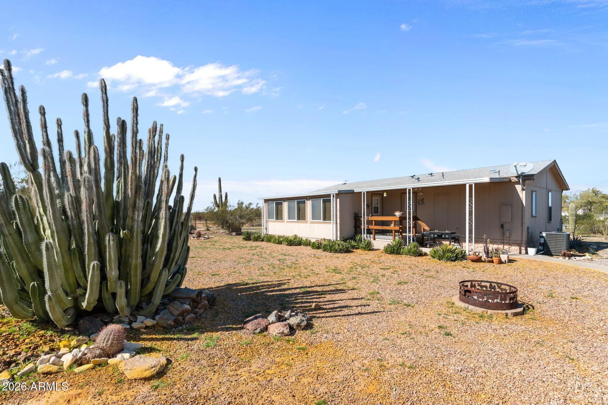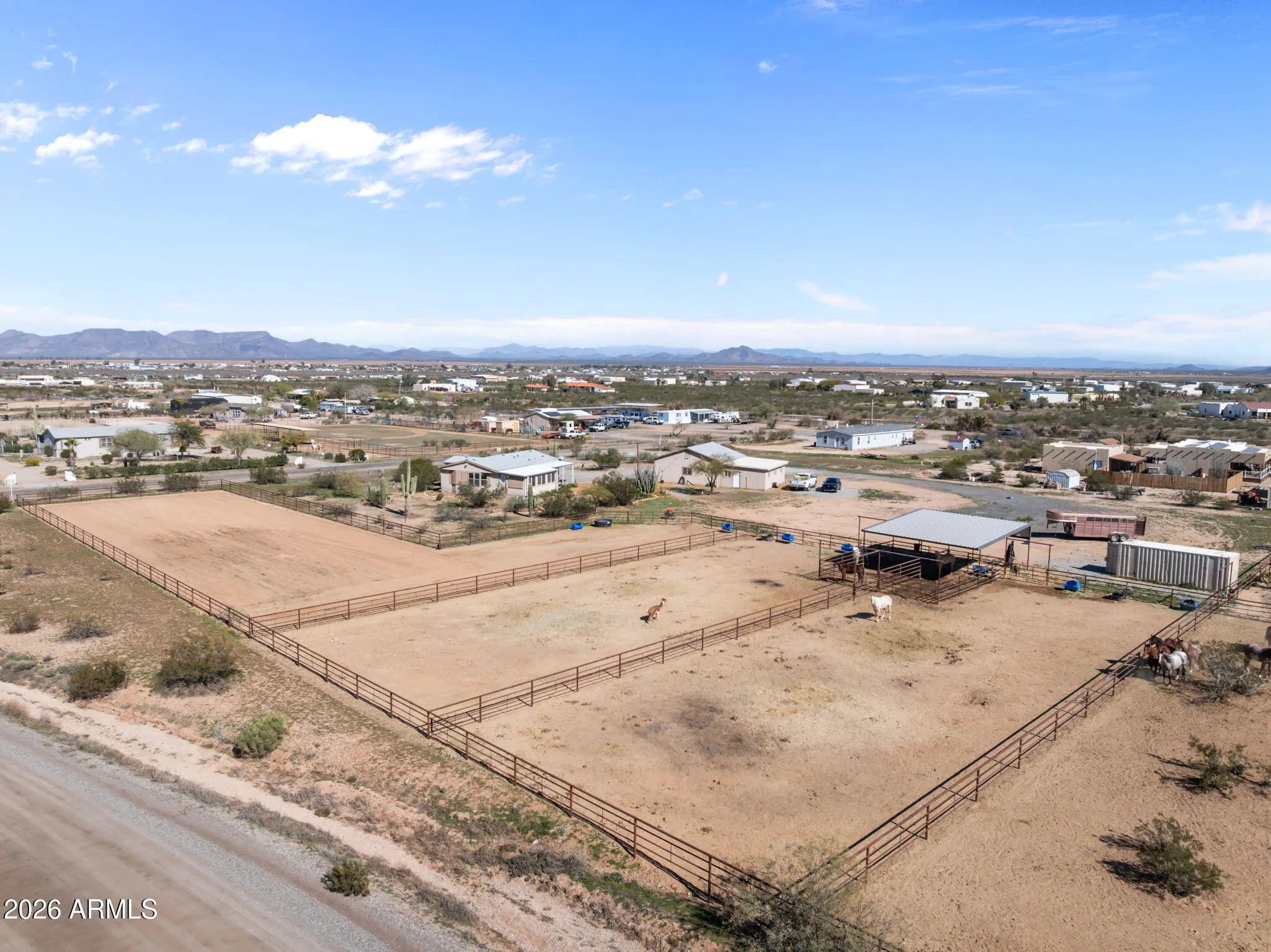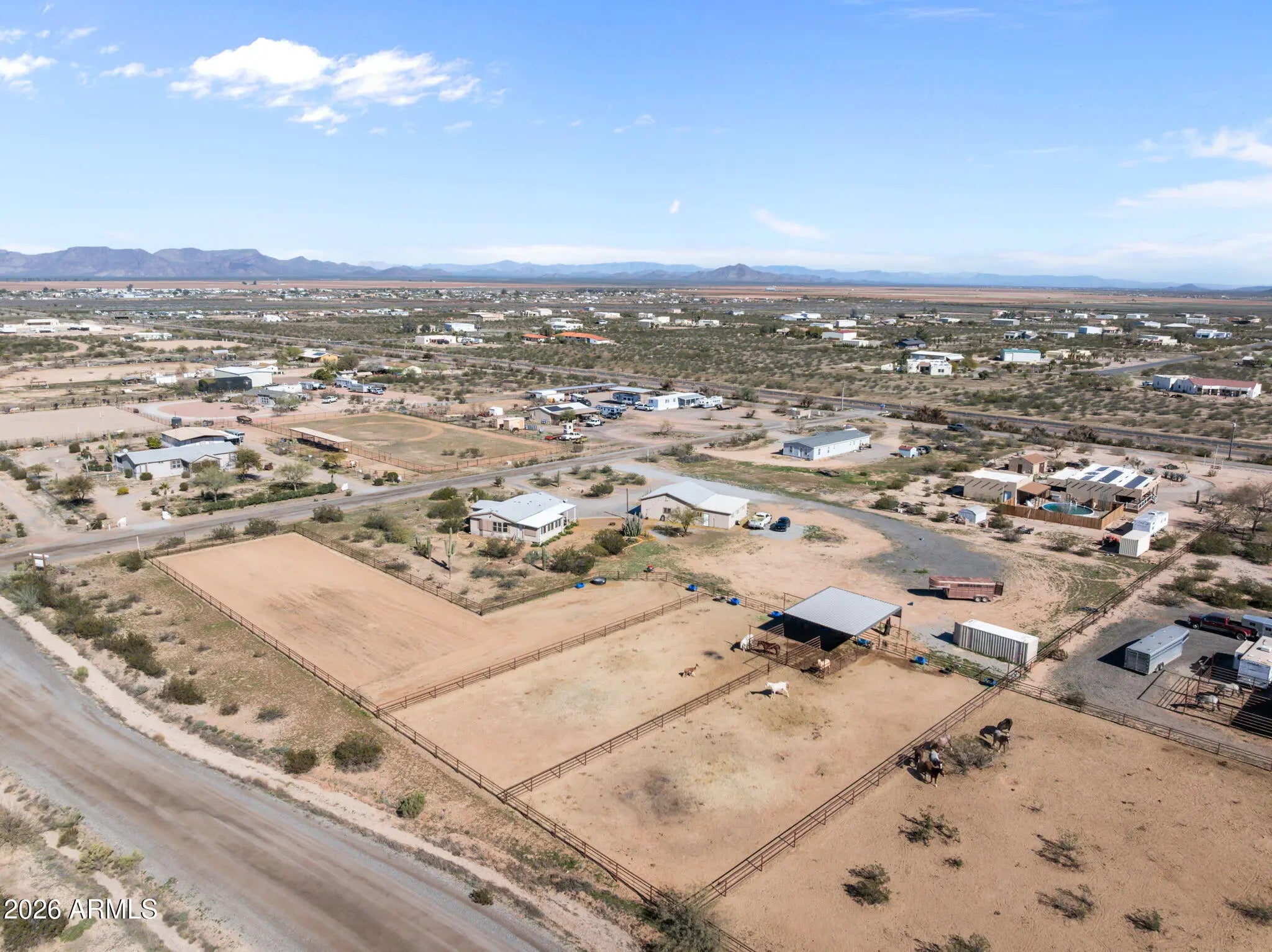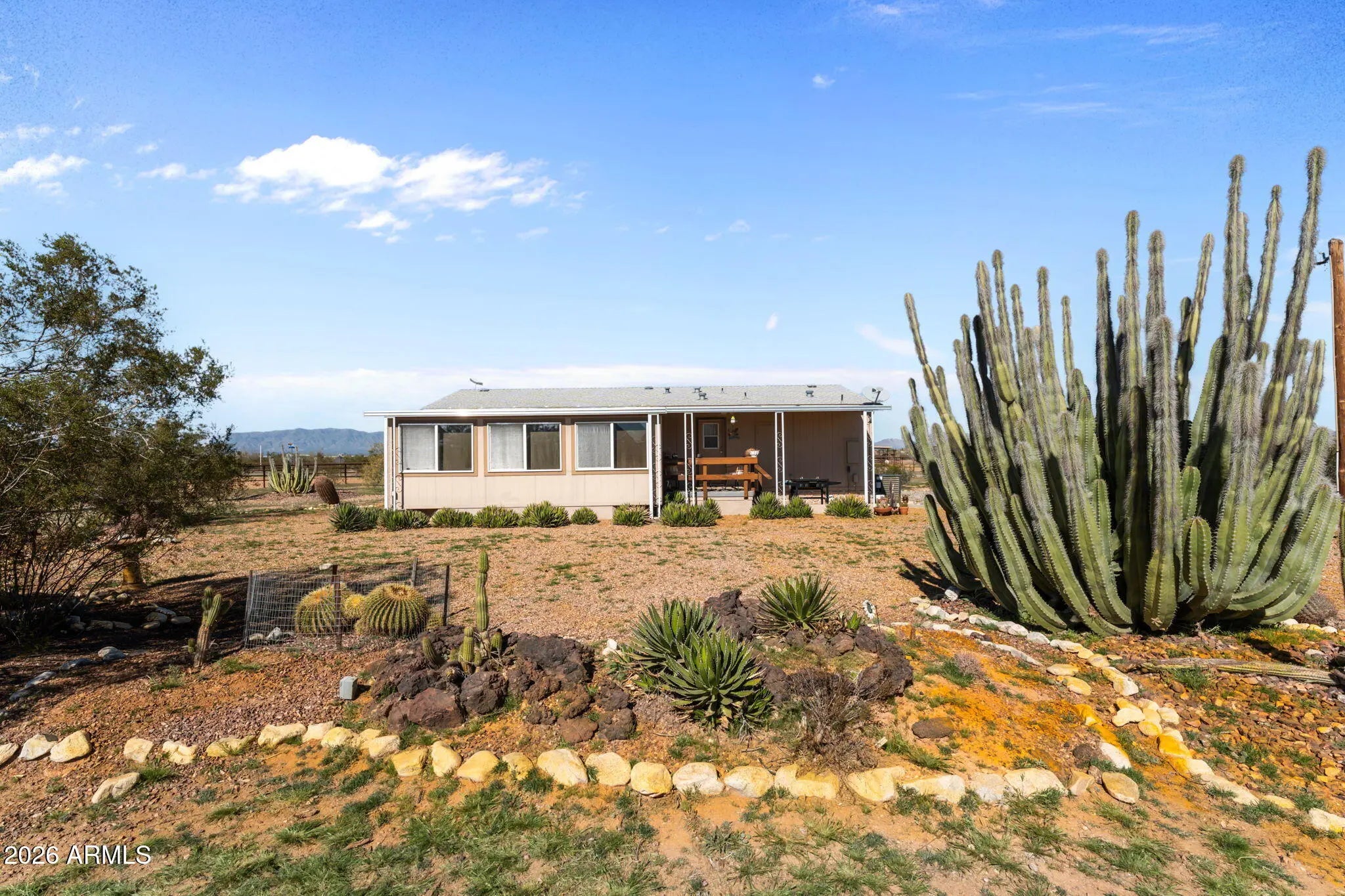 Located in Aguila, this thoughtfully improved 2.5-acre property offers a comfortable home, versatile outbuildings, and a well-designed equestrian setup. The residence features 2bed 2bath w/ remodeled baths & new flooring throughout, along w/ a flexible bedroom or office & a dedicated office addition. A bright sunroom w/ a fireplace & TV creates a welcoming space to relax, while the covered porch provides an inviting area to enjoy the desert setting. Recent improvements throughout enhance both comfort & functionality.The fully insulated detached garage is equipped w/ power & water & is currently set up w/ gym equipment, along with an attached workshop offering potential for a future guest casita.RV amenities include 1 existing hookup w/ room to add up to 3 additional hookups. Ample trailer parking, a circular drive and a sprinkler system serving the landscaped areas.Equestrian improvements are thoughtfully arranged and designed for expansion, featuring a riding arena, three large turnouts, and two covered stalls with automatic waterers and hay storage. The property is plumbed for additional automatic waters and includes a wash rack with tie rings, space for additional pens or a barn, and a Conex container outfitted with saddle and bridle racks.Cute landscaping and functional improvements throughout make this property a versatile and well-rounded opportunity.