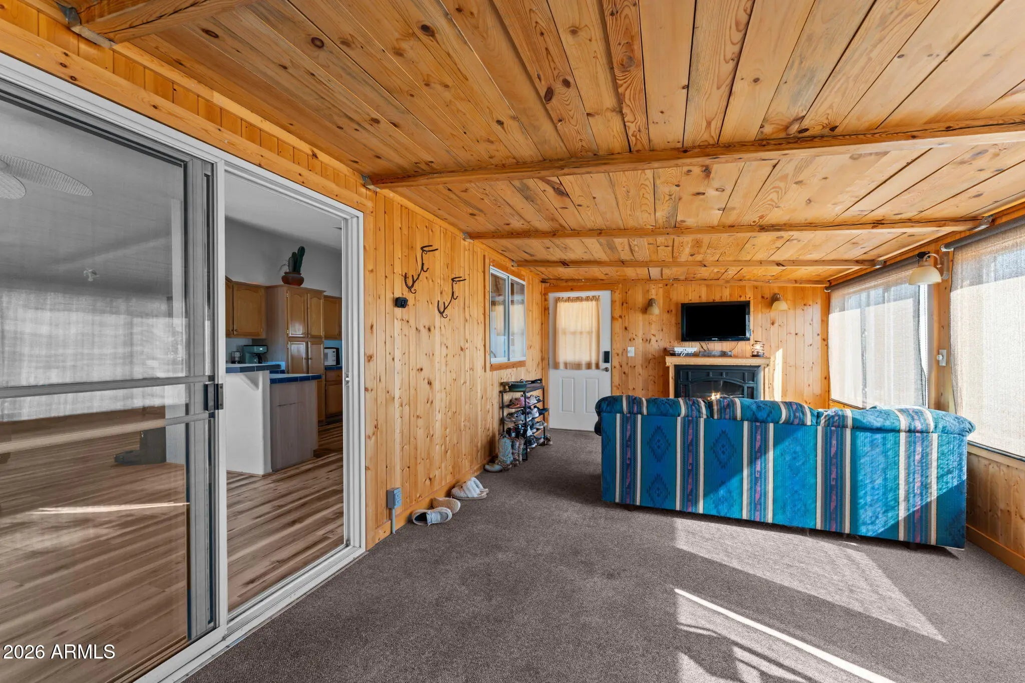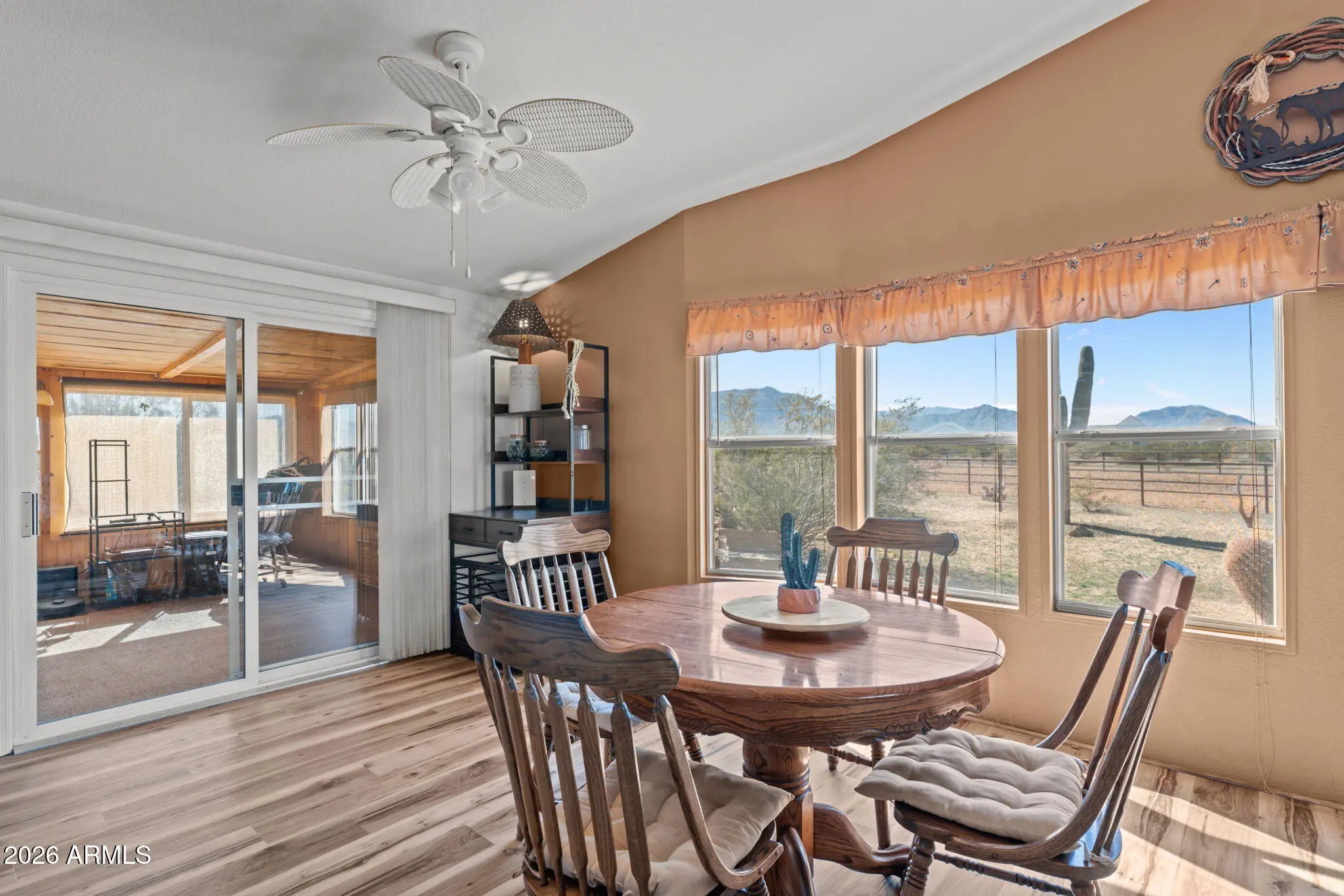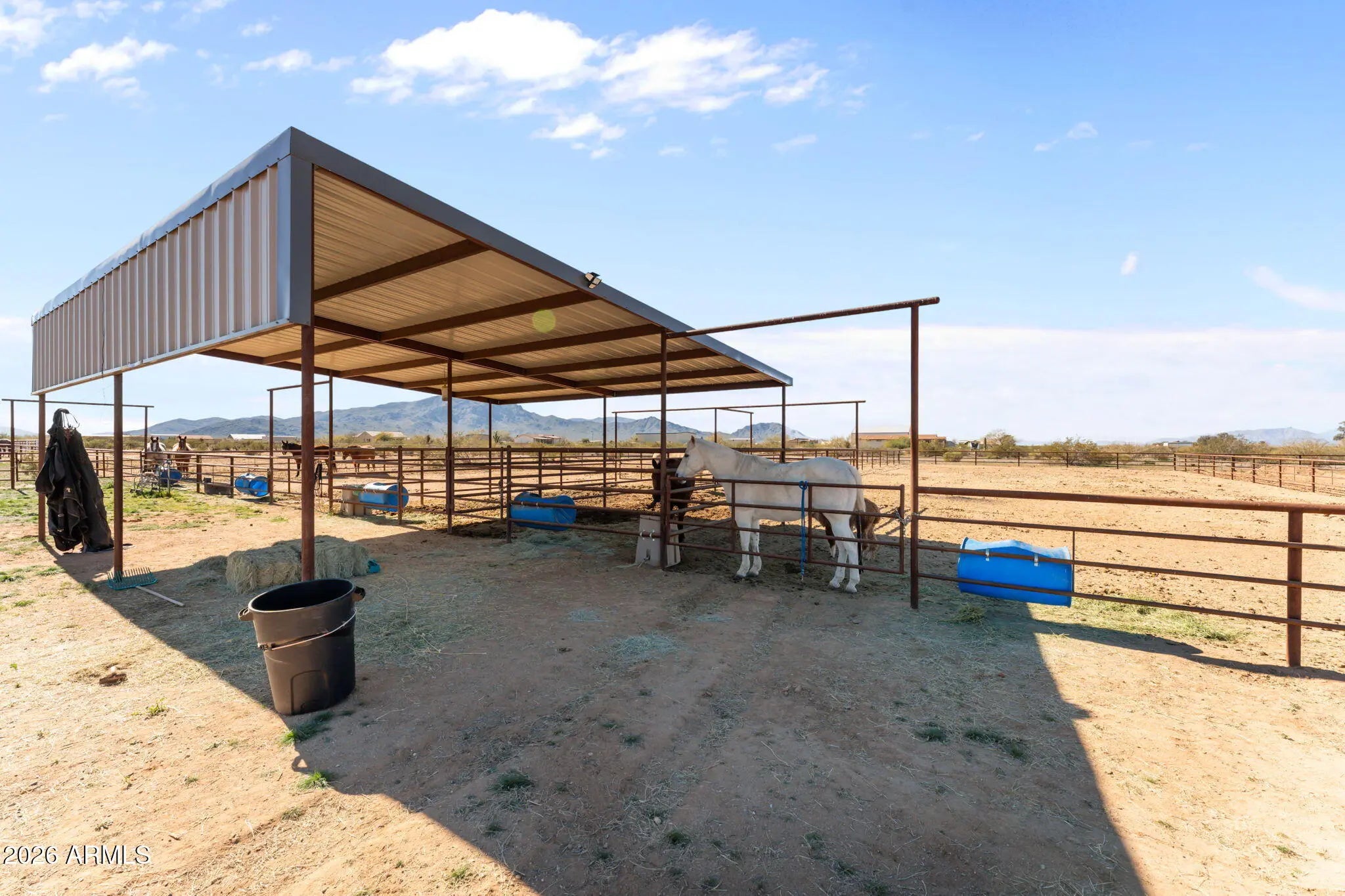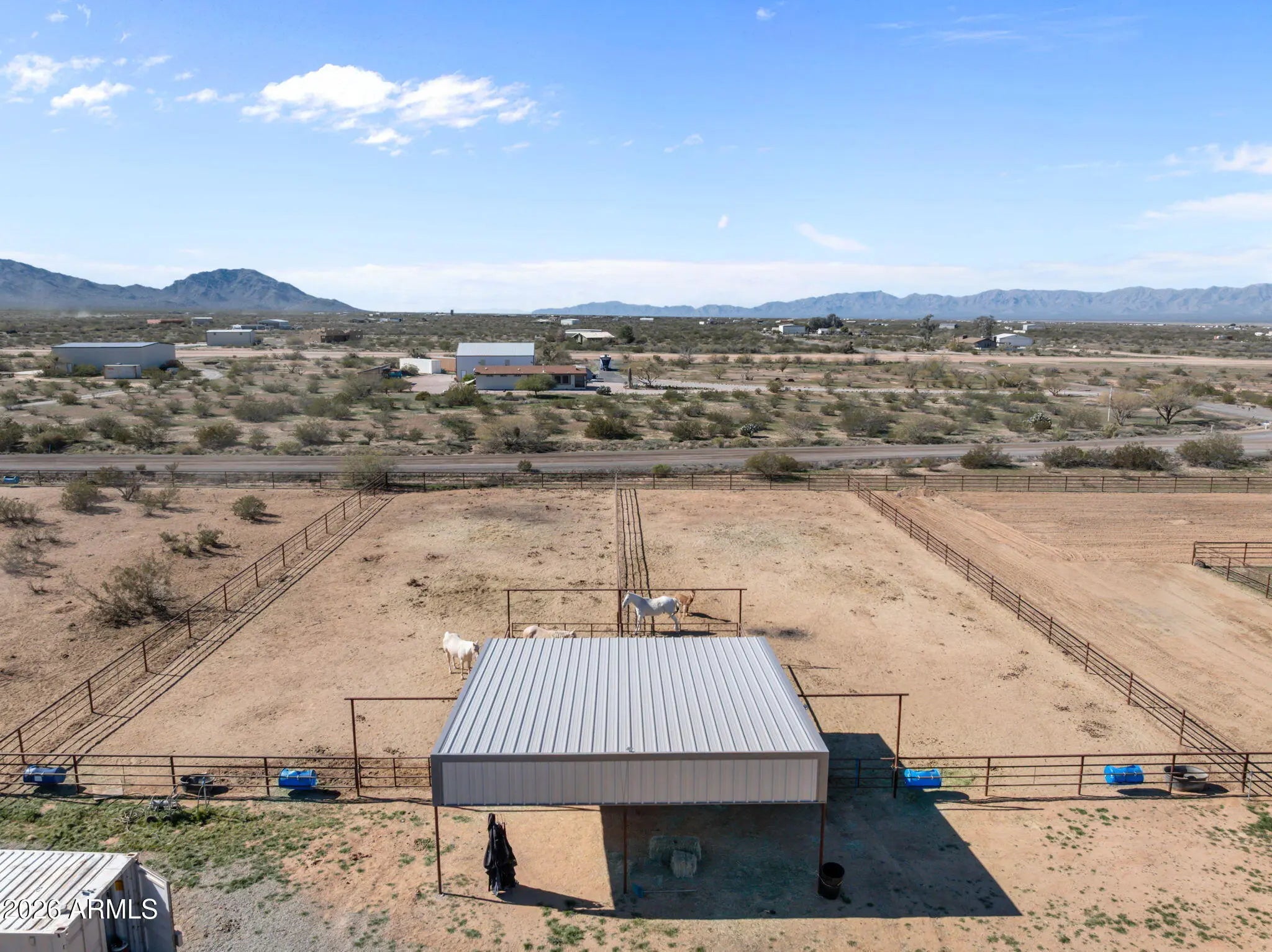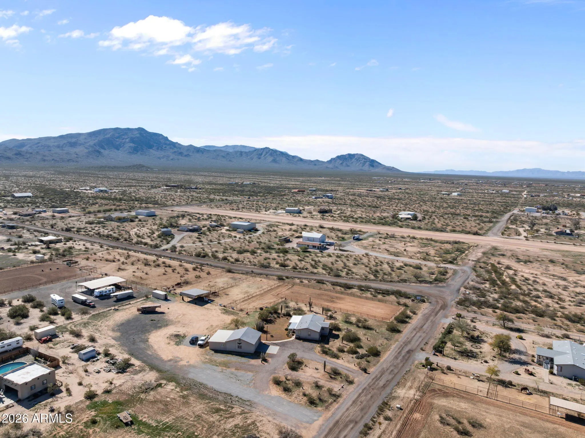 Located in Aguila, this thoughtfully improved 2.5-acre property offers a comfortable home, versatile outbuildings, and a well-designed equestrian setup. The residence features 2bed 2bath w/ remodeled baths & new flooring throughout, along w/ a flexible bedroom or office & a dedicated office addition. A bright sunroom w/ a fireplace & TV creates a welcoming space to relax, while the covered porch provides an inviting area to enjoy the desert setting. Recent improvements throughout enhance both comfort & functionality.The fully insulated detached garage is equipped w/ power & water & is currently set up w/ gym equipment, along with an attached workshop offering potential for a future guest casita.RV amenities include 1 existing hookup w/ room to add up to 3 additional hookups. Ample trailer parking, a circular drive and a sprinkler system serving the landscaped areas.Equestrian improvements are thoughtfully arranged and designed for expansion, featuring a riding arena, three large turnouts, and two covered stalls with automatic waterers and hay storage. The property is plumbed for additional automatic waters and includes a wash rack with tie rings, space for additional pens or a barn, and a Conex container outfitted with saddle and bridle racks.Cute landscaping and functional improvements throughout make this property a versatile and well-rounded opportunity.