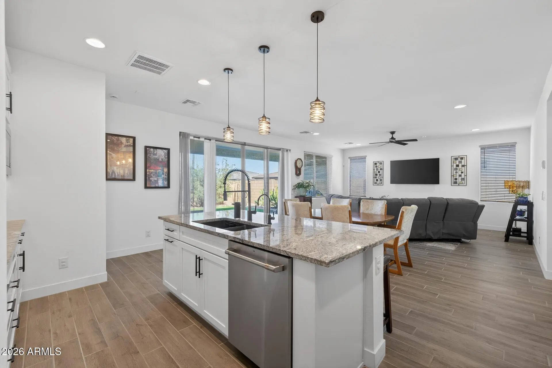 Located in Queen Creek's sought-after 55-plus Ovation at Meridian community, this like-new home blends modern comfort with an easy, low-maintenance lifestyle ideal for active adults. The thoughtfully designed floor plan offers 2 bedrooms plus a den and 2.5 baths in 1811 SqFt, with an open great room layout perfect for entertaining and a split bedroom design that ensures privacy for guests. The gourmet kitchen stands out with Peterson 5-piece 42-inch cabinets, under-cabinet lighting, soft-close drawers, pull-out shelves, a pots and pans drawer, recycle center, upgraded GE appliances including a gas cooktop with double ovens, granite countertops, custom tile backsplash, an island with e-granite sink, motion sensor faucet, breakfast bar, and pendant lighting. Center-meet sliding glass doors open to a full-length covered patio with epoxy flooring, gas stub for a BBQ, and a low-maintenance backyard featuring artificial turf and desert landscaping. The primary suite includes direct access to the laundry room and an en-suite bath with an extended dual-sink vanity with makeup area and an oversized tiled shower with bench seat and glass surround. The guest bedroom also has an en-suite bath. Additional upgrades include 8-foot interior doors, ceiling fans, a Kinetico water softener system, tankless water heater, ADT security system, upgraded plank tile flooring in living areas and baths, plush carpet in bedrooms, an enhanced exterior elevation, and a 2-car garage with shelving and epoxy floors. Ovation at Meridian is a gated 55-plus community offering resort-style amenities designed for an active lifestyle, including a clubhouse and recreation center with a fitness facility, arts and crafts room, lounge areas, billiards room, and outdoor features such as a heated pool and spa, pickleball, tennis and bocce courts, a putting and chipping area, and miles of walking trails throughout the neighborhood.