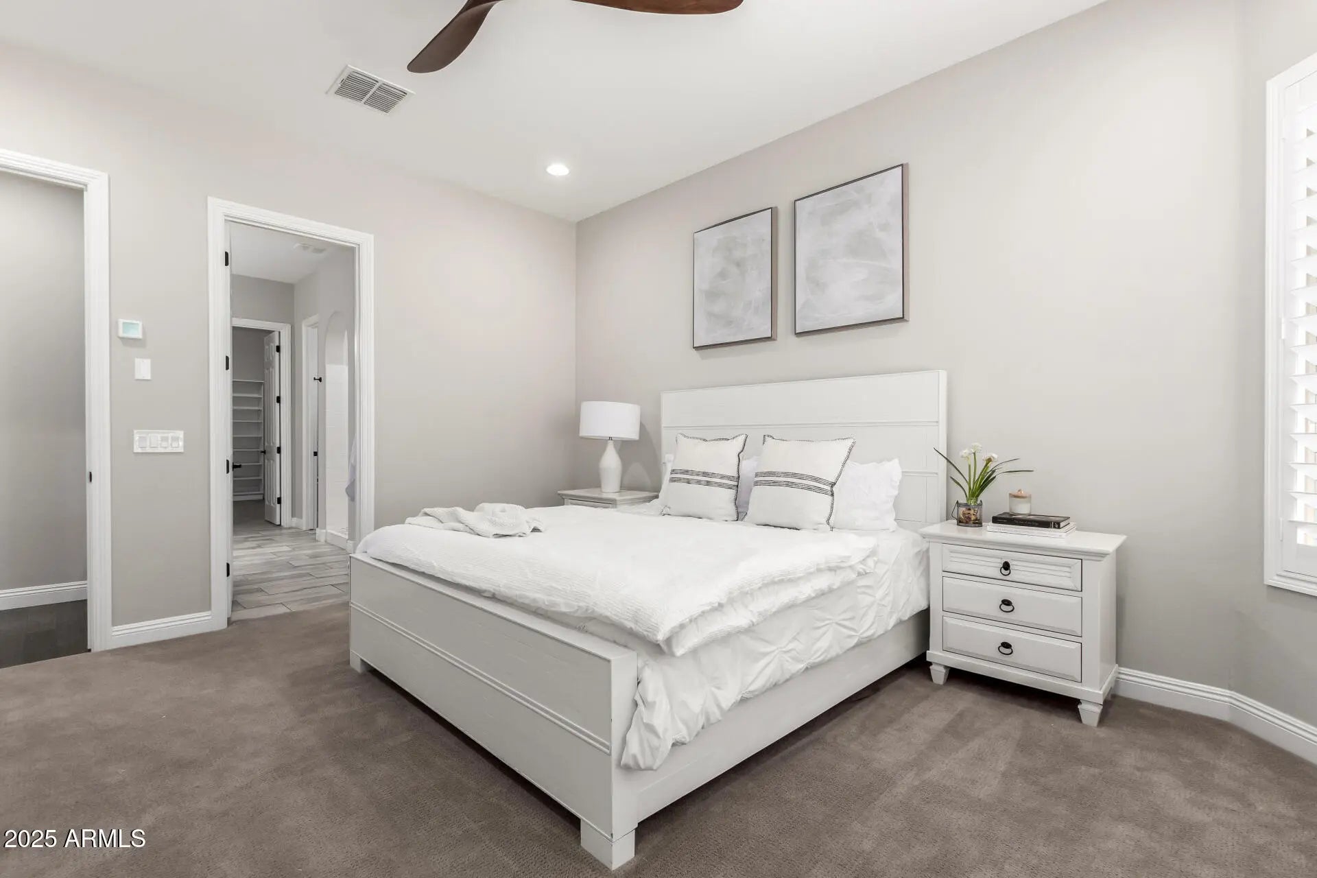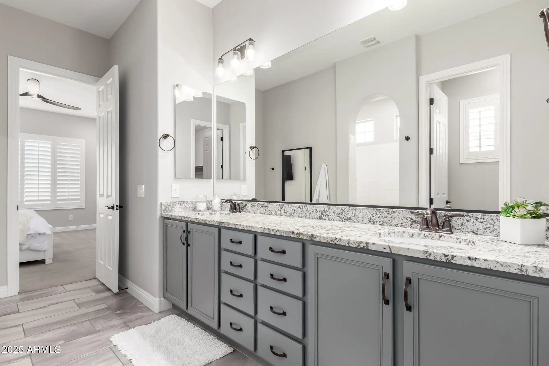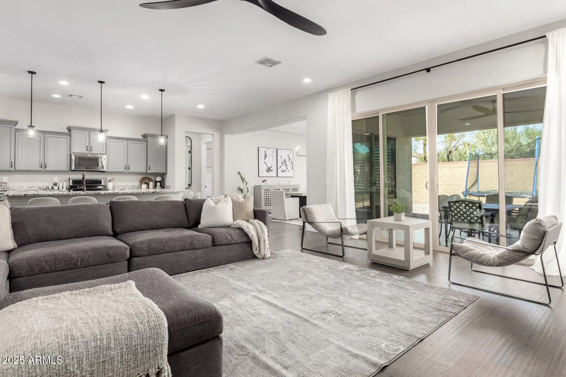 Stunning Single-Story Home on a Premium Corner Lot! Situated in a beautifully manicured gated community, this lovely home offers privacy with no neighbors behind and borders a peaceful common area. Freshly painted inside & featuring 4 bedrooms, 2.5 bathrooms in a split floorplan and a spacious 2.5-car garage with cabinets, this home is designed for both comfort and functionality. The open super great room concept provides a bright and inviting living space, while the large master bedroom and enormous closet includes custom organization. Loaded with high-end upgrades like wooden shutters, tankless water heater, wood floors, honed kitchen countertops and a gas range, this home is truly a gem! Don't miss your chance to own this incredible property.