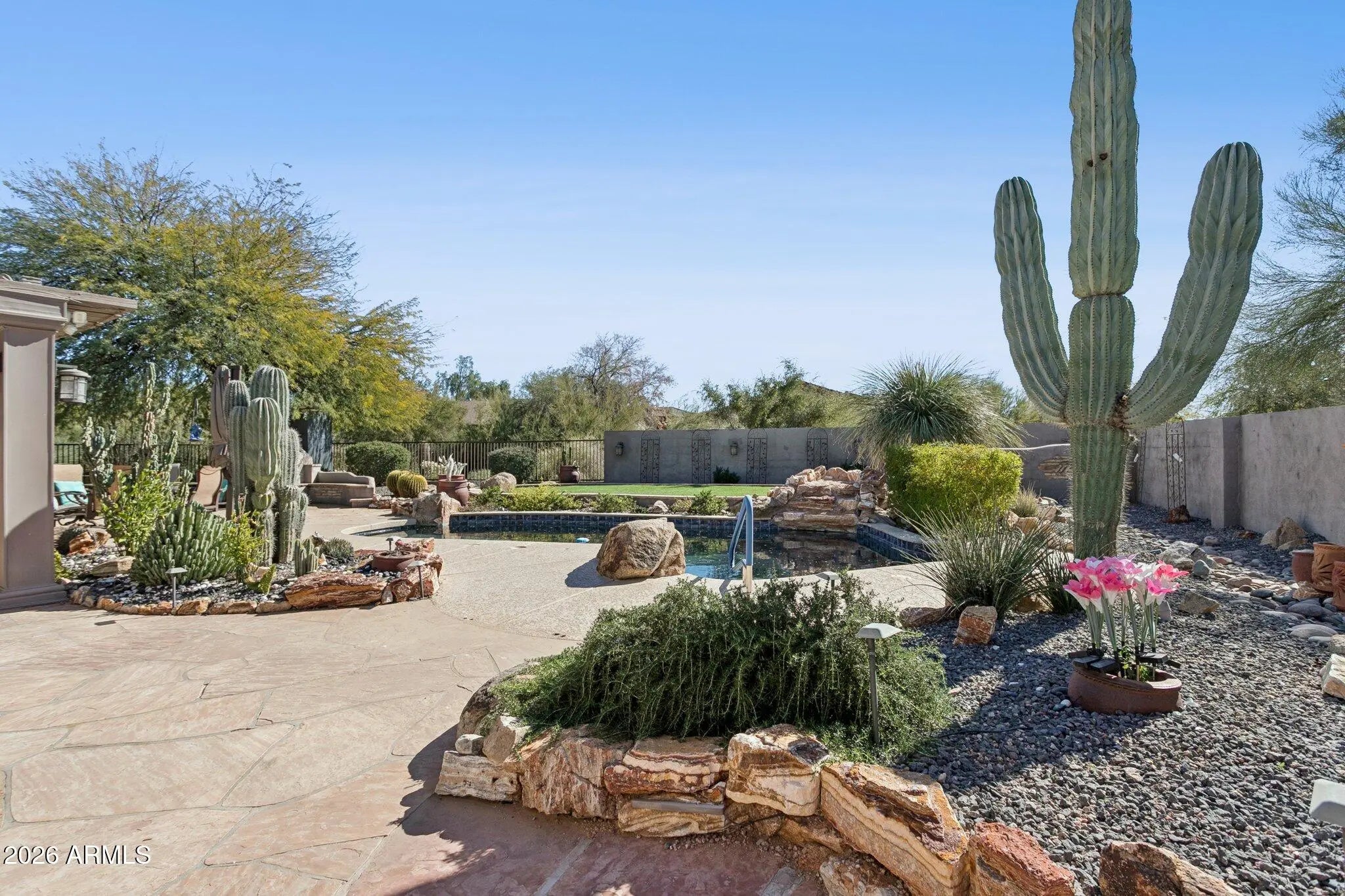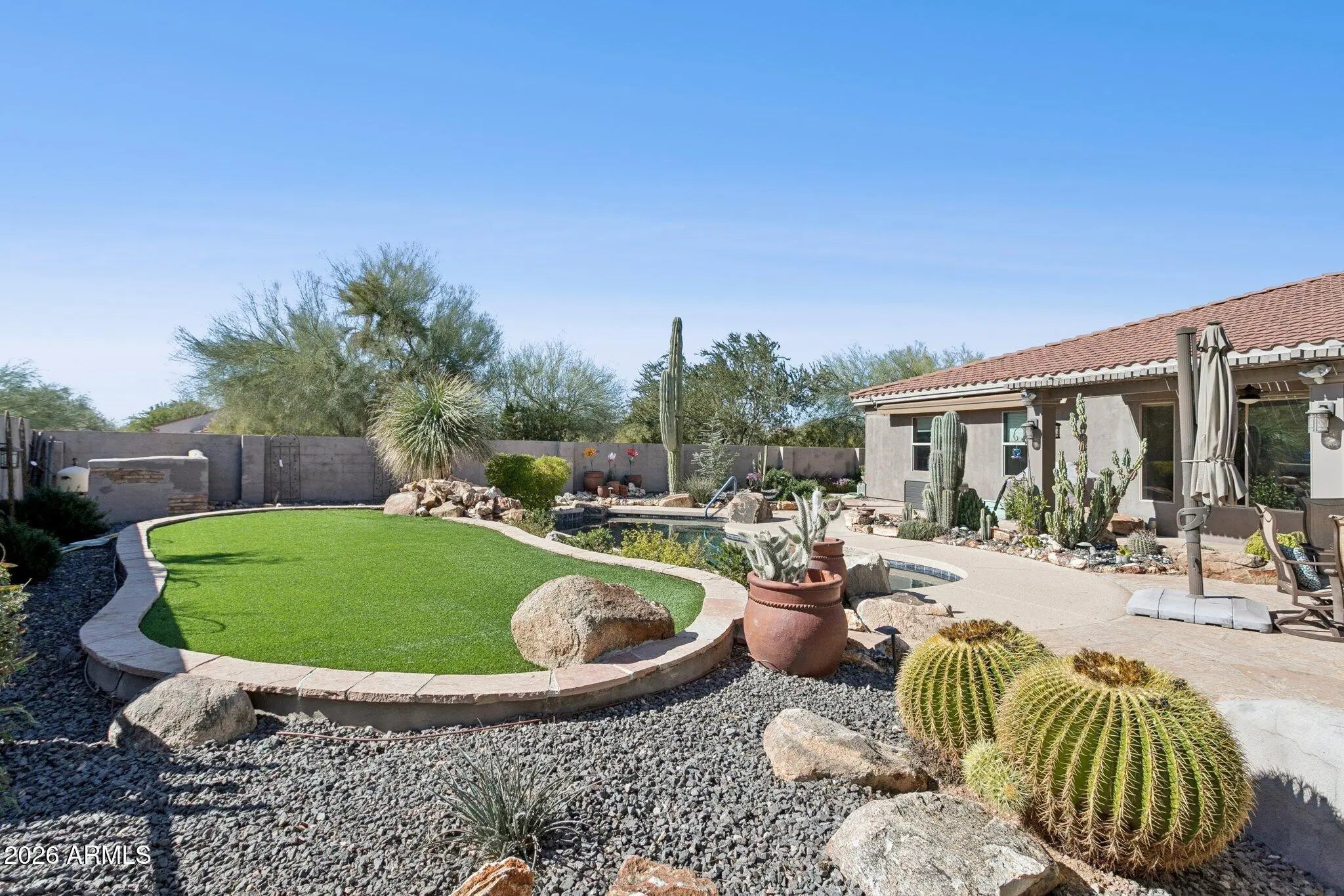 Designed with space, flexibility, and privacy in mind, this beautifully appointed single-level home is ideal for large family or multi-generational living and has been thoughtfully designed with exclusive interior upgrades. The open floor plan offers generous gathering spaces that flow effortlessly for everyday living and entertaining. The chef's kitchen anchors the home with ample workspace and storage, opening seamlessly to the main living areas. A dedicated media room is perfect for movie nights, while guests can relax and connect throughout the rest of the home. There is also ample room on the property to expand the garage, offering flexibility for additional vehicles, storage, or specialty needs. Step outside to a true backyard retreat. Backing to a desert wash with no common walls, the property offers exceptional privacy and peaceful desert views. Enjoy Arizona living at its best with a Pebble Tec pool and waterfall, built-in BBQ, outdoor fireplace, and an elevated turf area for outdoor games and golf putting green, an entertainer's dream and a serene escape all in one. Ideally located just minutes from the dining, shopping, golf, and outdoor recreation that make Cave Creek so special, with convenient access to the world-class amenities of Scottsdale.