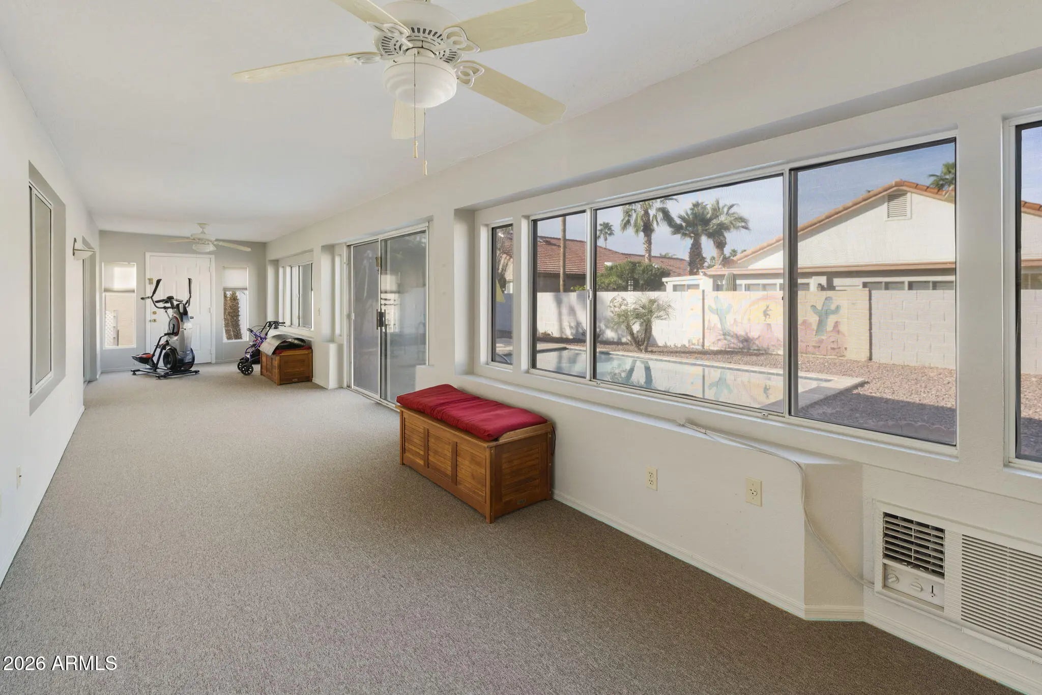 Popular 3BR, 2BA Palacia Plus model with a pool in the desirable, gated, active adult community of Palo Verde at Sun Lakes. Great curb appeal with mature landscaping. Large great room with vaulted ceilings and new carpet greets you as you enter. Efficient kitchen with painted white cabinets, granite counters, SS appliances, lots of cabinet space, and a cute breakfast area with large windows. Family room off kitchen with sliders access to the fully enclosed bonus AZ room. Good sized lap pool in the large backyard for your morning swim. Large primary suite with vaulted ceiling and updated bathroom. Two guest rooms with walk-in closet in one and California Closets in the other. Tons of cabinets in the garage. Palo Verde boasts so many amenities with pools, fitness, golf, tennis, SEE MORE pickleball and so many clubs!