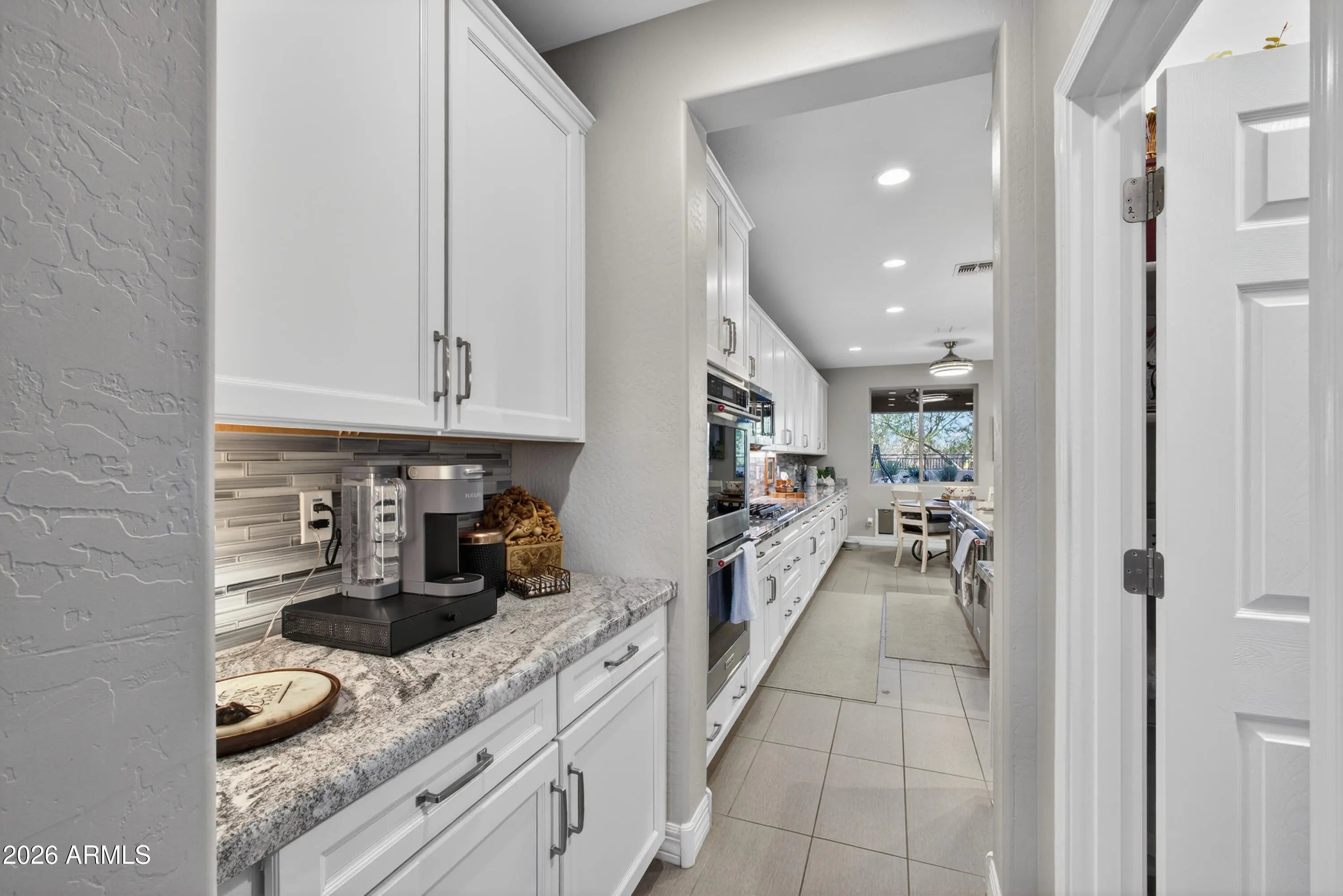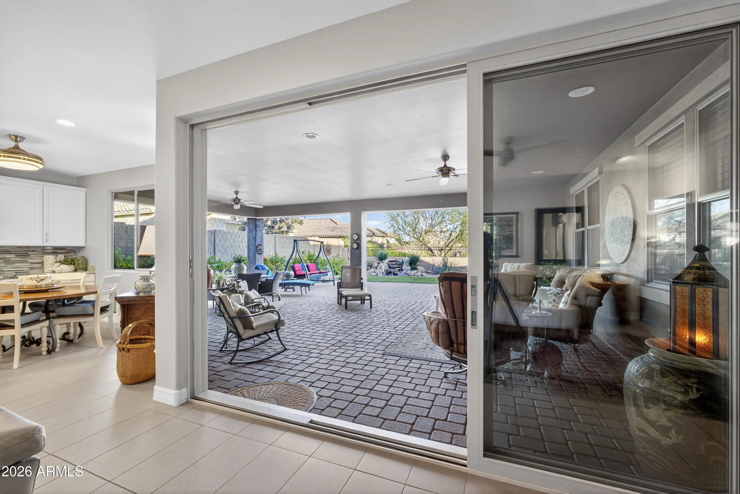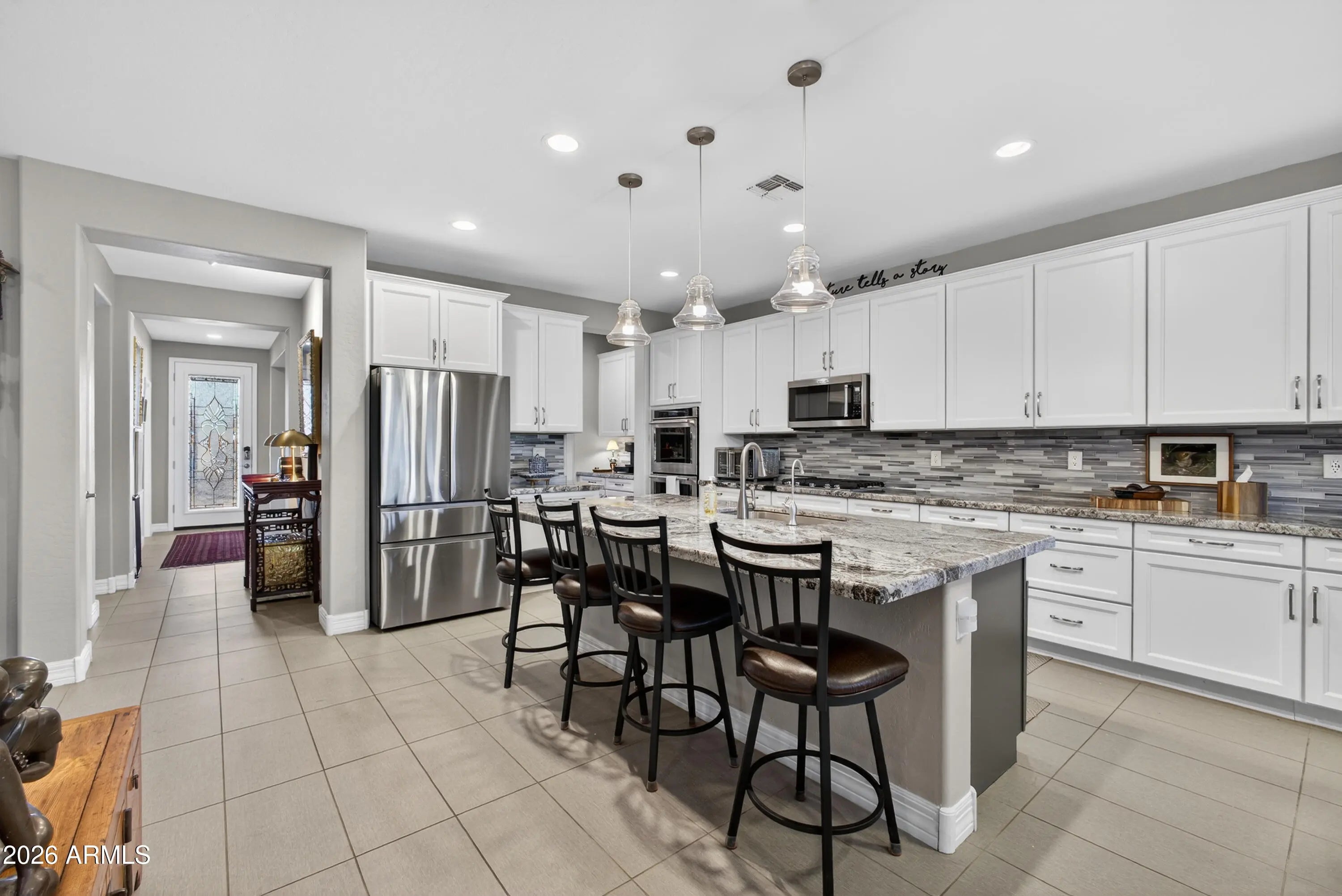 Looking for the perfect blend of elegance and comfort? This 3-bed, 2.5-bath Hollywood model located in Encore at Eastmark is a rare gem! Whether you're hosting dinner in the formal dining room or enjoying a quiet moment on the patio, every inch of this home feels like a sanctuary. The kitchen features a huge center island, dining nook, coffee bar, a large walk-in pantry, stainless appliances, custom granite counters, and abundant cabinetry. A 12 ft. sliding door in the great room opens to an extended patio with stunning open-space views, a dining area, and a tranquil fountain. The primary suite is spacious, luxurious, and features a custom walk-in closet, dual sinks, a sleek seamless glass shower, and a separate water closet. Custom cabinetry in the mud/garage entry keeps life organized. The laundry room has custom cabinetry and has an exterior barn door to maximize space. Adjacent to the mud/garage entry is a convenient 1/2 bath with a custom barn door, great for when you have guests. The front room has a closet and can be used as an office, an extra bedroom or both! The garage is extra large 2 and 1/2 spaces, enough for 2 cars and a golf cart or a garage workshop. It's a short two block walk down the street to the Encore clubhouse where you can enjoy freshly made breakfast or lunch, meet friends for a game of cards, take a line-dancing class, or even play a game of pickleball. The many paved walking paths and open green spaces allow you to walk for miles without ever leaving Encore!