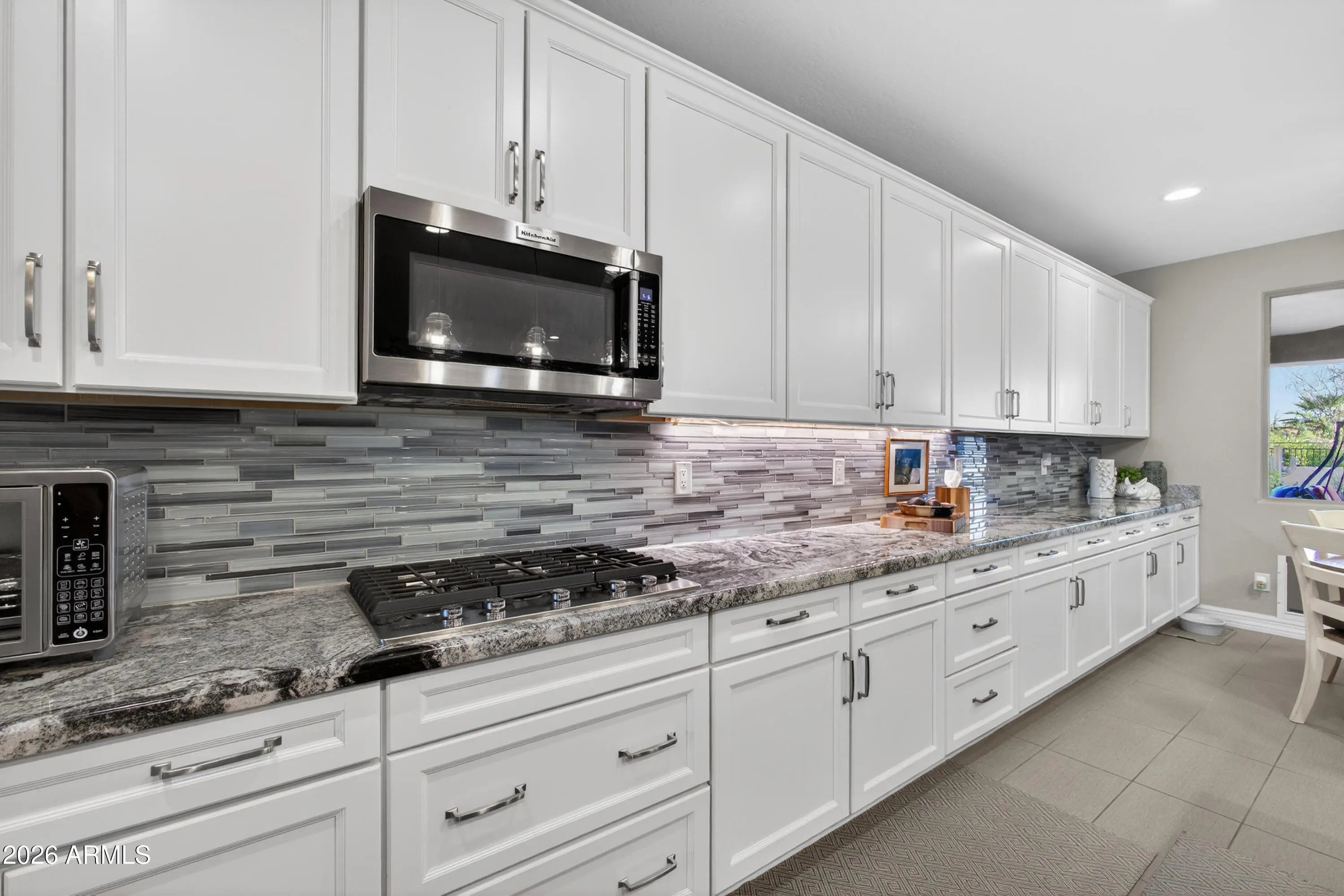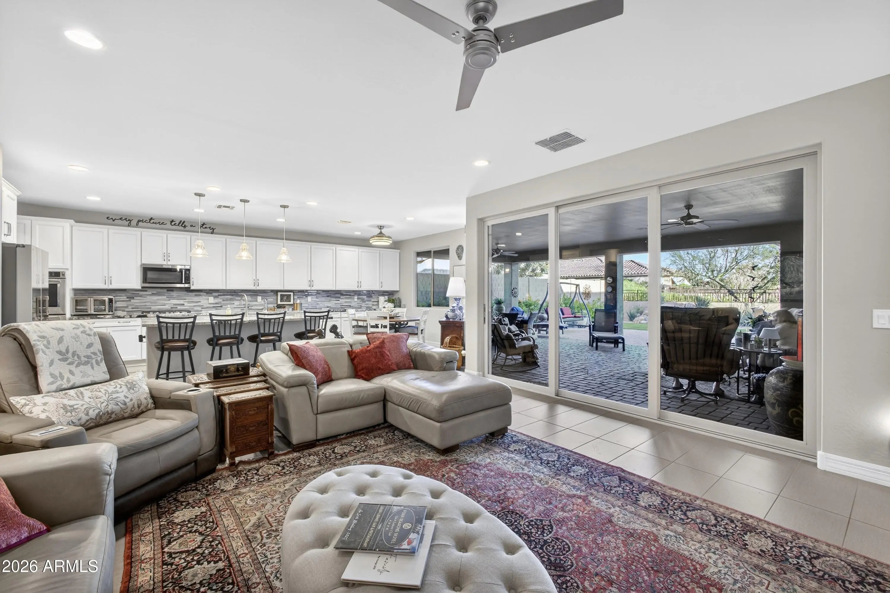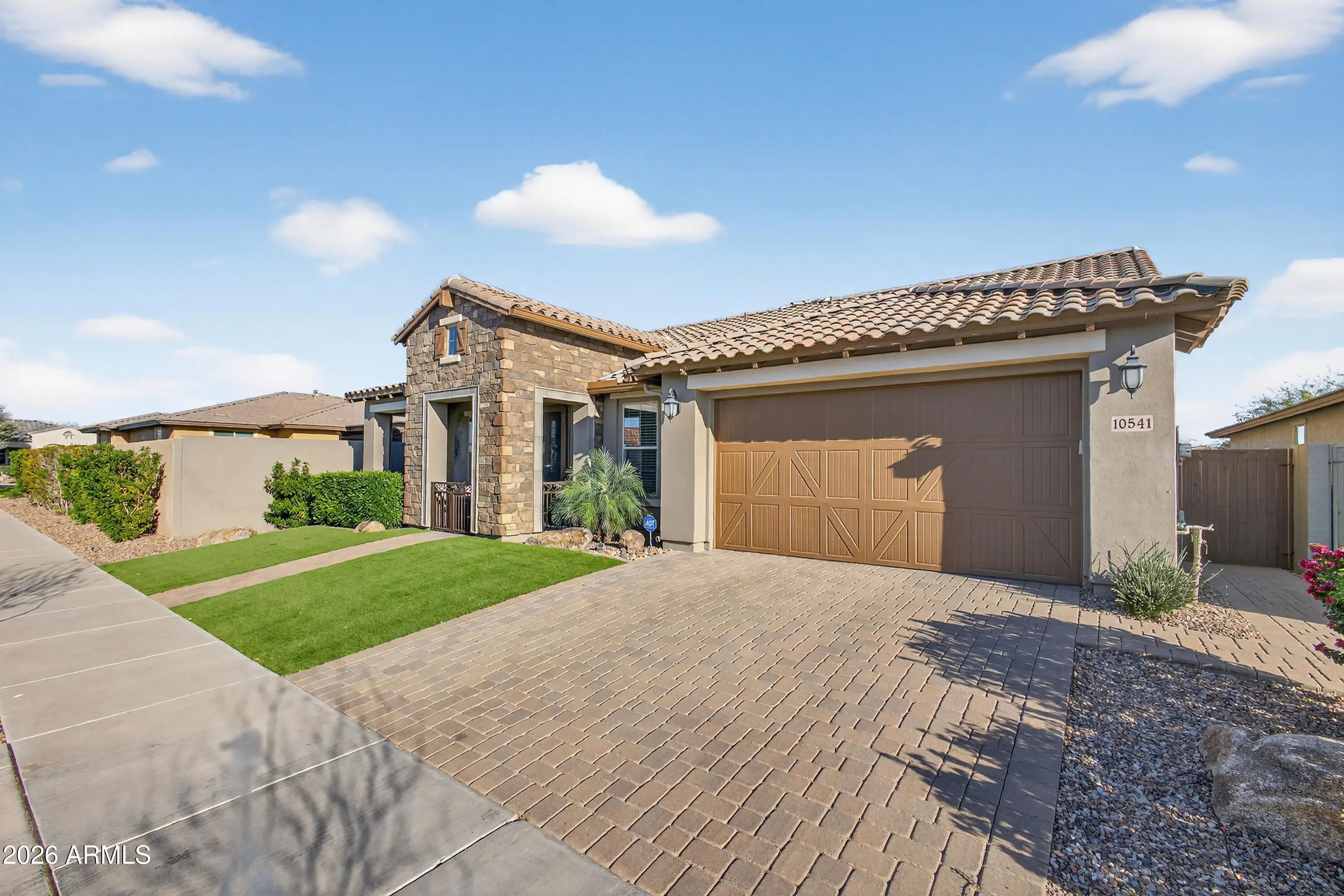 Looking for the perfect blend of elegance and comfort? This 3-bed, 2.5-bath Hollywood model located in Encore at Eastmark is a rare gem! Whether you're hosting dinner in the formal dining room or enjoying a quiet moment on the patio, every inch of this home feels like a sanctuary. The kitchen features a huge center island, dining nook, coffee bar, a large walk-in pantry, stainless appliances, custom granite counters, and abundant cabinetry. A 12 ft. sliding door in the great room opens to an extended patio with stunning open-space views, a dining area, and a tranquil fountain. The primary suite is spacious, luxurious, and features a custom walk-in closet, dual sinks, a sleek seamless glass shower, and a separate water closet. Custom cabinetry in the mud/garage entry keeps life organized. The laundry room has custom cabinetry and has an exterior barn door to maximize space. Adjacent to the mud/garage entry is a convenient 1/2 bath with a custom barn door, great for when you have guests. The front room has a closet and can be used as an office, an extra bedroom or both! The garage is extra large 2 and 1/2 spaces, enough for 2 cars and a golf cart or a garage workshop. It's a short two block walk down the street to the Encore clubhouse where you can enjoy freshly made breakfast or lunch, meet friends for a game of cards, take a line-dancing class, or even play a game of pickleball. The many paved walking paths and open green spaces allow you to walk for miles without ever leaving Encore!