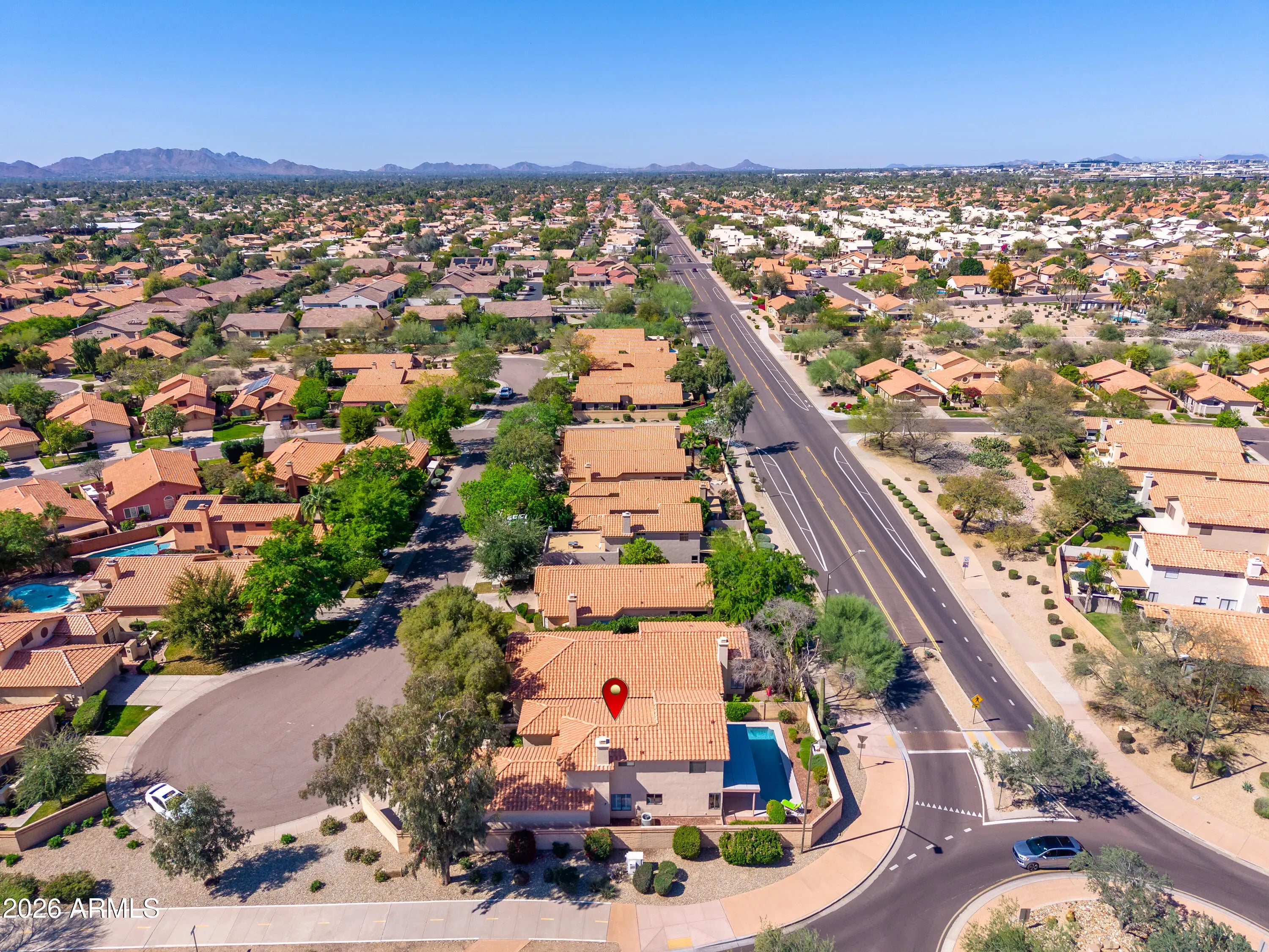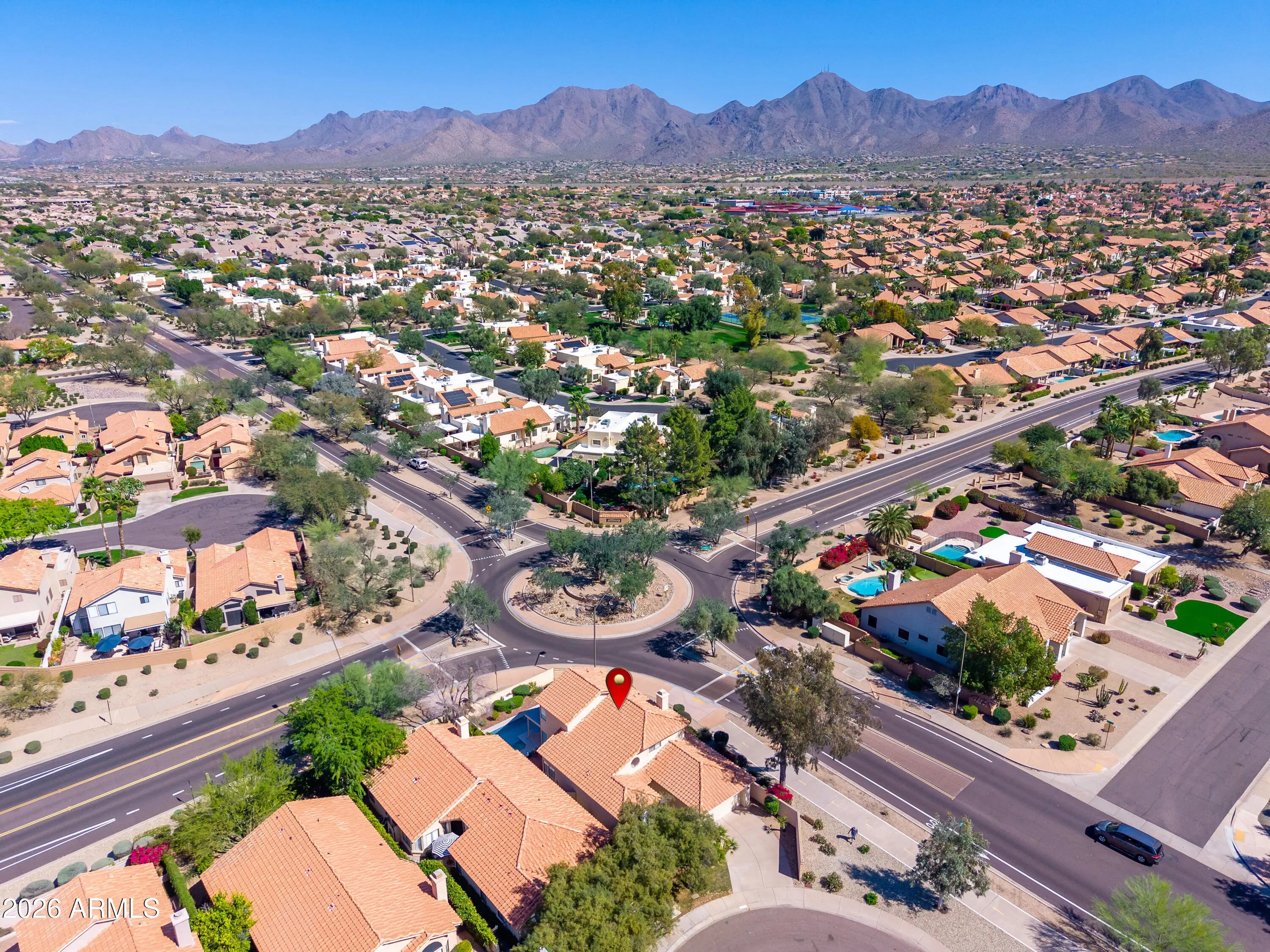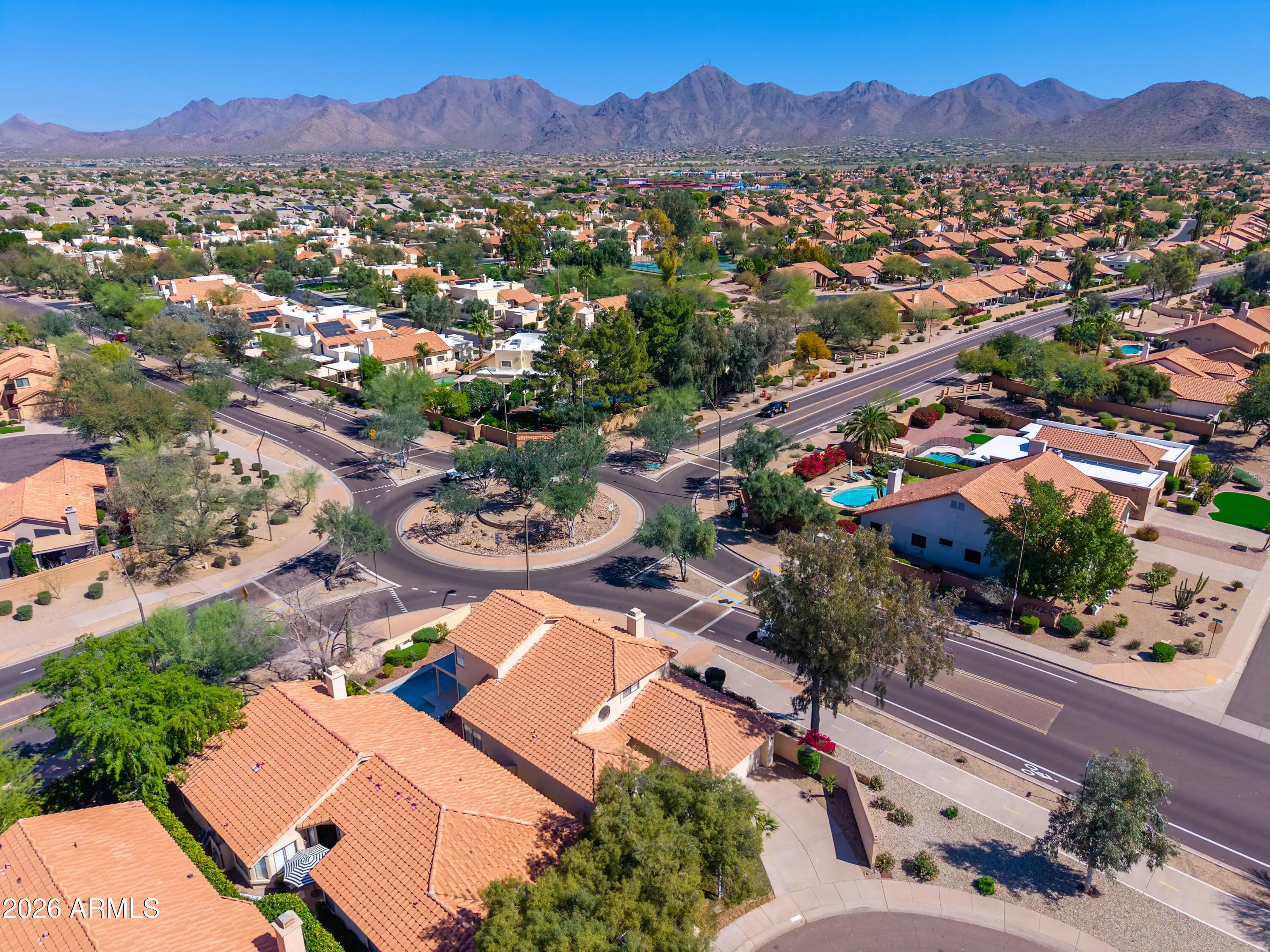 SCOTTSDALE BEAUTY! Highly Desirable Sweetwater Ranch 3 bed, 3 bath home sits on a quiet cul-de-sac and features a remodeled private pool and spa!! PLUS Recent upgrades include a brand-new downstairs A/C, new water heater, new exterior paint, new garage cabinets! The bright, open floor plan offers soaring ceilings in the formal living with formal dining room and spacious family room with wood-burning fireplace. The Kitchen has quartz countertops with breakfast bar, ample cabinetry, Breakfast area with French doors overlooking the pool/ backyard. A first-floor bedroom / office with full bath adds flexibility. Upstairs, the primary suite showcases Mountain Views and an ensuite w/ dual sinks, walk-in shower, and private water closet. Enjoy low maintenance-free backyard =LOCK & LEAVE! A second upstairs bedroom offers its own ensuite bath, ideal as a guest suite. Wood shutters, ceiling fans, and an unbeatable location near schools, parks, shopping, dining, entertainment,