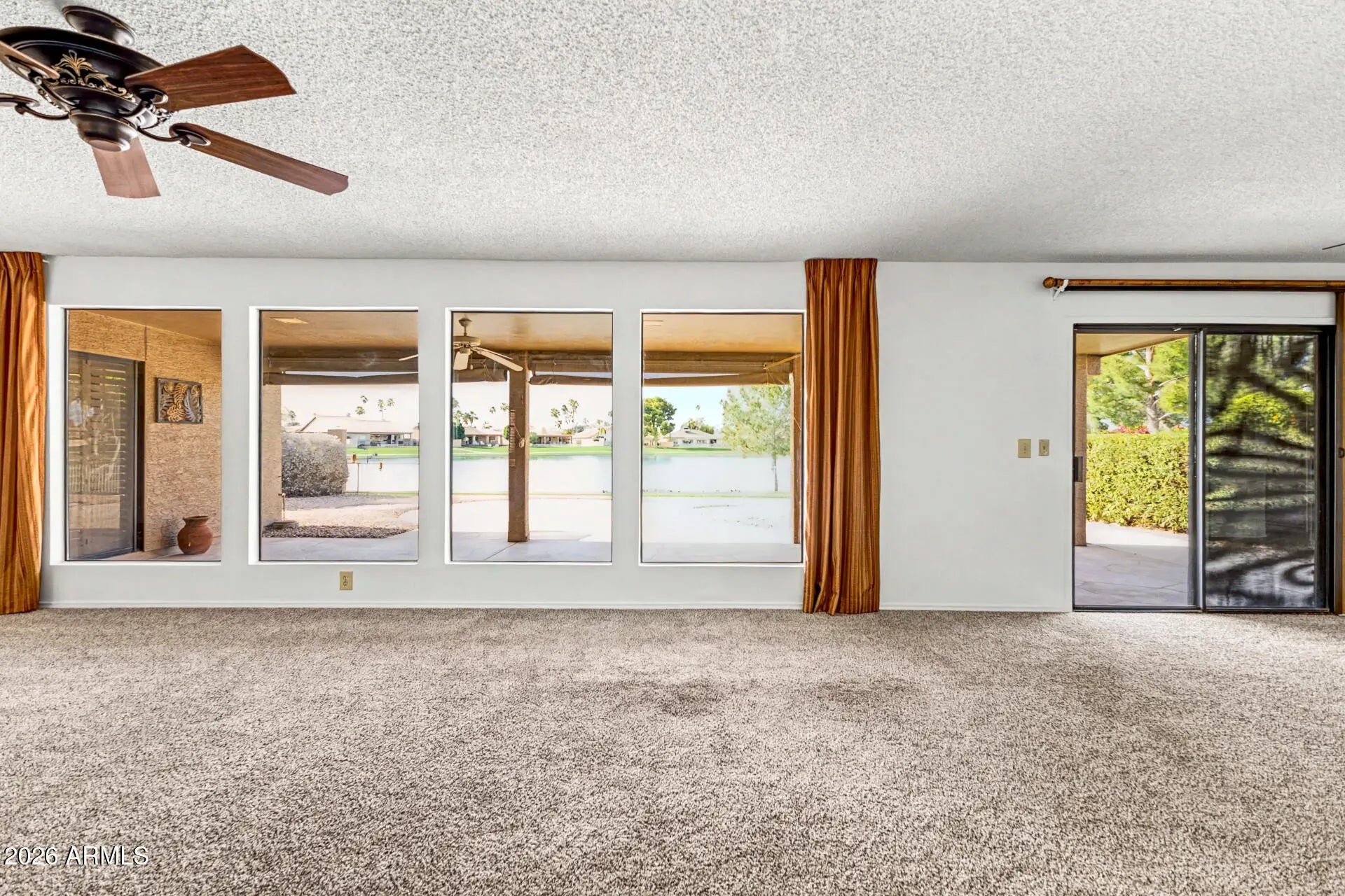 MILLION DOLLAR VIEW! Don't miss out on this Sun Lakes home with updated A/C, a spectacular lakeside lot, spacious yard with large covered patio & 3 bedrooms. Home has 2 car garage AND a golf cart storage area. Locations like this rarely come up - come see it today!!!