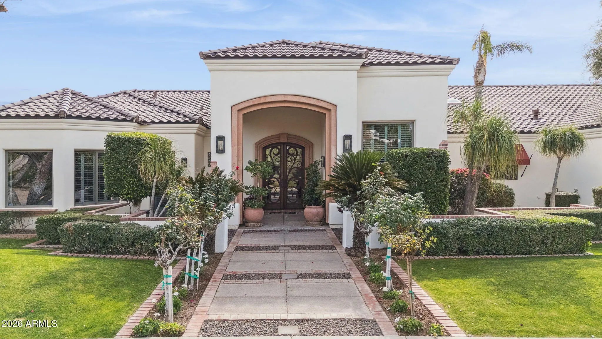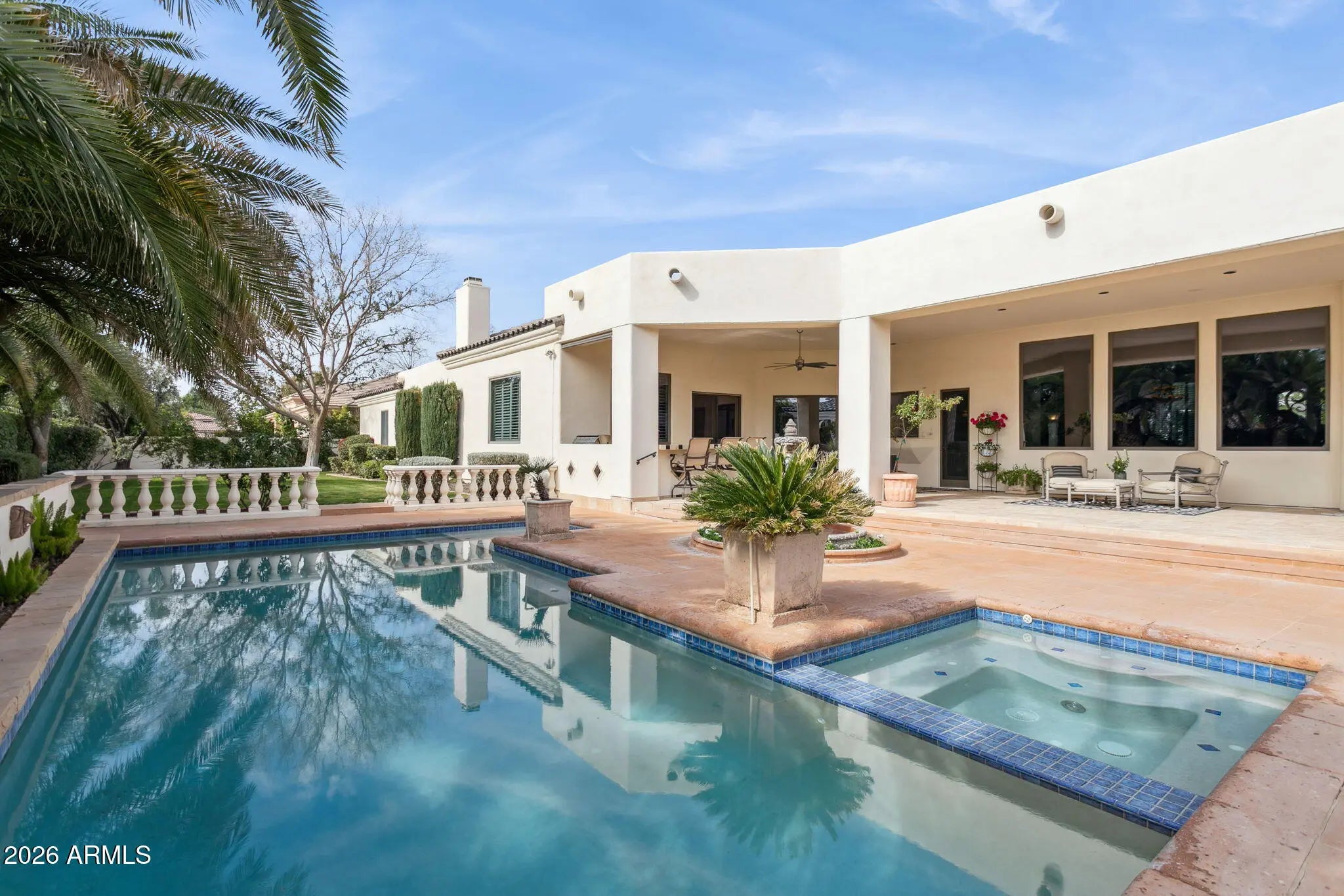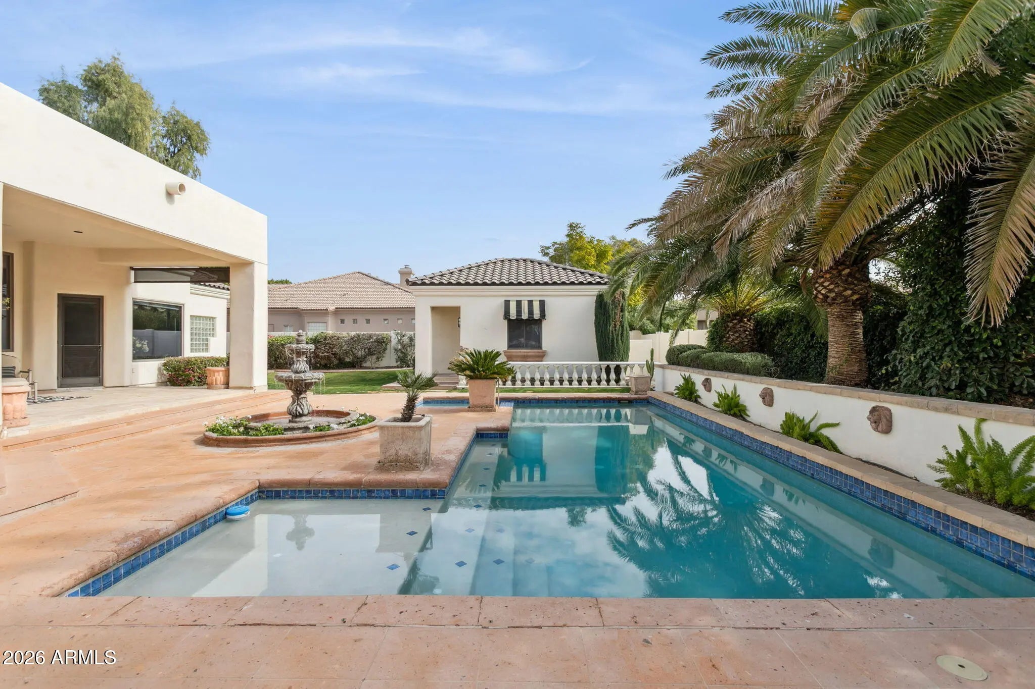 Nestled within a small, private gated enclave in Scottsdale, this exceptional custom home offers timeless design, privacy, and resort-style living. Exquisitely maintained estate, exudes refined living on a quiet cul-de-sac, surrounded by nearly half an acre of manicured grounds. A picturesque entry framed by blooming rose trees lush green landscaping, and a tranquil fountain sets a warm and elegant first impression. Inside, the dramatic living room showcases soaring ceilings and a wall of windows that capture serene views of the expansive covered patio, formal pool, water feature, and beautifully landscaped gardens. This inviting gathering space features a wet bar and is thoughtfully positioned to maintain sight lines to the formal dining area, making it ideal for elevated... entertaining. Designed with intention, the kitchen features crisp white cabinetry, abundant storage, a pantry, and a center island complete with a prep sink. Premium appliances include a Wolf gas cooktop, double Jenn Air wall ovens, complemented by a farmhouse sink and breakfast bar. An inviting eat-in area with expansive windows overlooks the backyard, while the adjacent living area is anchored by a cozy fireplace. Double doors open to the primary suite, a serene retreat with backyard access, a dual-sided fireplace, and a spa-inspired bath showcasing an extended double vanity, soaking tub, separate shower, and a spacious closet with custom built-ins. Each additional bedroom is thoughtfully designed with its own ensuite bath, offering comfort and privacy for all. Car enthusiasts will appreciate the oversized 1,100+ square-foot four-car garage, offering exceptional space and functionality. Adding to the home's versatility is a detached casita featuring a living area, kitchenette, full bath, and washer/dryer hookups, ideal for guests or extended stays. The backyard is a sanctuary of serenity and sophistication, featuring a sparkling pool, a graceful garden fountain, and stately palms that sway gently in the breeze. An expansive covered patio with a built-in BBQ hosts alfresco dining, while multiple lounge areas create distinct settings for entertaining or relaxing, flowing naturally onto a generous stretch of lush green lawn that enhances this private oasis. A dedicated office with ensuite bath, flexible den space, and access to the community tennis court further elevate the lifestyle. Positioned near top-rated schools, acclaimed medical centers, and scenic hiking and biking trails, this residence offers an unparalleled opportunity to enjoy luxury living in Scottsdale!