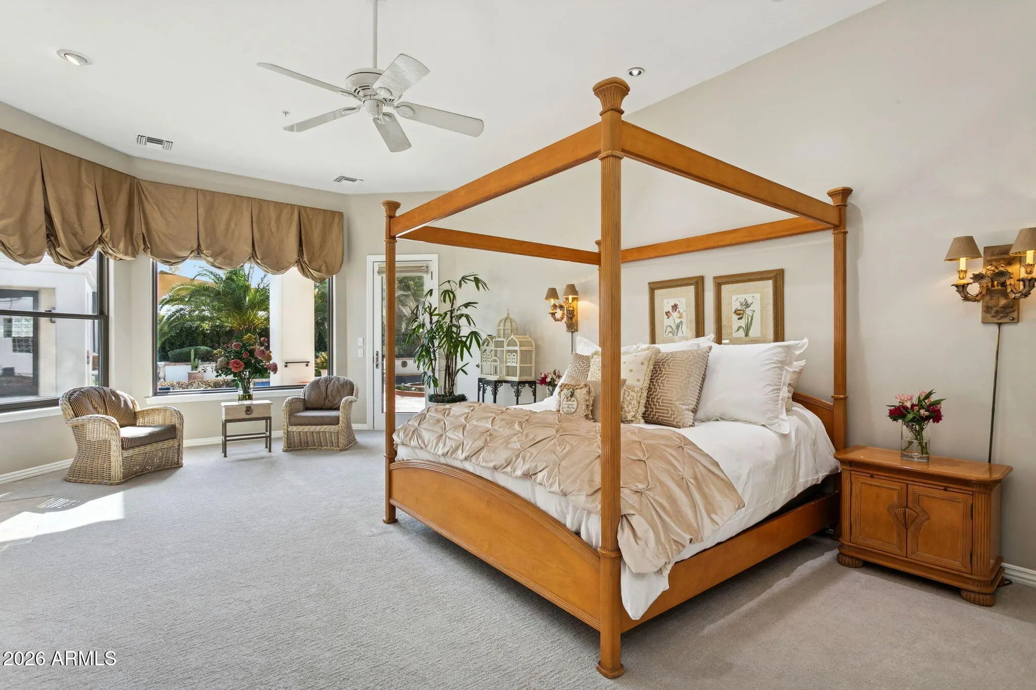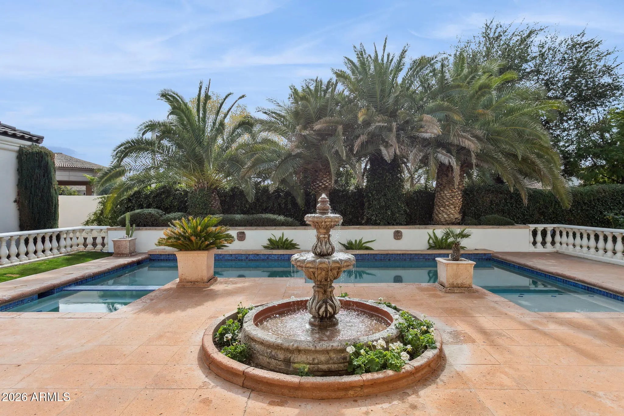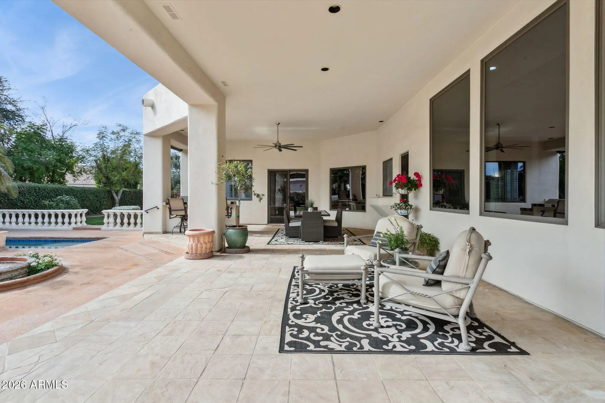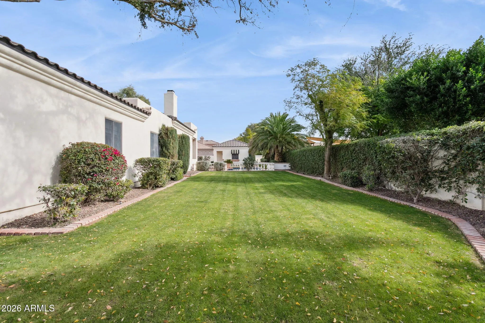 Nestled within a small, private gated enclave in Scottsdale, this exceptional custom home offers timeless design, privacy, and resort-style living. Exquisitely maintained estate, exudes refined living on a quiet cul-de-sac, surrounded by nearly half an acre of manicured grounds. A picturesque entry framed by blooming rose trees lush green landscaping, and a tranquil fountain sets a warm and elegant first impression. Inside, the dramatic living room showcases soaring ceilings and a wall of windows that capture serene views of the expansive covered patio, formal pool, water feature, and beautifully landscaped gardens. This inviting gathering space features a wet bar and is thoughtfully positioned to maintain sight lines to the formal dining area, making it ideal for elevated... entertaining. Designed with intention, the kitchen features crisp white cabinetry, abundant storage, a pantry, and a center island complete with a prep sink. Premium appliances include a Wolf gas cooktop, double Jenn Air wall ovens, complemented by a farmhouse sink and breakfast bar. An inviting eat-in area with expansive windows overlooks the backyard, while the adjacent living area is anchored by a cozy fireplace. Double doors open to the primary suite, a serene retreat with backyard access, a dual-sided fireplace, and a spa-inspired bath showcasing an extended double vanity, soaking tub, separate shower, and a spacious closet with custom built-ins. Each additional bedroom is thoughtfully designed with its own ensuite bath, offering comfort and privacy for all. Car enthusiasts will appreciate the oversized 1,100+ square-foot four-car garage, offering exceptional space and functionality. Adding to the home's versatility is a detached casita featuring a living area, kitchenette, full bath, and washer/dryer hookups, ideal for guests or extended stays. The backyard is a sanctuary of serenity and sophistication, featuring a sparkling pool, a graceful garden fountain, and stately palms that sway gently in the breeze. An expansive covered patio with a built-in BBQ hosts alfresco dining, while multiple lounge areas create distinct settings for entertaining or relaxing, flowing naturally onto a generous stretch of lush green lawn that enhances this private oasis. A dedicated office with ensuite bath, flexible den space, and access to the community tennis court further elevate the lifestyle. Positioned near top-rated schools, acclaimed medical centers, and scenic hiking and biking trails, this residence offers an unparalleled opportunity to enjoy luxury living in Scottsdale!