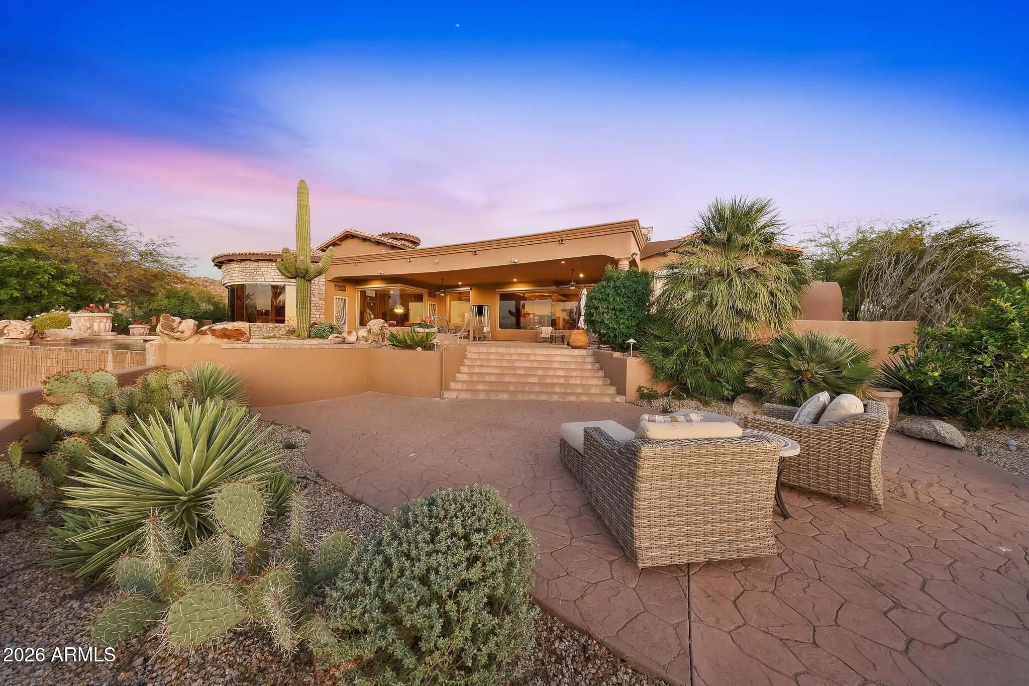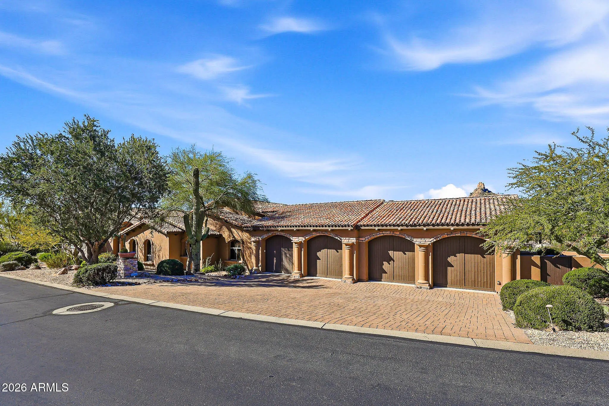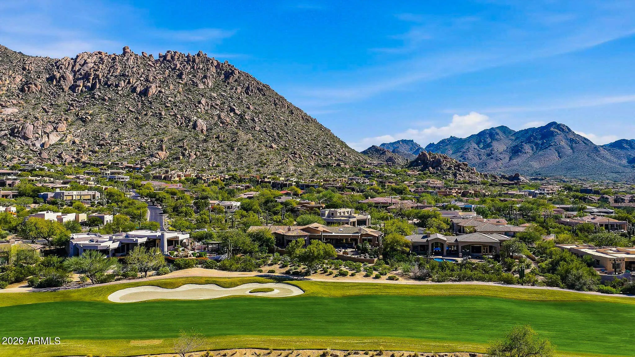 Perfectly positioned along the 8th and 2nd fairways of Troon Country Club, this exceptional residence enjoys a rare and highly coveted double-fairway setting within guard-gated Windy Walk Estates in Troon Village - just a short walk to the clubhouse. Showcasing Pinnacle Peak views, single-level living, and a four-car garage, this home presents a truly rare opportunity in one of North Scottsdale's most prestigious golf communities. Offering 6,691 square feet, 5 bedrooms, 5.5 baths, and a true 4-car garage, this no-step residence delivers effortless luxury living with dramatic golf course, mountain, city-light, and sunset views. The open, thoughtfully designed floor plan features soaring ceilings and a grand great room anchored by a gourmet kitchen with large U-shaped island, stainless appliances, custom wood cabinetry, and stone countertopsseamlessly flowing into the family room for easy entertaining. Formal living and dining spaces connect to a wet bar with wine refrigerator and ice maker, creating an ideal layout for hosting. All guest bedrooms are generously sized en suite, each featuring walk-in showers and walk-in closets. The primary retreat is privately situated and offers a sitting area with fireplace, spa-inspired bath with soaking tub, dual vanities, separate water closets, and a custom walk-in closet. Outdoor living is equally impressive, featuring a heated pool and spa, expansive covered patio, built-in BBQ, outdoor fireplace, and multiple seating areaseach perfectly positioned to take in breathtaking fairway and Pinnacle Peak vistas. Additional highlights include a large laundry room, abundant storage, and recent improvements: flat patio roof recoated in 2026, main sandcast tile roof underlayment replaced approximately five years or newer, and three HVAC systems (2014, 2015, and 2015).