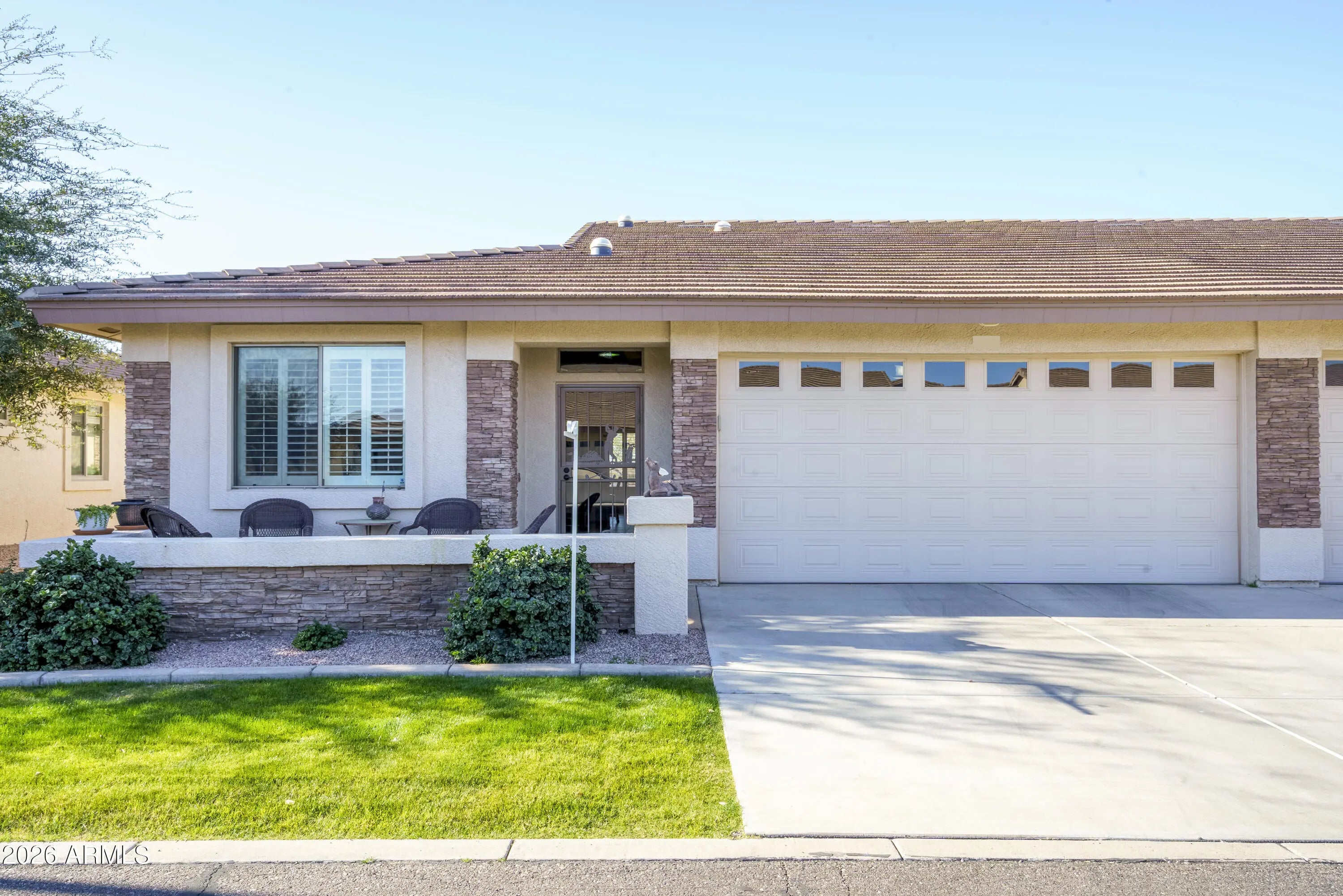Sit on the north front patio and visit with friendly neighbors on a quiet street with no through traffic. Epoxy garage floor and patios. Move in ready. Seller is in a wait list for their next home so delayed closing date can work. Pets ok in golf 3. Block construction. Furniture is included!