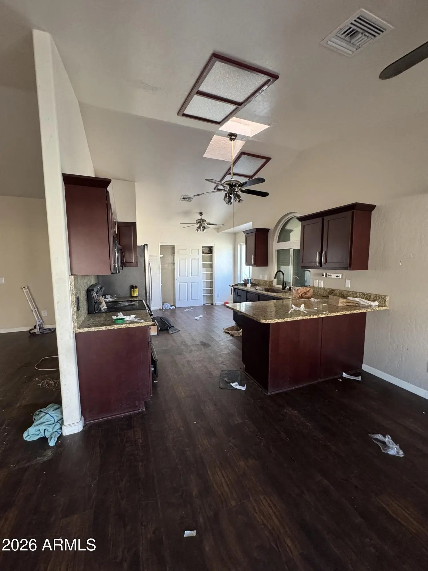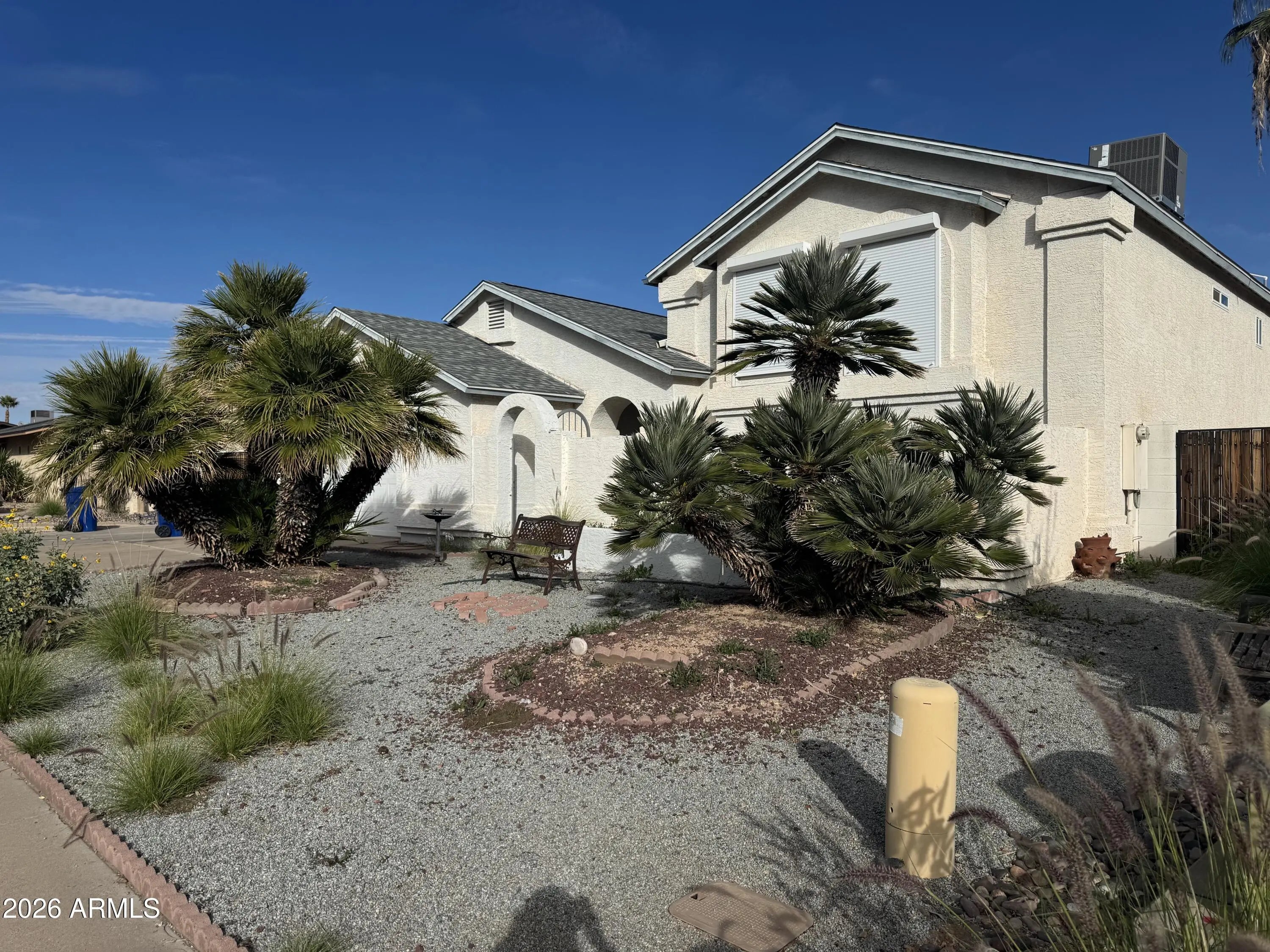 Spacious 5 bed, 3 bath tri-level home in an established East Mesa neighborhood with no HOA and ample parking, including a 65' concrete RV pad. Property is sold in current condition and requires clean up and cosmetic repairs. Desert landscaping leads to a private courtyard entry and bright interior. Daylight basement offers a large family room, two bedrooms, and full bath. Kitchen features granite countertops and dark hardwood flooring. Updates include AC replaced in 2024 and roof redone in 2022. Additional features include a wood-burning fireplace, Roll-A-Shield exterior shutters, ceiling fans, water softener, double-pane ENERGY STAR windows, and a water heater approximately 5 years old. Don't miss out on a great opportunity in quiet east Mesa neighborhood!