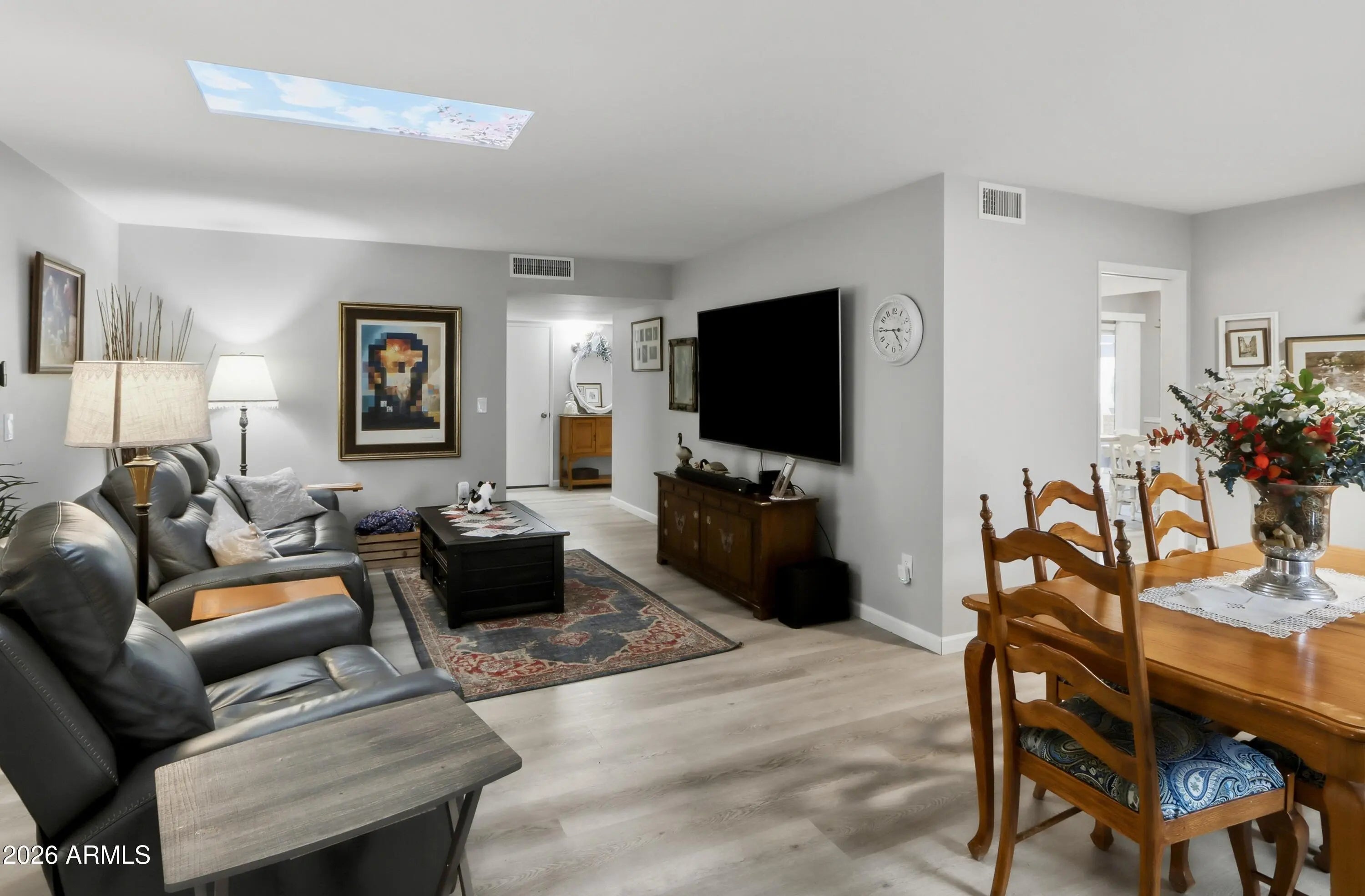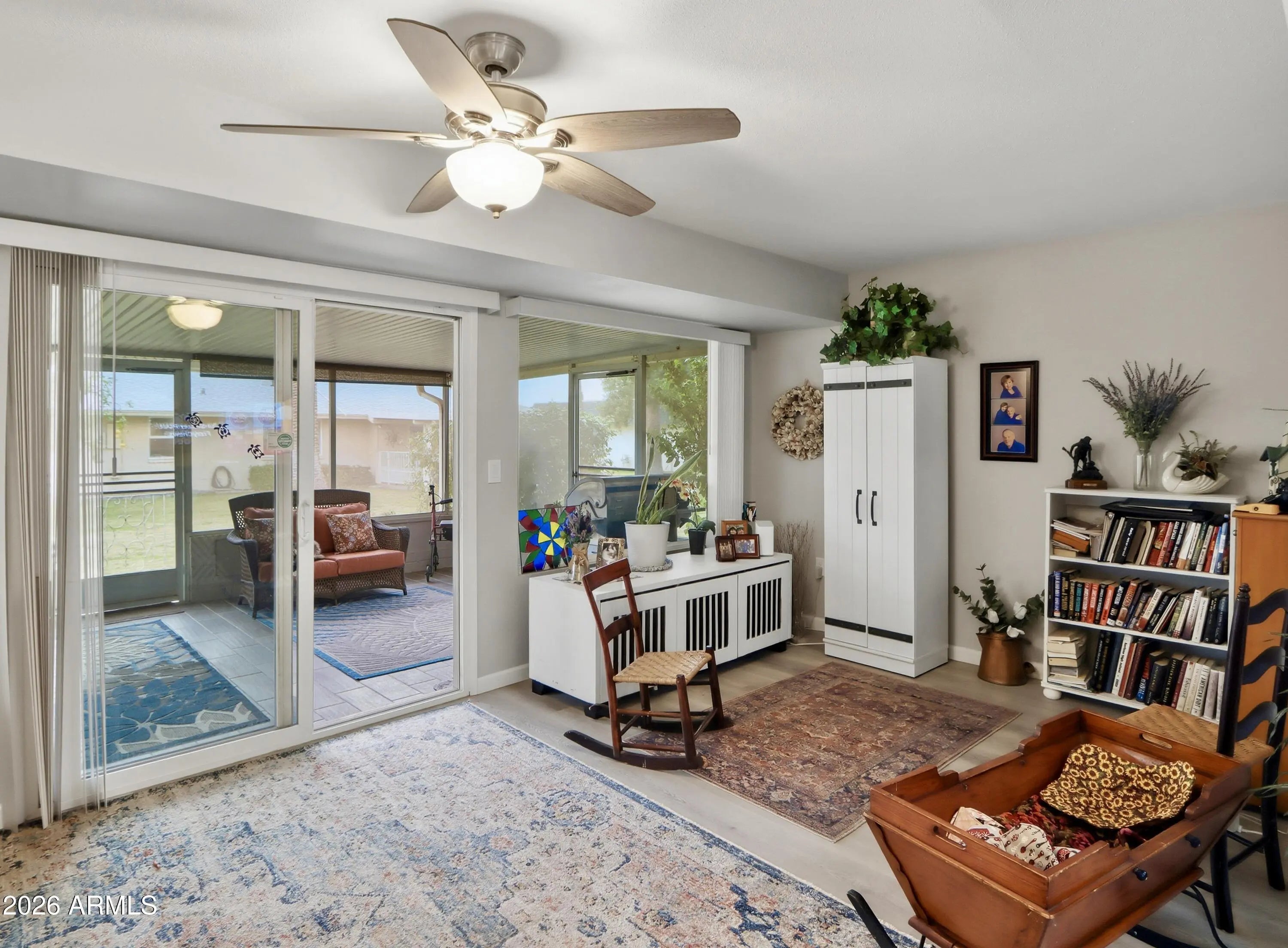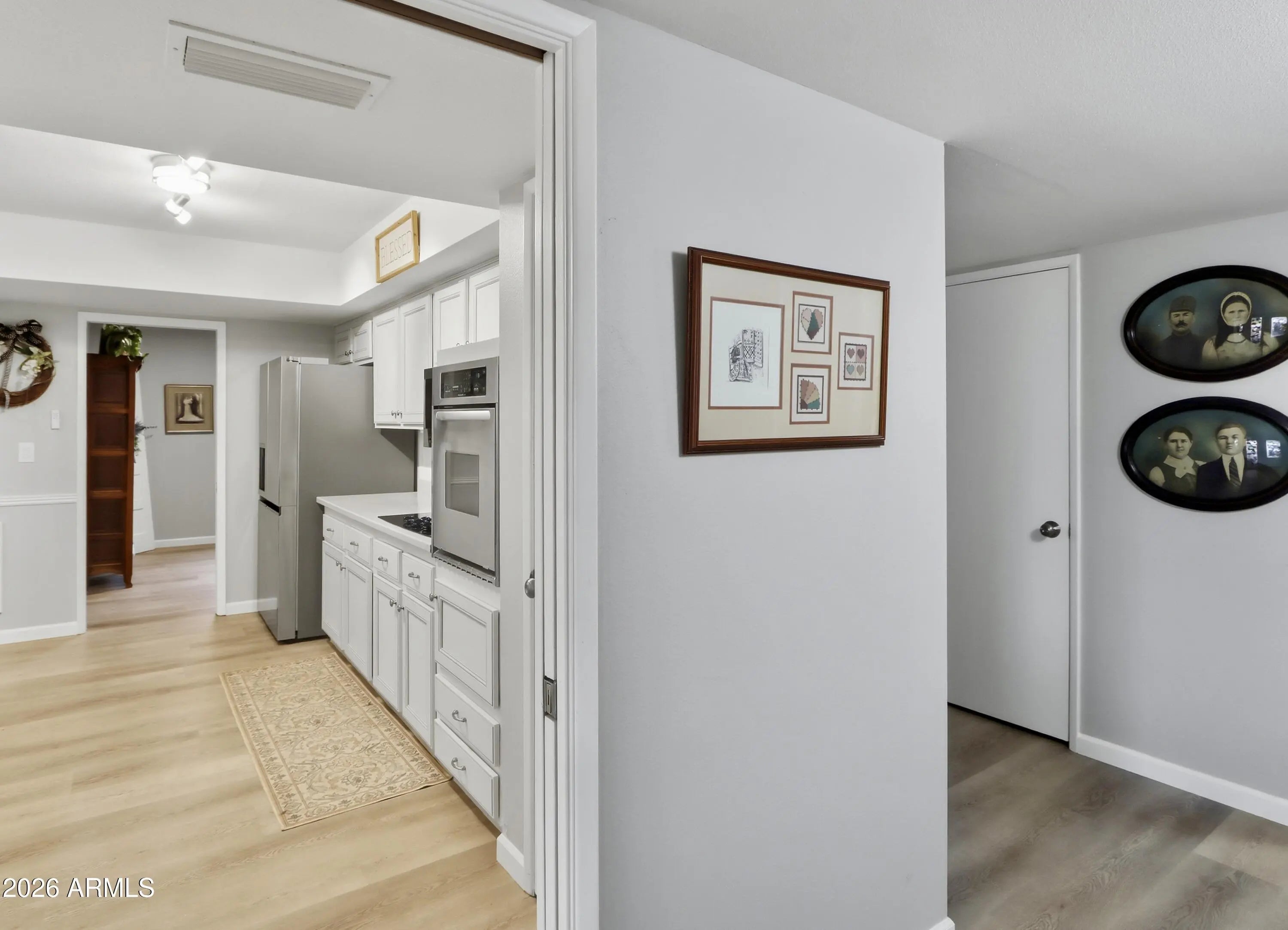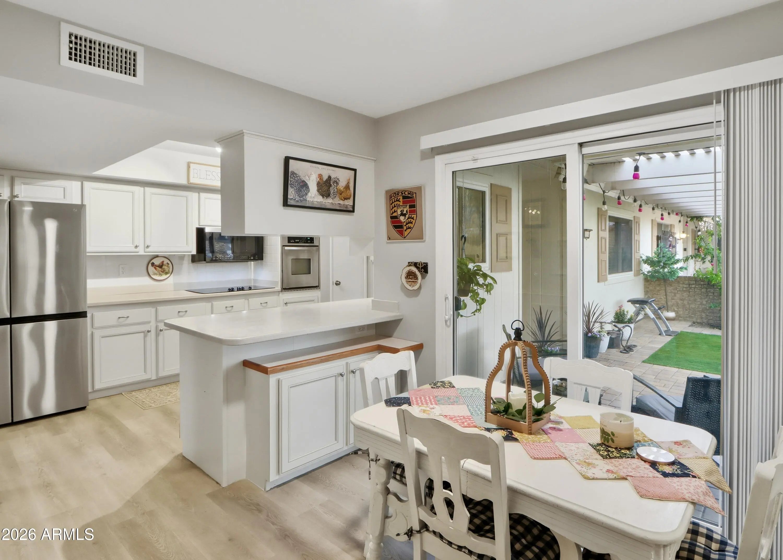 This 2-bedroom, 2-bath home features woodgrain flooring throughout and fresh interior paint completed in January 2024. Located on a greenbelt, the home offers a peaceful setting and inviting outdoor living with a pergola-covered paver patio as well as an enclosed patio for year-round enjoyment. Inside, the eat-in kitchen includes updated cabinetry, stainless steel appliances, and a peninsula with a breakfast bar. The dining area opens to a spacious family room ideal for entertaining or relaxing. Additional highlights include indoor laundry and a large garage with abundant storage. This move-in-ready home combines modern updates, generous living space, and a desirable greenbelt location.