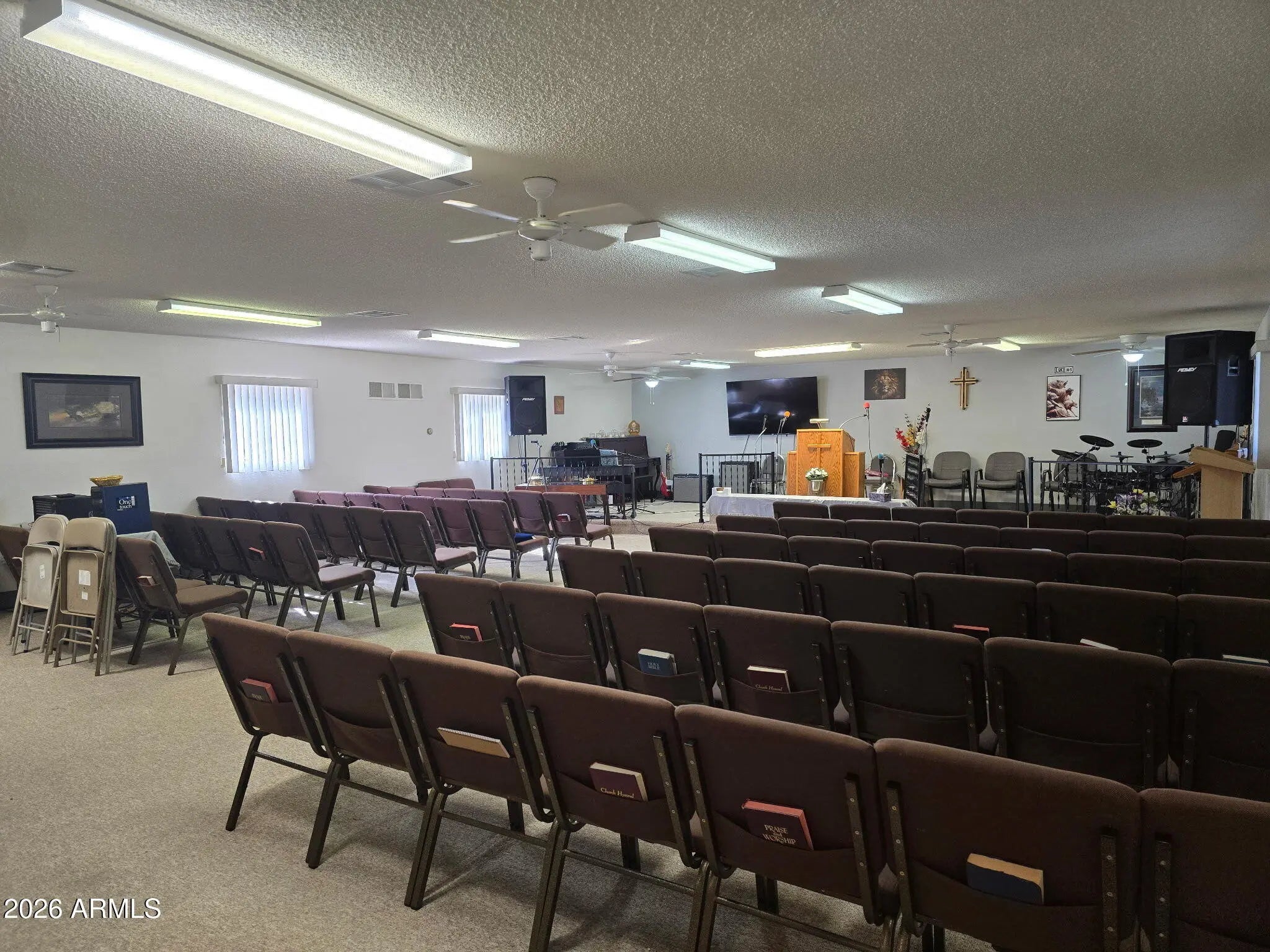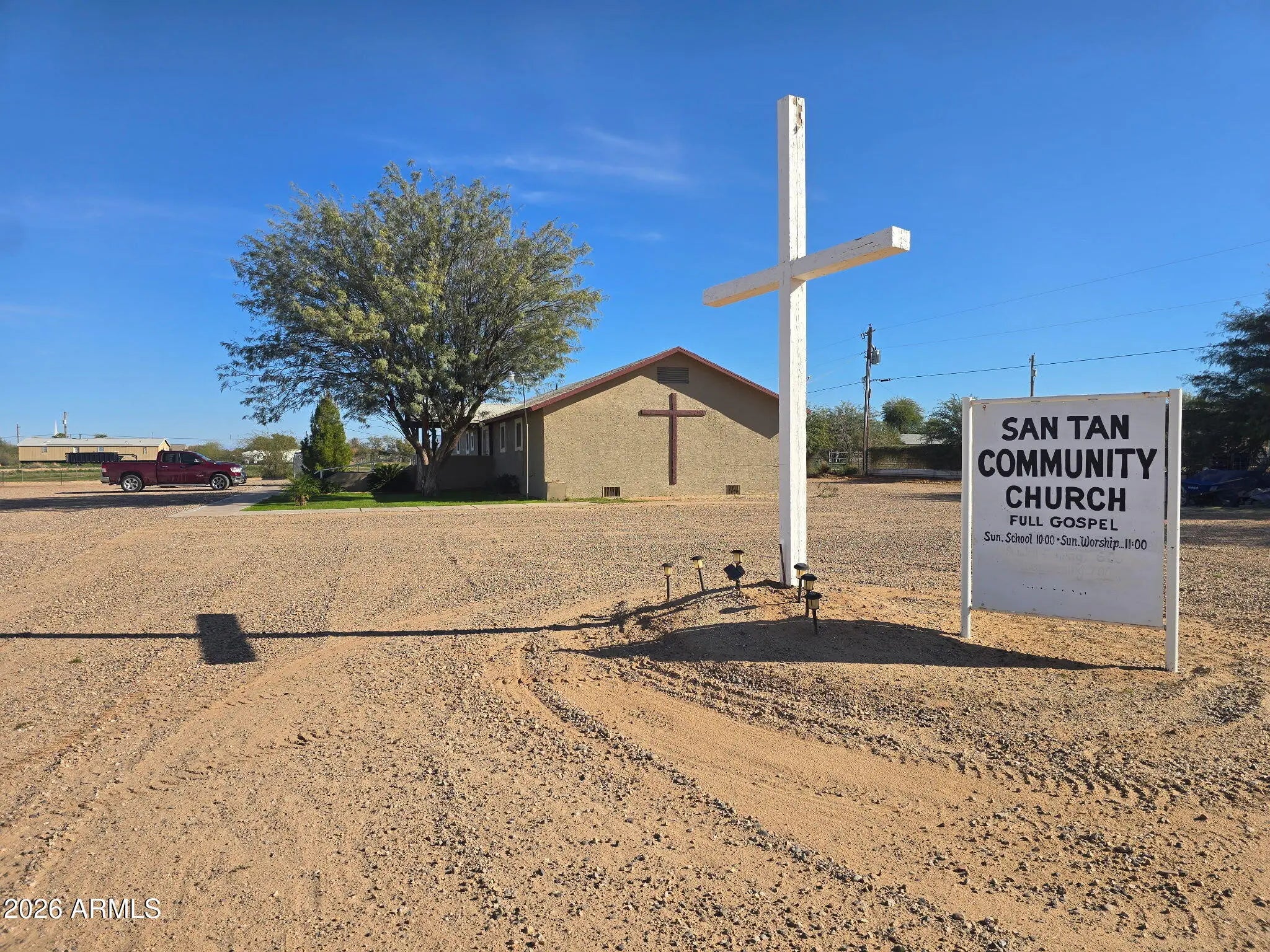CHURCH FOR SALE! (Or Home) :) Has an attached parsonage with 2 bedrooms, a den, and a kitchen. Perfect for provident living with pasture/correl, chicken coop, goat pen, and hose bibs for nurting plants and animals. County has confirmed RU43 Zoning, which means that horses are allowed! :) Facilities are completely fenced in and include several storage buildings, including a greenhouse, RV parking is covered and so the patio. Propery is on city water with a 1.25' water line for more abundant water flow. Sanctuary comes with 2 restrooms, a stage area with podium and lots of room for a congregation and for activities of fellowship. Or remodel into a single family residence. Plenty of room to install more corrals and even a casita! Plenty of room for toys.