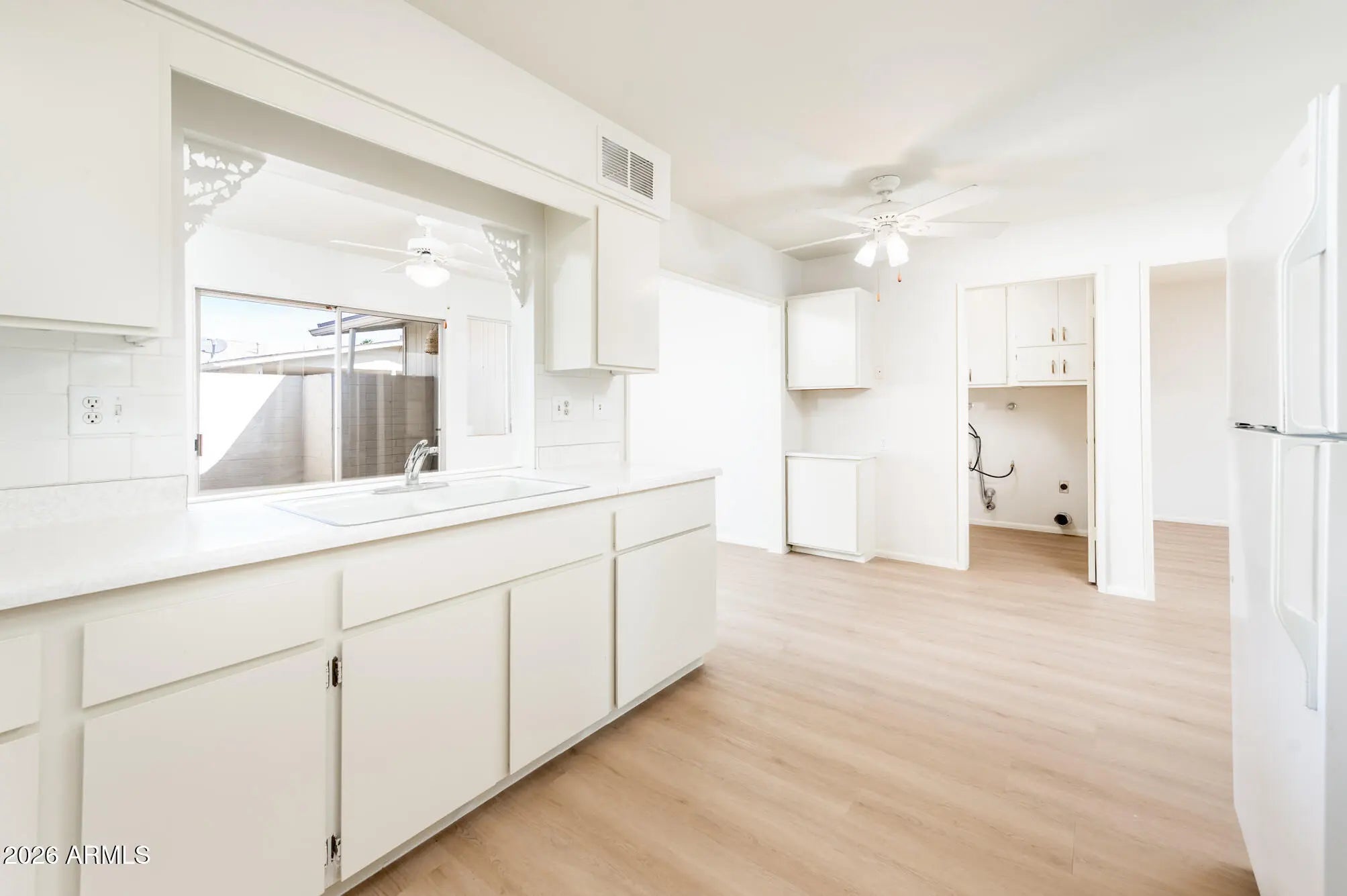 Cute, clean, and move-in ready! This charming 1 bed, 1 bath Sun City home offers 1,019 sq ft of bright, functional living with a desirable north/south exposure and covered carport. Inside, you'll find new laminate flooring, fresh paint, updated light fixtures, and a new toilet—giving the home a crisp, refreshed feel. The galley kitchen features an eat-in nook, while the spacious living room offers plenty of room for both lounging and dining. A bonus Arizona room just off the kitchen opens to the patio and makes the perfect den, office, or hobby space. Indoor laundry adds convenience. A well-designed floor plan, great natural light, and easy-care living make this one a standout—come see it for yourself!