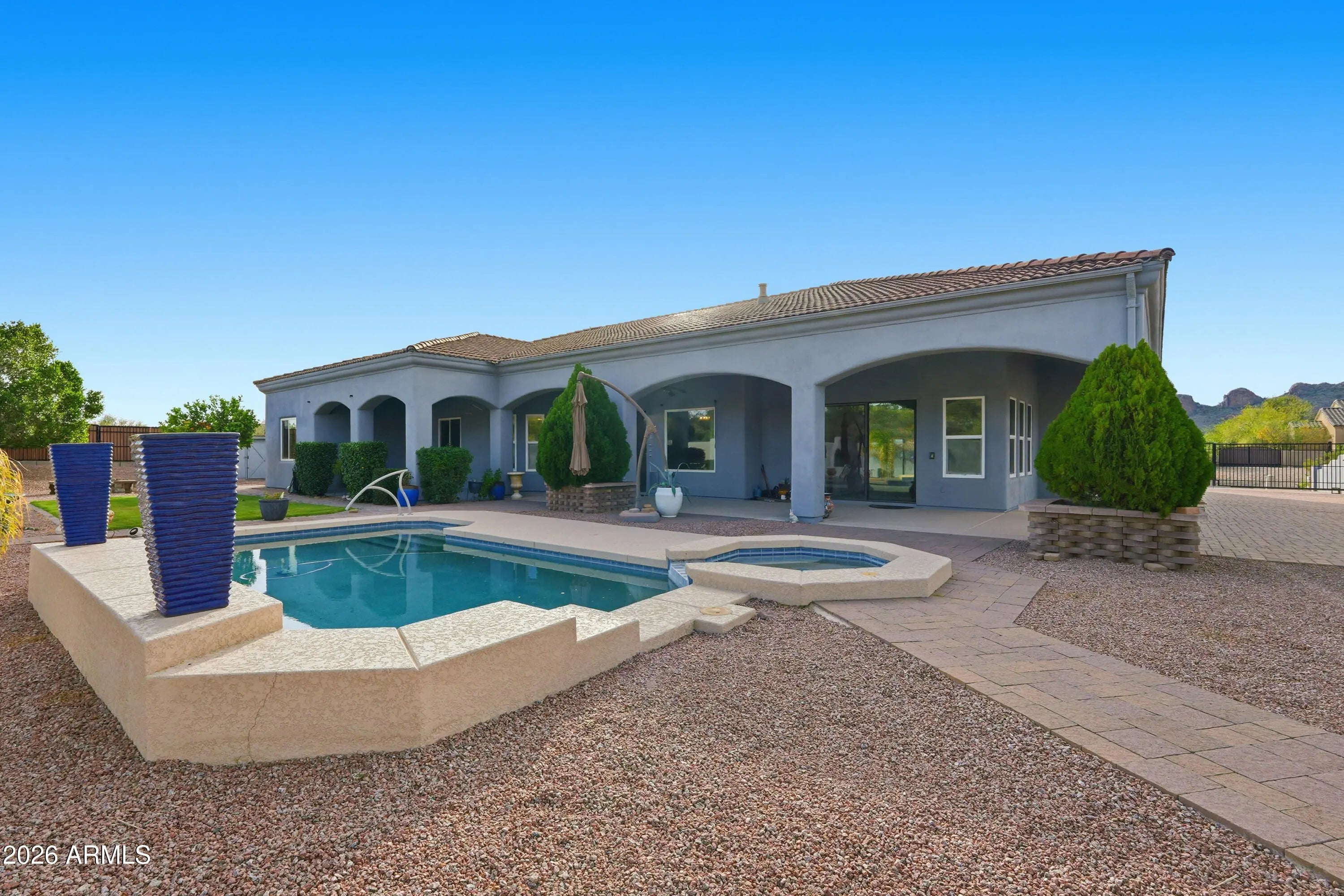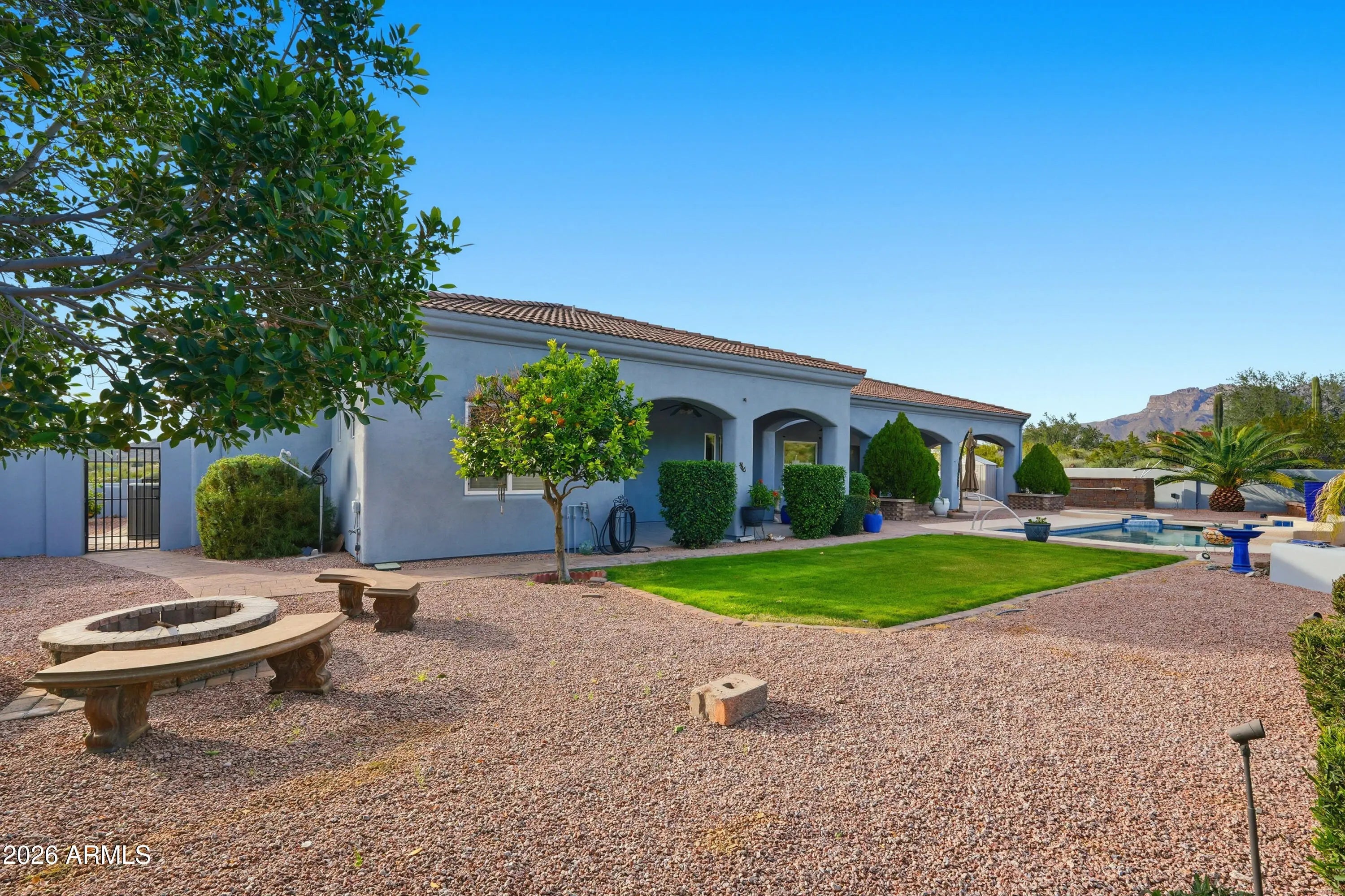 No Application Fees! Exceptional 4 bedroom plus den, 4 bathroom custom Gold Canyon home situated on a premium corner lot with sweeping views of the Superstition Mountains. This spacious single level home offers nearly 4,000 square feet of well designed living space and welcomes you through a circular drive and private courtyard with pavers, pergola, water feature, and landscaped grass areas. This custom home features tile flooring throughout all living and high traffic areas with upgraded carpeting in the bedrooms, high ceilings, neutral paint, upgraded lighting, and excellent natural light throughout. Inside, the layout includes a large front living room with direct backyard access, formal dining area, and a separate living space with gas fireplace. The upgraded kitchen is designed for both everyday use and entertaining, featuring granite countertops and backsplash, beautifully upgraded cabinetry, large island with breakfast bar, built in oven, butler's pantry, walk in pantry, and all stainless steel appliances. The split floor plan offers a private primary suite with its own entrance, an oversized walk-in closet with built in storage, dual vanities, soaking tub, and separate step in shower. A bonus game room with wet bar opens directly to the backyard and pool area. The backyard is designed for Arizona living with an extended covered patio, sparkling pool with waterfall feature and spa, grass area, RV gate, and no neighbors to the rear. A three car extended garage provides excellent parking and storage. Located in the heart of Gold Canyon, this home offers breathtaking views of the Superstition Mountains and easy access to some of the area's best outdoor recreation. Residents enjoy close proximity to hiking and biking trails, golf courses, and the natural desert landscape that makes Gold Canyon unique. Nearby amenities include local dining, shopping, and community parks, while still offering a quiet, scenic setting away from city congestion. This location provides a true Arizona lifestyle with unmatched mountain scenery, open space, and access to outdoor adventure. All Denali Real Estate residents are automatically enrolled in the Resident Benefits Package (RBP) for $55.00/month which includes Renter's Liability Insurance, Credit Building to help boost the resident's credit scores with timely rent payments, up to $1M Identity Theft Protection, HVAC air filter delivery (for applicable properties), our best-in-class resident rewards program, and much more!