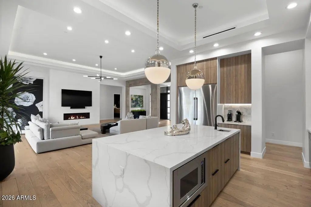 Welcome to Calle Camelia, a sophisticated 2021 build located within highly coveted, Arcadia Proper. This striking, soft contemporary residence features an ideal 3,940 sf. floor plan spanning 4-bedrooms, 4.5-bathrooms, with an oversized 3-car garage. Upon entry you'll be greeted by a custom pivot door, soaring 15-foot ceilings, a dramatic gas fireplace, and an elevated view of Camelback Mountain that sits as a constant backdrop of the home. The finishes are top-of-the-line and include white oak hardwood floors, Dacor appliances, designer grade lighting, quartz surfaces, and a custom pantry. Oversized windows & sliding glass doors flood the home with natural light, and allow natural movement between the indoors & outdoors. The backyard is tranquil, yet perfect for entertaining with its heated pool & spa, fire pit, built-in bbq/bar, and a designated grass area that's perfect for kids. Technologically savvy, the home comes equipped with Lutron window shades, Control4 system, Ring cameras, and an owned alarm. This home is the ideal balance of easy-to-maintain, modern luxury in a prestigious family-friendly location.