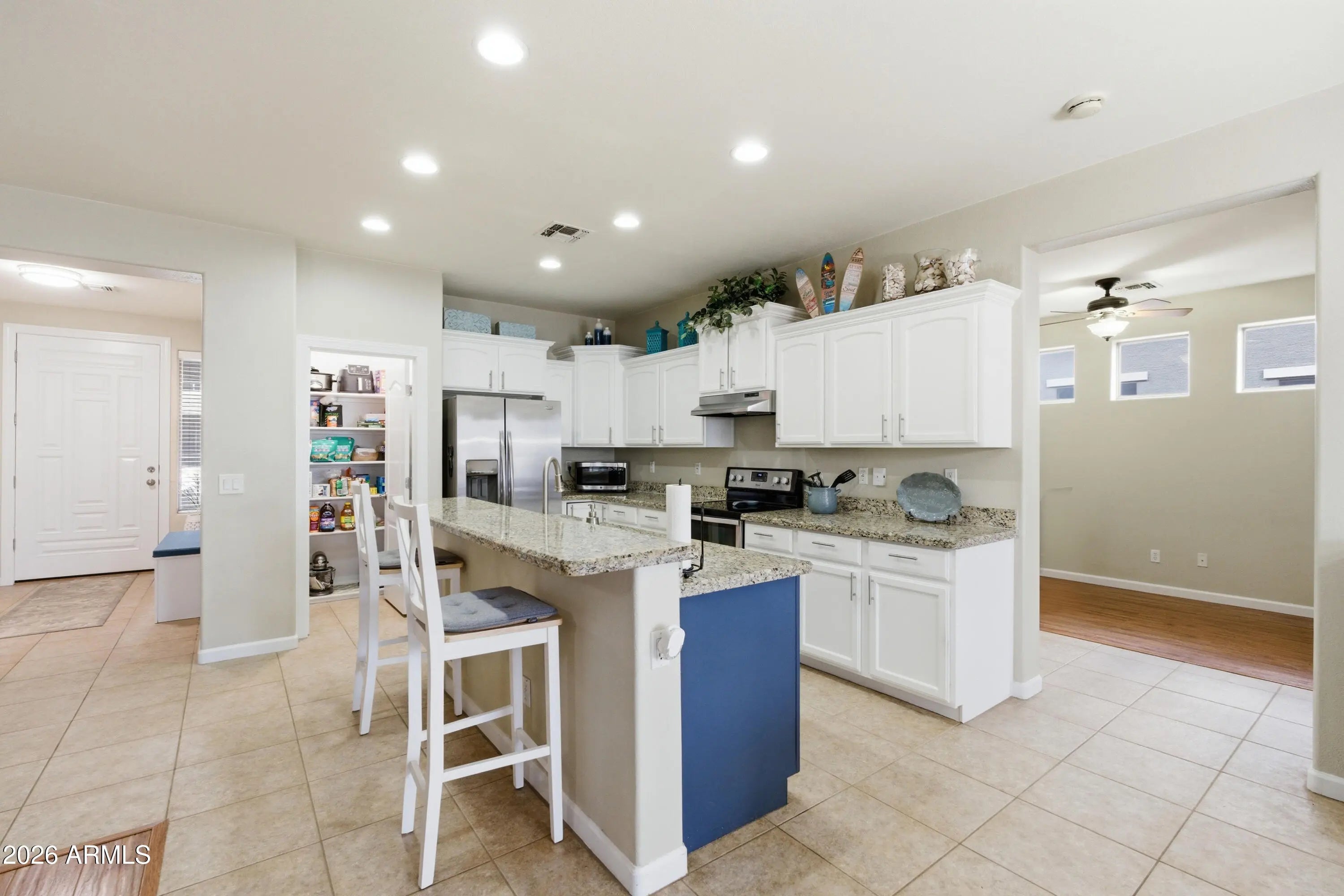 Light, bright, and impeccably maintained! This move-in-ready gem features 2x6 construction and a grand oversized front door. Inside, the 10-foot ceilings create an airy, custom feel throughout. The split floor plan offers 4 spacious bedrooms plus a versatile den--ideal for a home office, playroom or flex space. At the heart of the home, the gourmet kitchen boasts white shaker cabinets, granite countertops, and premium stainless appliances, flowing seamlessly into the expansive great room. Step outside to a lush backyard with green grass and an oversized patio, perfect for enjoying a cup of coffee under the Arizona sun. Located just minutes from the shopping and dining at Queen Creek Marketplace. This home is quality craftsmanship meets a prime location!