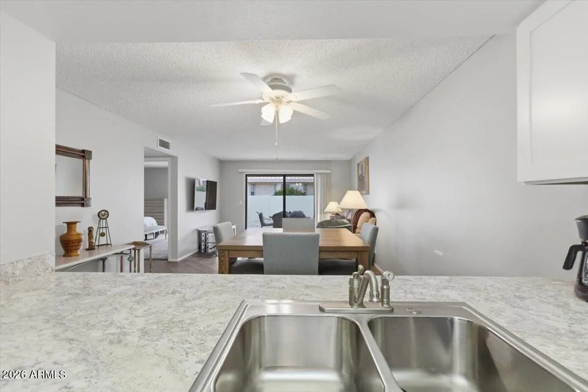 Move-in ready and fully furnished (if desired) patio home in the highly sought-after Fountain of the Sun, a gated 55+ community offering golf and resort-style amenities. Thoughtfully renovated over the last decade, this home features a kitchen updated with modern cabinets and stainless steel appliances, refreshed flooring throughout, and a primary bathroom remodeled in 2025. A new water heater was installed in 2023 for added peace of mind. Enjoy low-maintenance living with access to community pools and beautifully maintained common areas. No pet community.