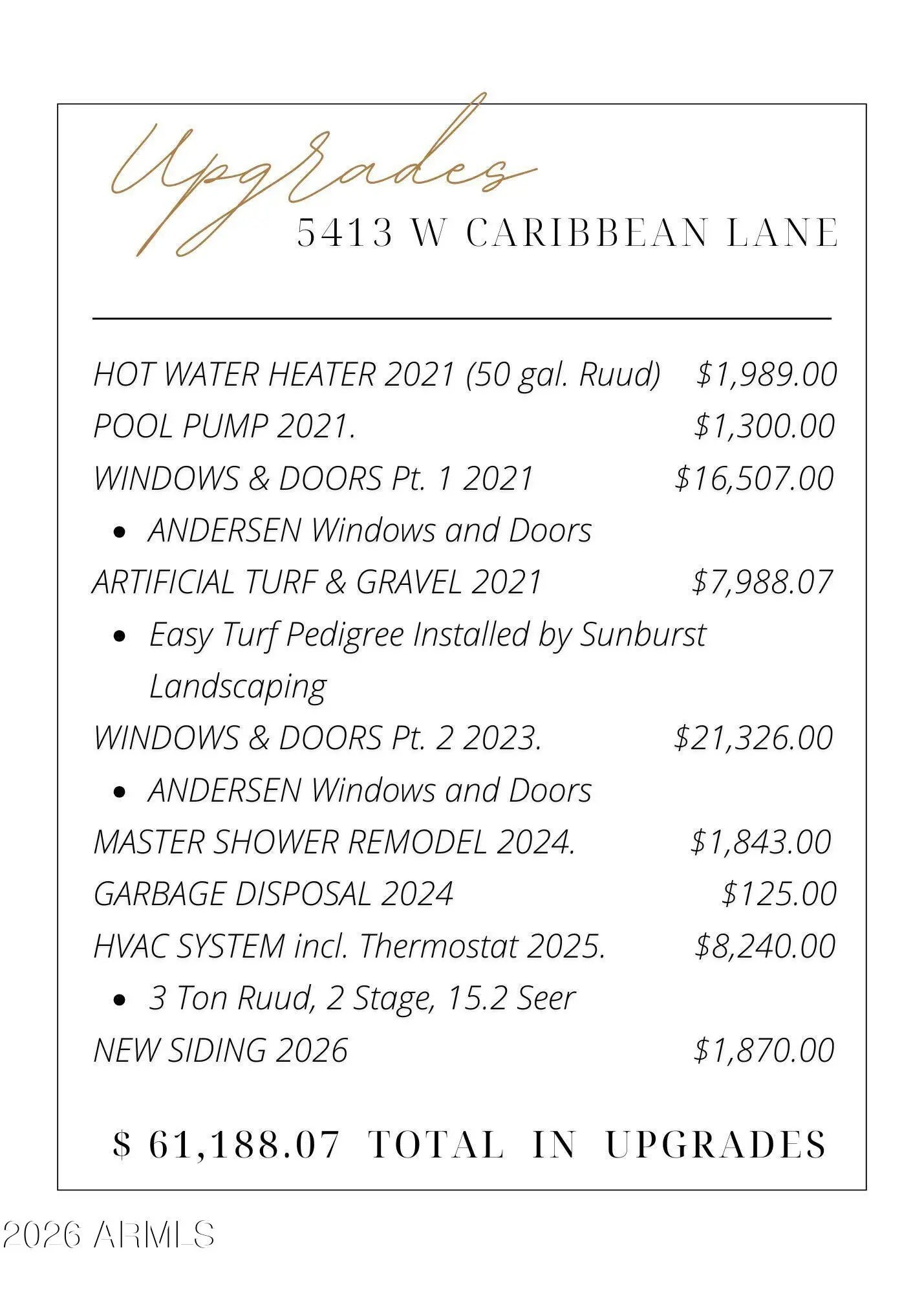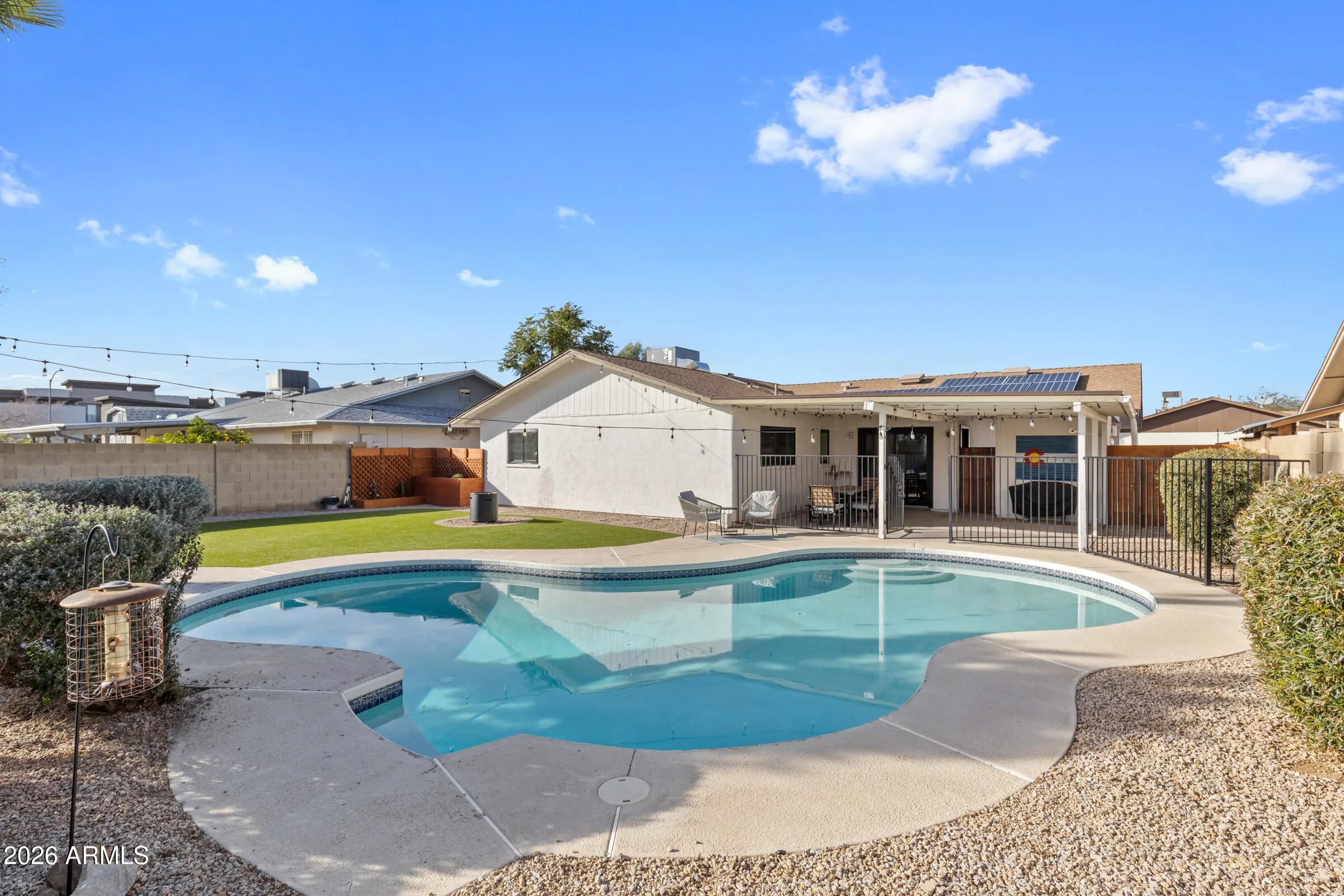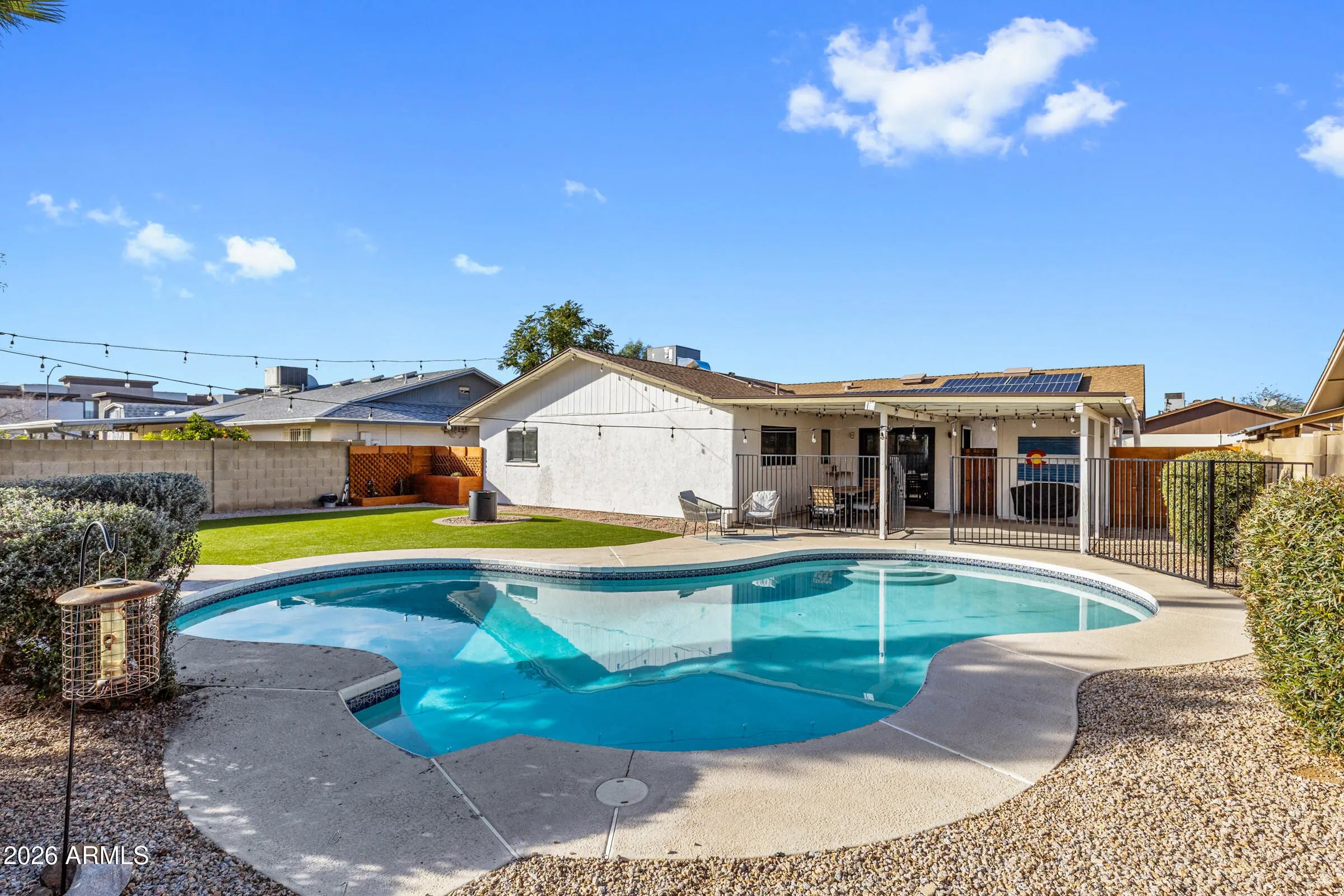 Experience refined living with exceptional efficiency in this beautifully upgraded home. Enjoy significantly reduced energy costs with an owned solar panel system--no monthly lease-- complemented by new Andersen windows and doors (2023) and a new 3-ton HVAC system rated at 15.2 SEER (2025) for year-round comfort. The primary bathroom was tastefully remodeled in 2023, while a new hot water heater (2021) adds peace of mind. Step outside to your private backyard oasis featuring a large pool with a new pool pump (2021), surrounded by a thoughtfully redesigned landscape completed in 2023, including premium EasyTurf Pedigree for low-maintenance, year-round beauty. This home seamlessly blends modern upgrades, energy efficiency, and resort-style outdoor living.
