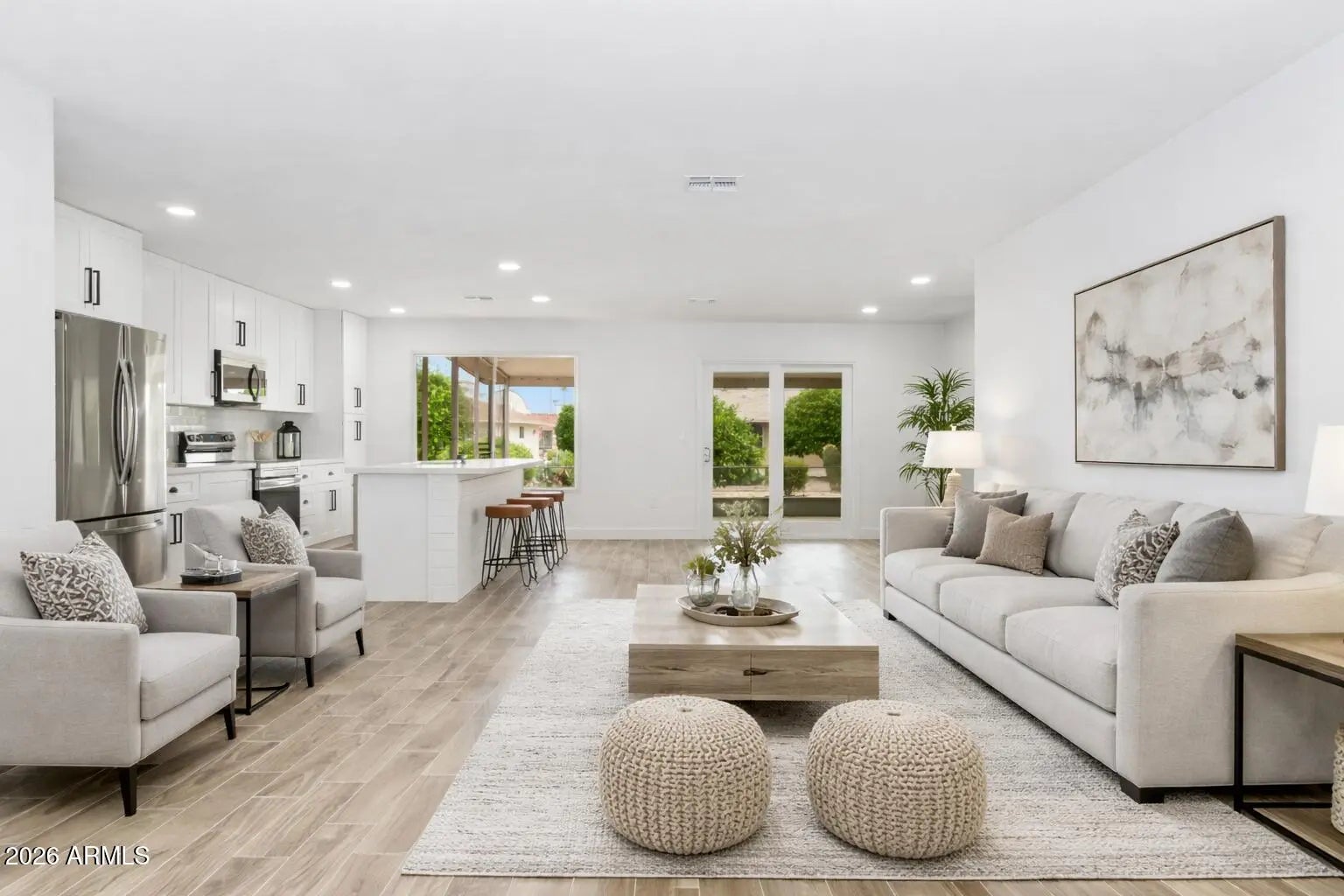 Welcome to one of the best remodeled homes in Sun City. Fully transformed in 2023, this move-in-ready residence showcases a modern, cohesive design with quality upgrades throughout. The inviting entry leads into a stunning kitchen featuring all-new cabinetry, white quartz countertops, and stainless-steel appliances. New tile flooring, baseboards, doors, fresh texture, and interior paint elevate the home with a clean, contemporary finish. Both the primary and guest bathrooms have been completely remodeled, creating a spa-like feel. With a spacious, flexible layout, this home offers the perfect opportunity to personalize and enjoy. Rarely does a remodel of this caliber come to market in Sun City—this one truly stands out.