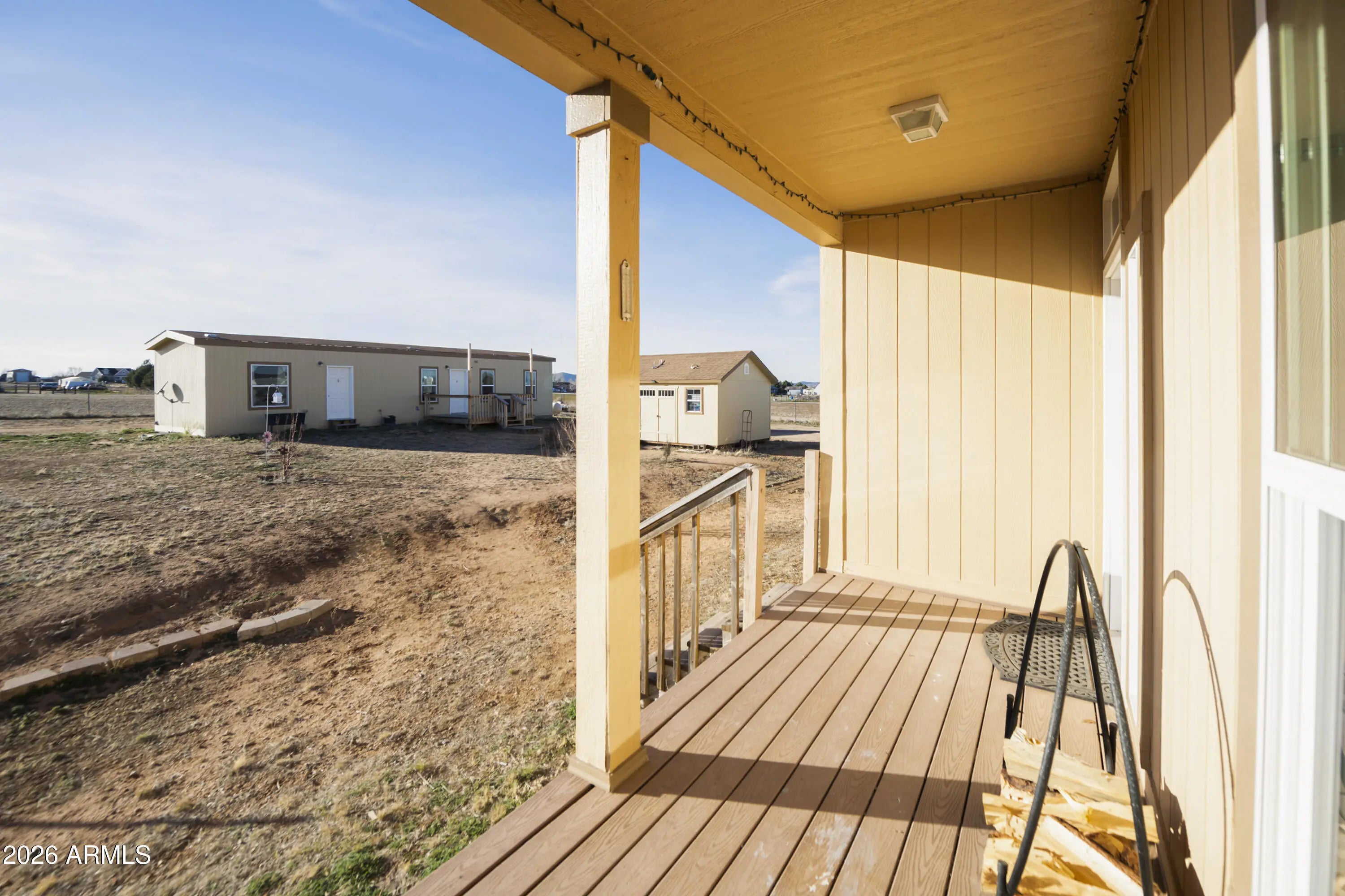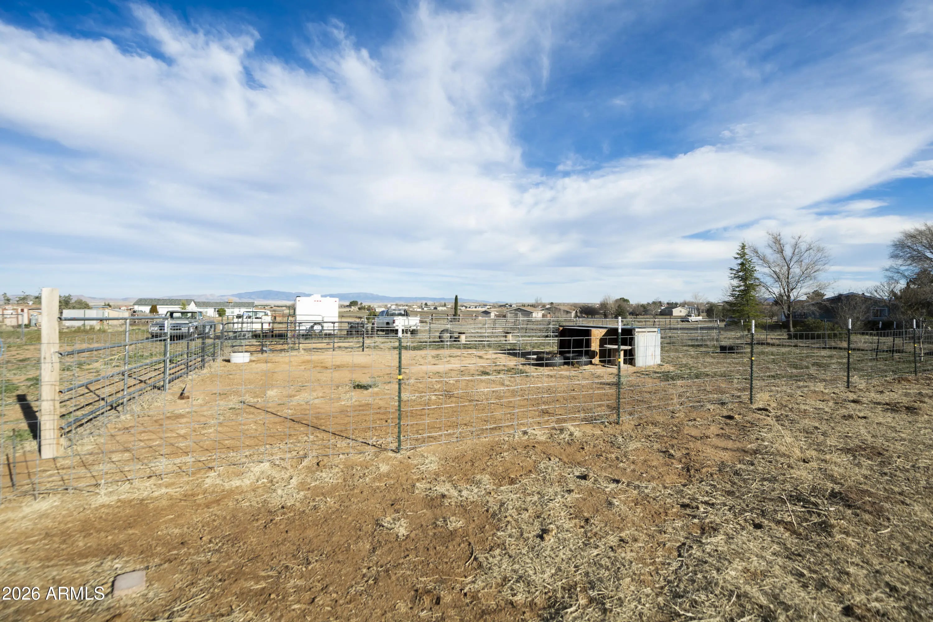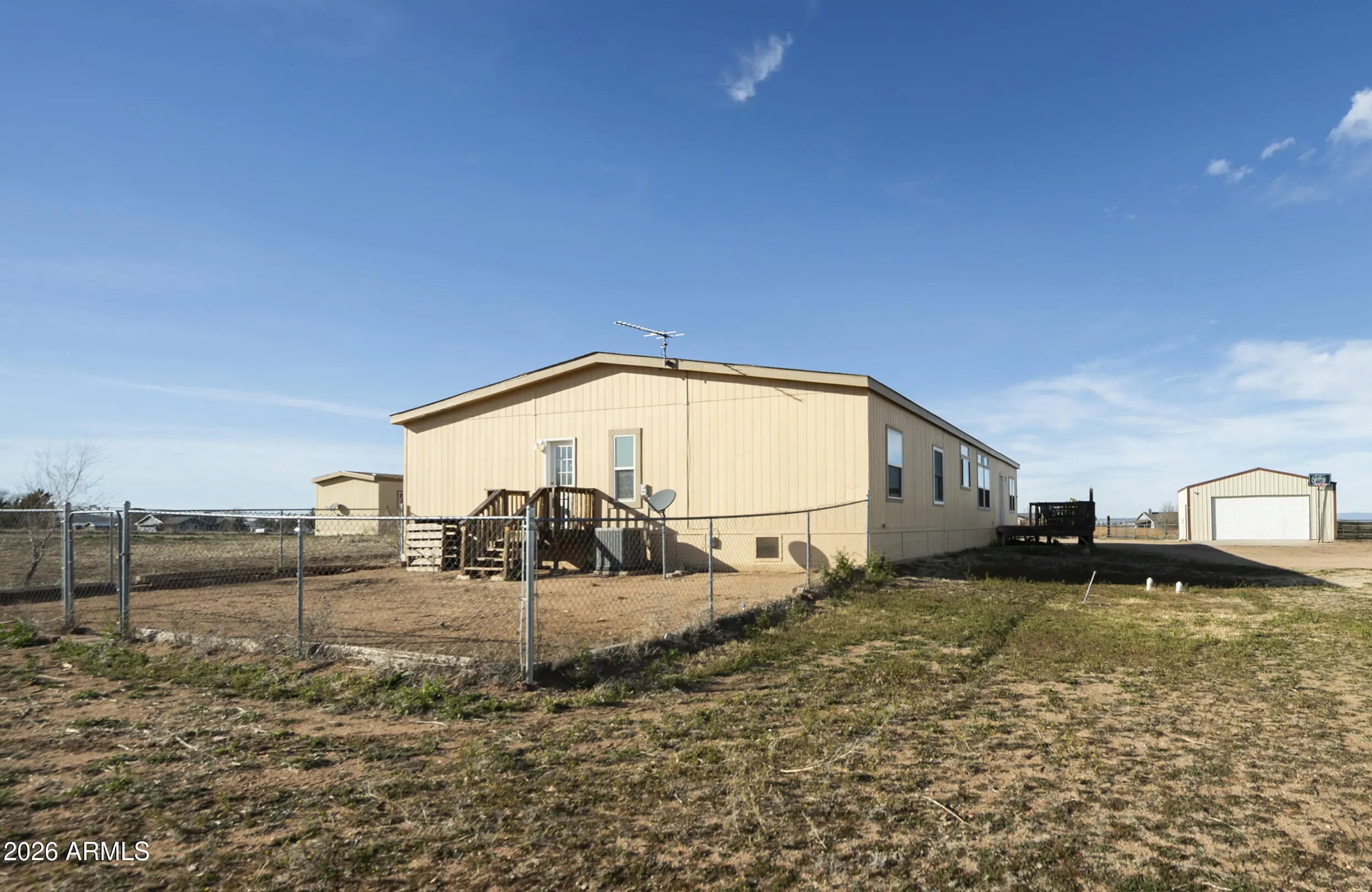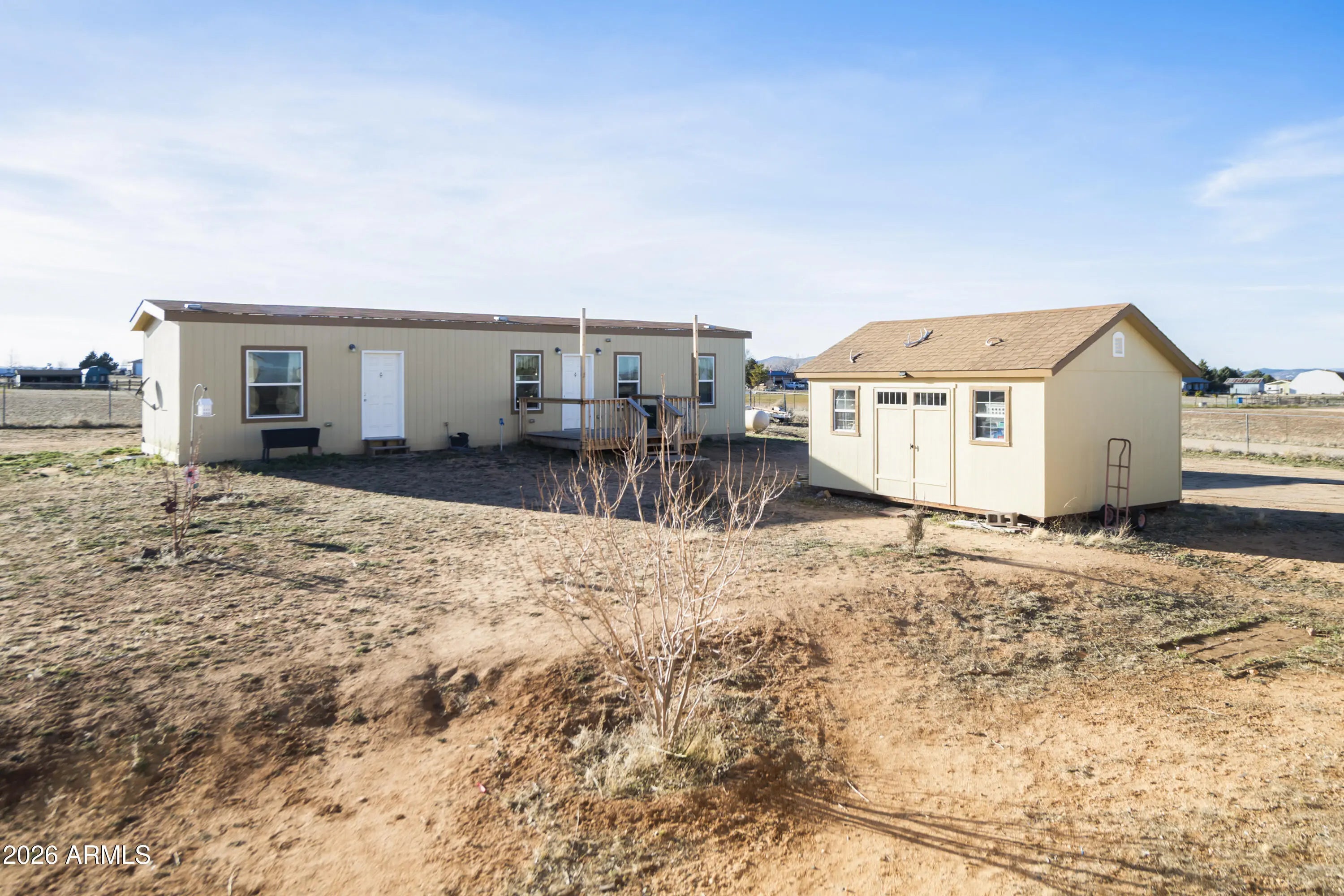 Welcome to this exceptional Chino Valley property offering space, flexibility, and self-sufficiency on 2.56 fully fenced acres. The main home, installed in 2018, features an expansive 2,976 square feet with 4 bedrooms, 3 bathrooms, 2 family living areas (Living room and Family Room) and a bonus room, while the separate guest home--installed in 2020--adds an additional 832 square feet, ideal for multi-generational living or rental income. The property is thoughtfully equipped with a private well, two septic systems, two propane tanks, and RV hookups--perfect for guests, travel enthusiasts, or additional flexibility. A 24x24 two-car metal garage provides ample room for vehicles, storage, or a workshop. Property is well laid out for farm animals, has a separately fenced backyard for dogs, and multiple enclosures for large animals. One enclosure includes shaded overhead cover. With open land and multiple living options, this property presents a rare opportunity for a mother-in-law setup, income-producing rental, or peaceful rural living, all while enjoying the charm and convenience of Chino Valley.