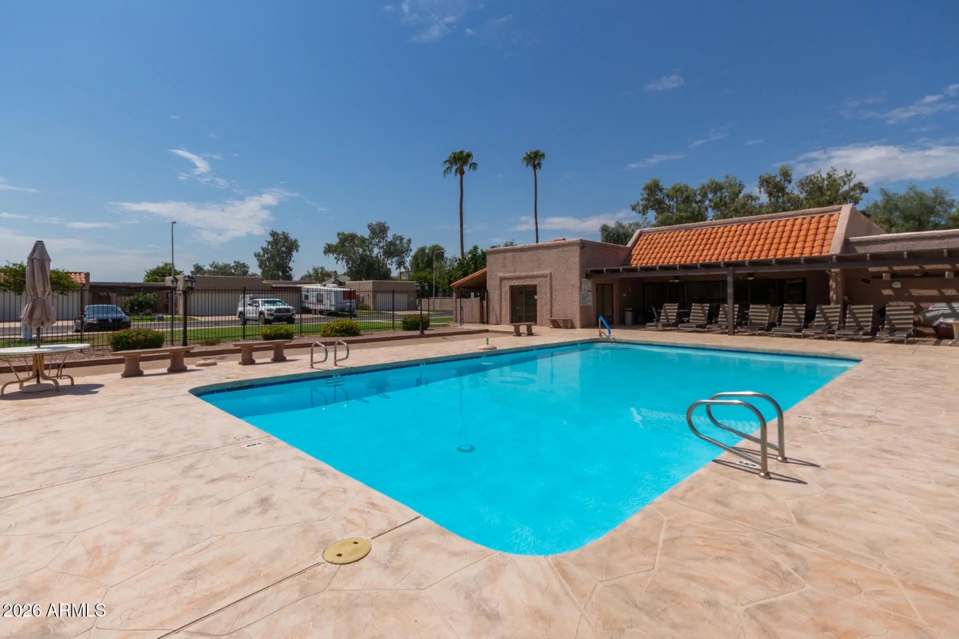 Welcome to 3345 E University Drive #32! This beautifully maintained home offers spacious bedrooms, 2 bathrooms, and a versatile secondary room featuring a built-in Murphy bed with desk -- perfect for guests, hobbies, or a home office. Situated on a desirable corner lot directly across from the community center and sparkling pool, you'll love relaxing on the patio while enjoying the peaceful sounds of the backyard waterfall feature. The natural light throughout creates a bright and inviting atmosphere. The 2-car garage includes built-in cabinetry and a dedicated workshop area, offering excellent storage and space for projects. Conveniently located near shopping, dining, medical facilities, golf, and freeway access -- this is low-maintenance living in a prime location. Come see it today!