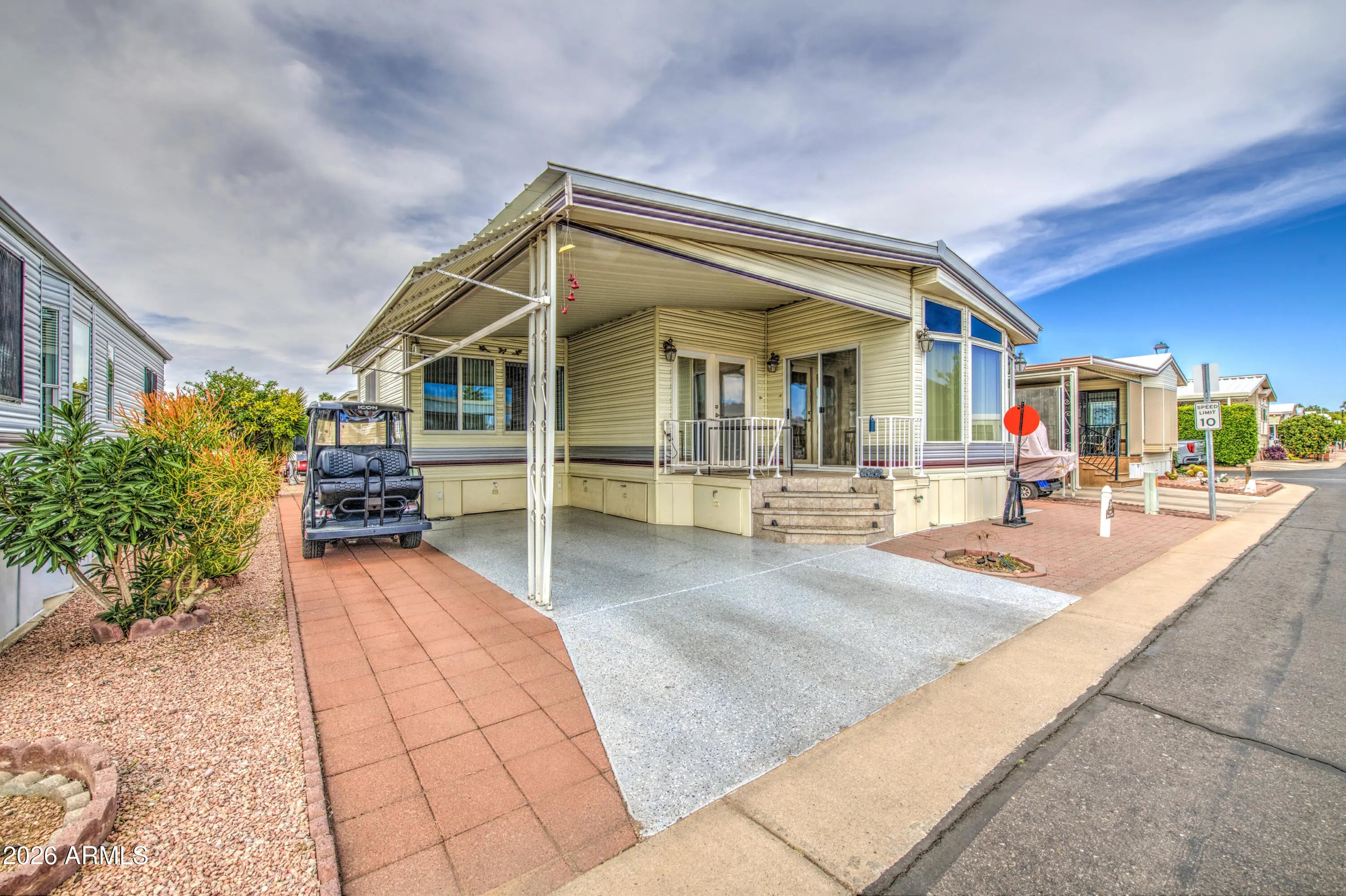 This East facing home is a real gem in Carriage Manor Resort, a premier 55+ Community where you OWN THE LAND! It has a lovely tile and stone deck and pavers around the entire home, not to mention a metal roof that will last forever. The very large AZ room that was added in 2004 has a coat closet as well as an additional 1/2 bath with a full size washer and dryer. The A/C was replaced in 2021 and this home comes with a 40 gallon hot water tank. The kitchen has a stainless steel fridge and dishwasher and beautiful counters and tiled backsplash. The cabinets are in amazing condition. This is a MUST see!! Carriage Manor has 24/7 on site security, a heated SALTWATER pool/spa, fitness facility, Tennis, Pickleball, Bocce, Shuffleboard, Golf Club, Billiards, Lapidary/Silversmith, Ceramics, Glass Art, Sewing, Wood shop, Bingo, Dances parties & many more activities & amenities.