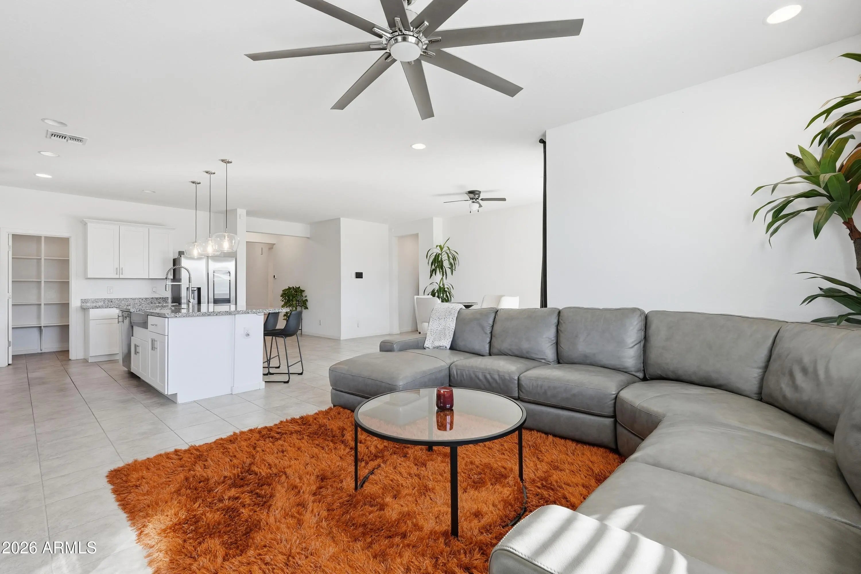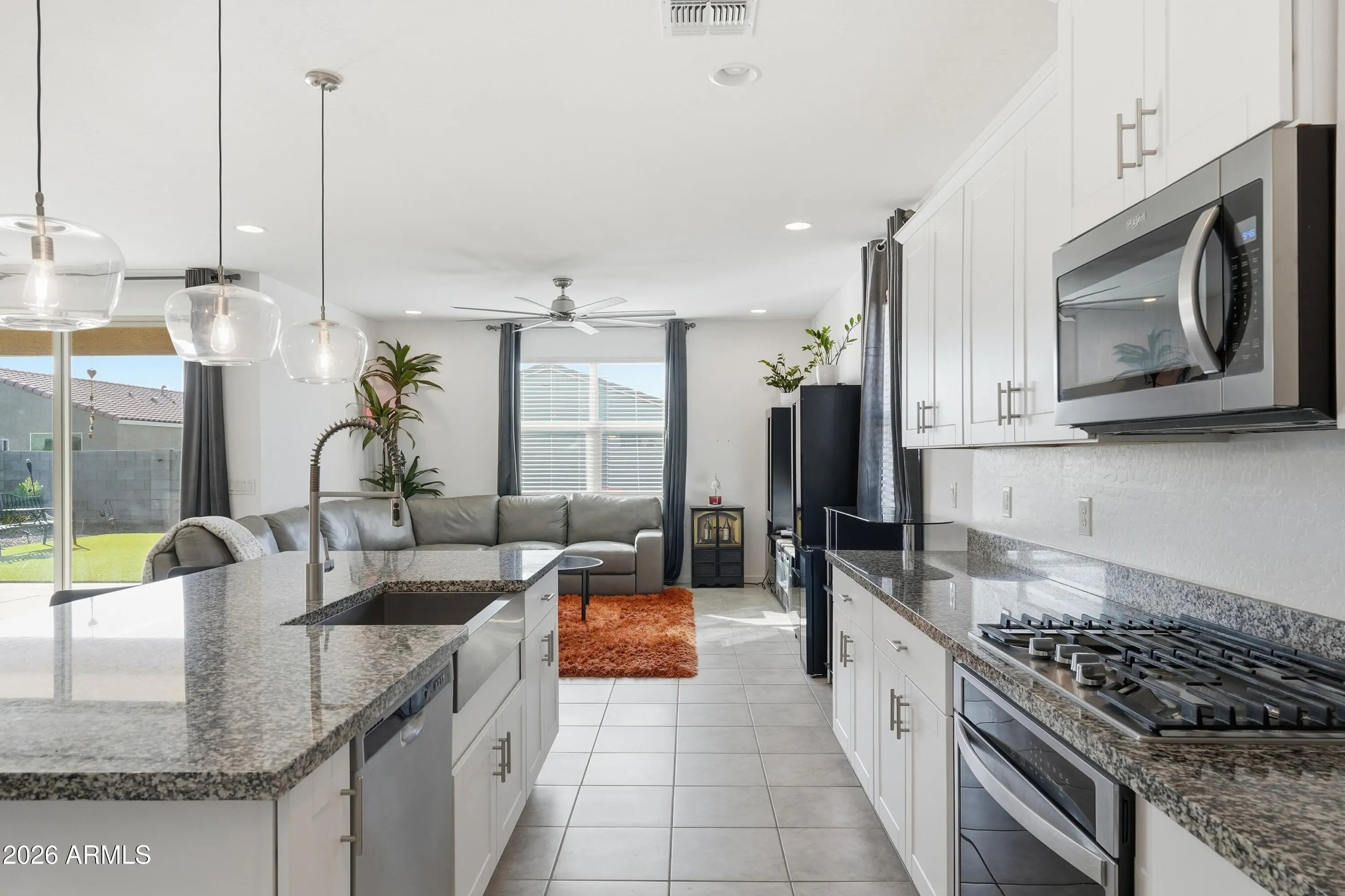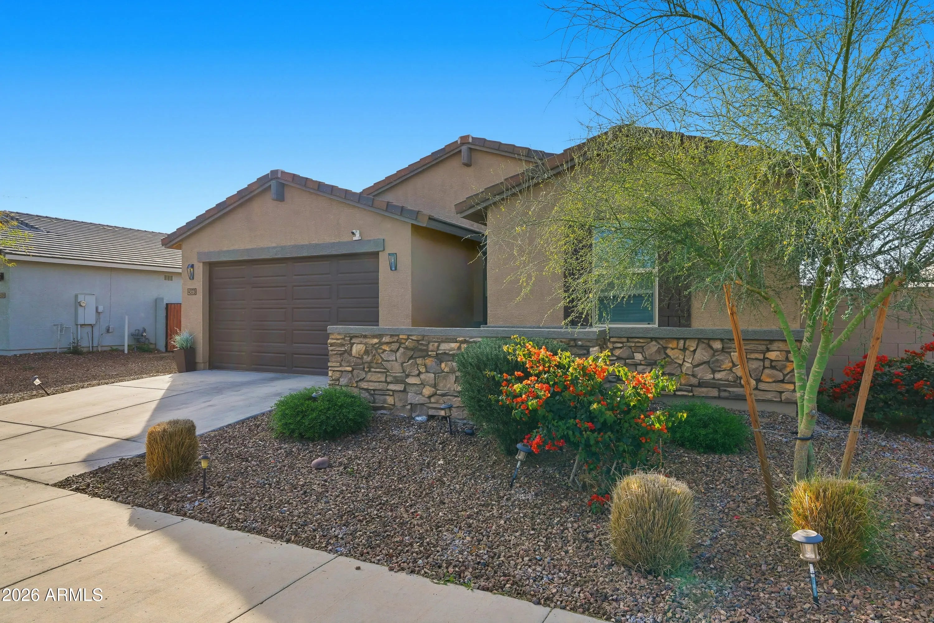 Single-level home built in 2022 and located in a gated San Tan Valley community. This 4 bedroom, 3 full bathroom home offers 2,342 square feet with a desirable split floor plan, including a private suite with its own bathroom and a flex room between two secondary bedrooms. Tile flooring throughout main living areas and smart home features including keyless locks, thermostat, doorbell and garage opener. The kitchen features white cabinetry, granite countertops, a gas range, large island, and walk-in pantry. The primary suite includes a walk-in shower, garden tub, and oversized walk-in closet. The backyard is beautifully landscaped with pavers, travertine, and artificial turf. RV gate with allowable RV parking and extra parking space. Energy-efficient spray foam insul A single-level home that truly checks all the boxes, located in a gated community in San Tan Valley and built in 2022. This thoughtfully designed 4 bedroom, 3 full bathroom home offers 2,342 square feet of open, functional living space with a desirable split floor plan. A private suite with its own bathroom provides ideal separation for guests or multigenerational living, while a flex room perfectly positioned between two secondary bedrooms adds versatility for a home office, playroom, or additional living space. Tile flooring runs throughout the main living areas, providing both durability and a clean, cohesive look. The home features smart home conveniences, including keyless door locks, a smart thermostat, doorbell, garage opener, and connected appliance, offering everyday ease and efficiency. The kitchen is light, bright, and highly functional with white cabinetry, granite countertops, a gas range, a large center island, and a walk-in pantry. The primary suite serves as a true retreat with a walk-in shower, garden tub, and an oversized walk-in closet. The backyard has been beautifully landscaped with pavers, travertine, and artificial turf, creating a polished outdoor space ideal for entertaining or low-maintenance enjoyment. An RV gate with allowable RV parking offers rare flexibility and can also be used for additional parking. This energy-efficient home includes spray foam insulation, enhancing comfort and efficiency year-round. The community offers impressive resort-style amenities, including a heated pool, gym, indoor and outdoor community kitchens, a living room and study area, basketball courts, a disc golf course, children's playgrounds, biking and walking paths, and multiple greenbelts. Conveniently located just minutes from Schnepf Farms, the Olive Mill, Queen Creek Marketplace, and easy freeway access.