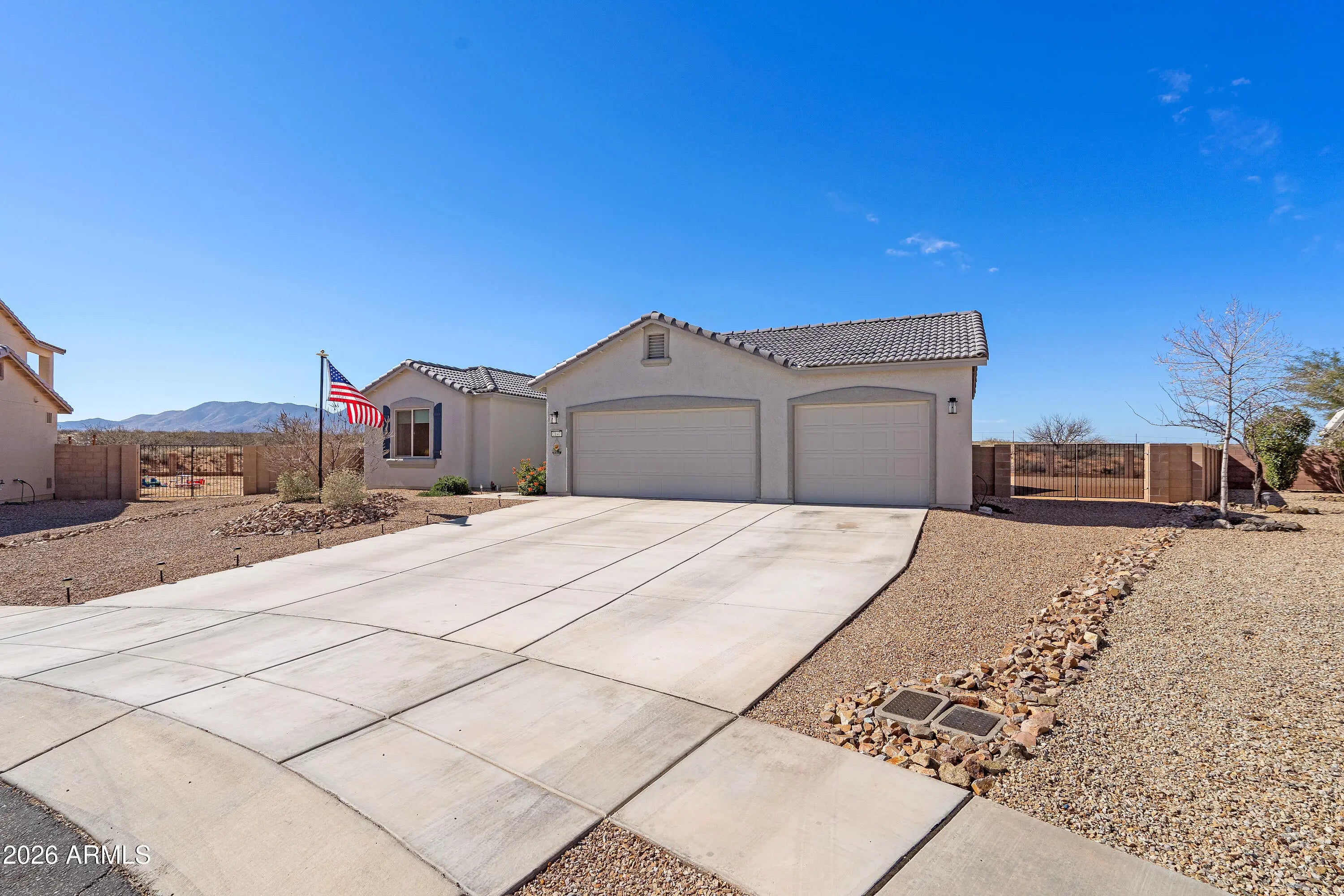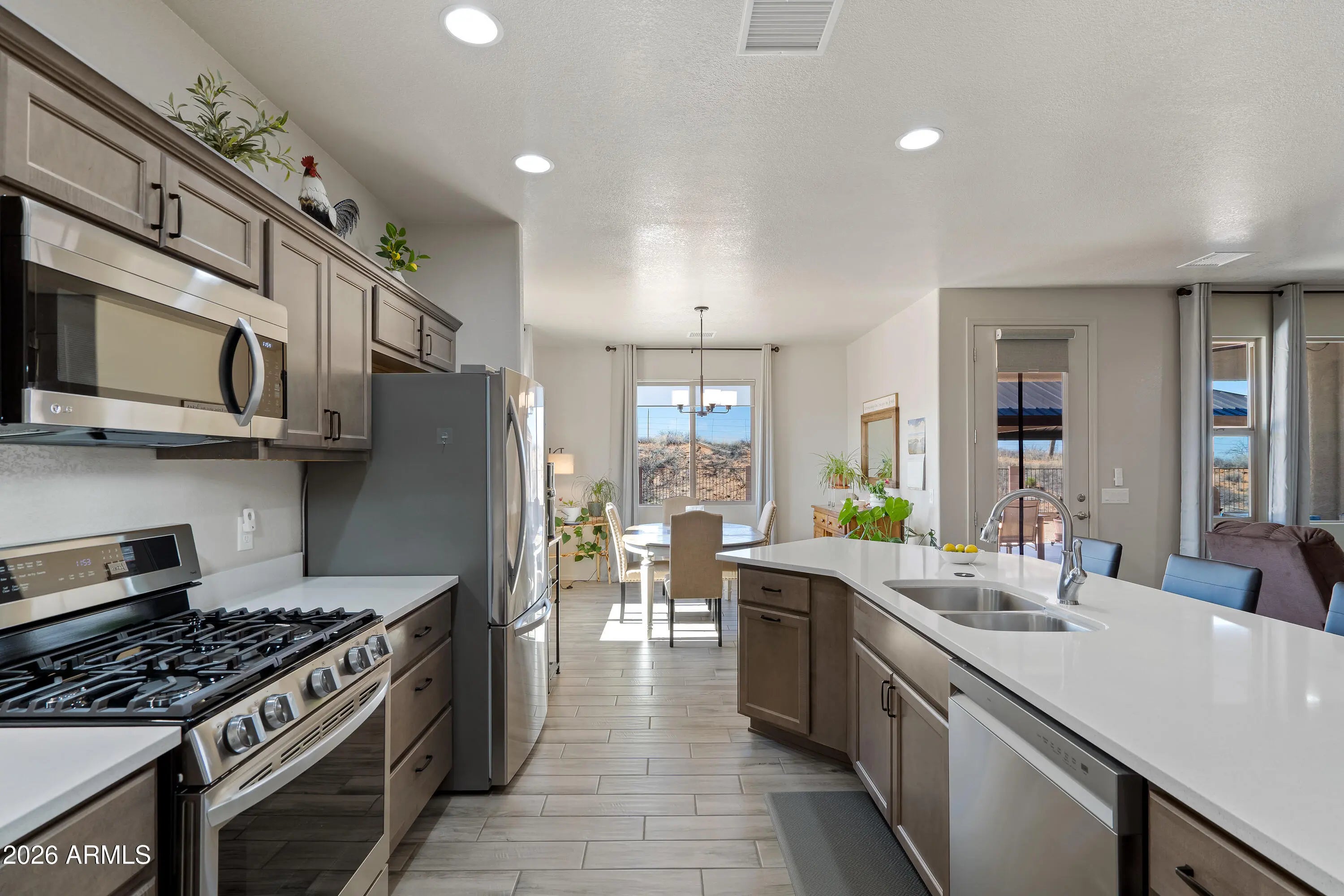 THIS IS IT! UNOBSTRUCTED VIEWS IN ALL DIRECTIONS! ELEVATED LOT w/ NO REAR NEIGHBOR! This beautifully upgraded home offers a perfect blend of comfort, functionality, and modern design, with over $52,000 in thoughtfully selected enhancements. The open-concept floor plan is elevated by tile flooring throughout the entire home, creating a clean, cohesive look that is both stylish and easy to maintain. The kitchen is a true standout, featuring maple cabinetry with crown molding, quartz countertops, a large undermount sink, pots and pans drawers, and a pull-out trash cabinet for added convenience. Cooking enthusiasts will appreciate the stainless steel LG smart gas range with true convection, air fry, and a powerful 20K BTU burner, along with a sleek upgraded Delta kitchen faucet. A dedicated refrigerator/freezer circuit adds peace of mind and functionality. The primary suite has been designed as a private retreat, highlighted by a walk-in tiled shower with a pony wall and glass enclosure, upgraded tile flooring, and an executive-height vanity with an undermount sink. Both the hall and primary baths feature granite or quartz countertops, executive-height vanities, and modern undermount sinks for a clean, upscale finish. Additional upgrades include ceiling fan prewiring in the living room, dining area, primary bedroom, secondary bedrooms, and patio, a water softener loop, additional recessed lighting in the primary shower, and an eave outlet with switch for holiday lighting. Outdoor living is enhanced with an expanded uncovered concrete patio, perfect for relaxing or entertaining. The home was strategically positioned farther back on the lot to accommodate an expanded 3-car garage, complete with a garage door opener and a convenient pedestrian door with light and switch. Wrought iron gates with mesh add both security and style. Finished with upgraded single-color interior paint and additional electrical conveniences, this home offers a rare combination of thoughtful upgrades, modern finishes, and practical designideal for today's lifestyle. Home Starts Here!