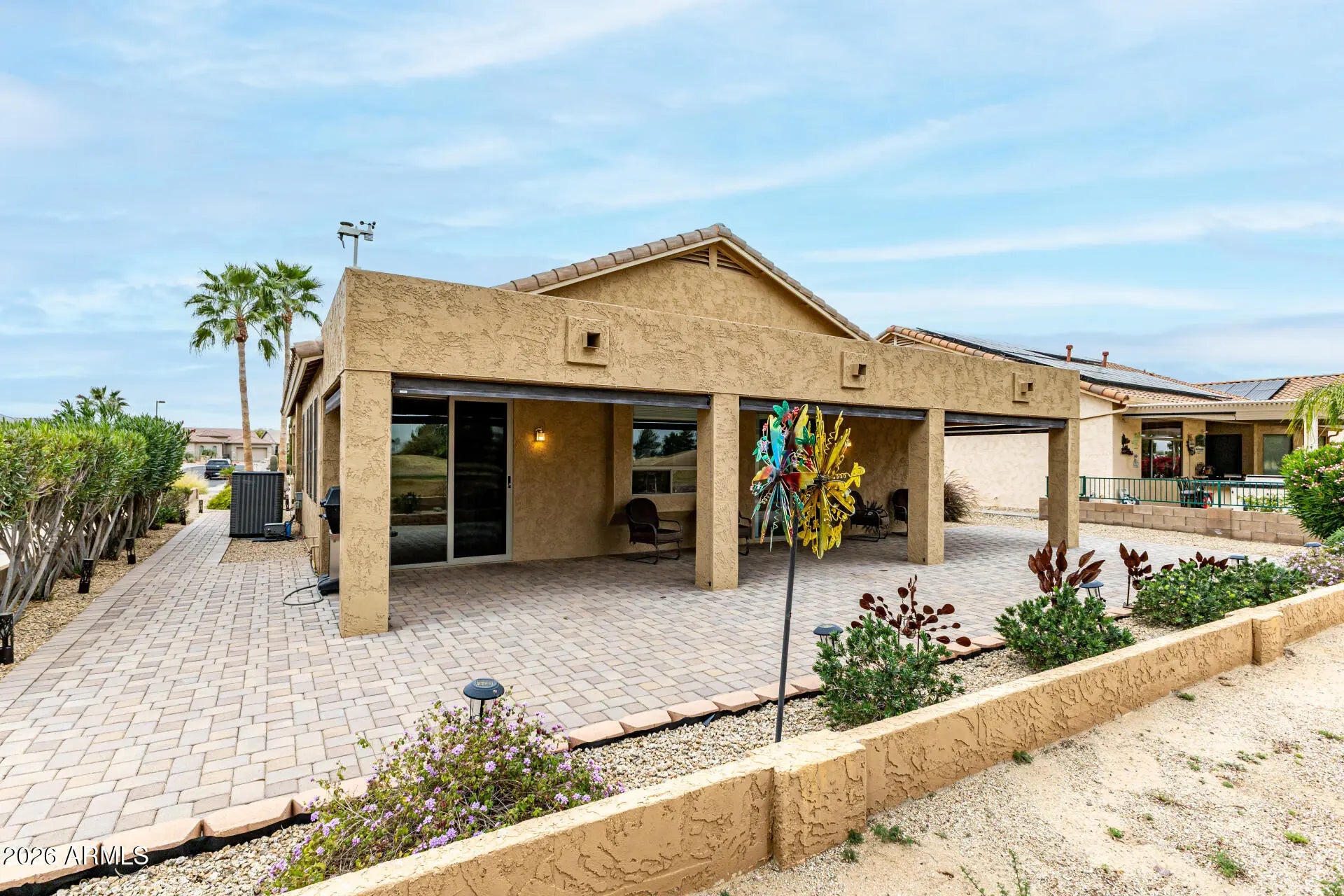 Golf course views, gated active-adult living, and remarkably low APS bills averaging about $40 per month -- this beautifully maintained Arizona Traditions home offers exceptional comfort, efficiency, and lifestyle. This model-perfect La Posada is ideally positioned on the 5th tee box with sweeping golf course views. The highly desirable great room floor plan features 2 split bedrooms, a versatile den/office, 2 baths, and a spacious laundry room, creating an ideal layout for both everyday living and effortless entertaining. The home has been thoughtfully enhanced with seller-owned solar installed in December 2021, delivering impressive energy efficiency and long-term savings. The updated kitchen features granite countertops and updated appliances, while the secondary bathroom showcases a... beautifully upgraded walk-in shower, adding both style and functionality. Outdoor living truly sets this home apart. Relax on the extended covered patio overlooking the fairway, complete with remote-control patio shades, cooling misters, and a beautifully pavered low-maintenance backyard designed for easy year-round enjoyment. The backyard's desirable eastern exposure provides bright mornings and welcome protection from the late afternoon sun, creating a comfortable outdoor retreat throughout the seasons. Additional highlights include extensive tile flooring, oak cabinetry, built-in surround sound, custom window coverings, and upgraded ceiling fans throughout. Major system updates provide added peace of mind, including a new HVAC system (2025) and partial new roof (2021).