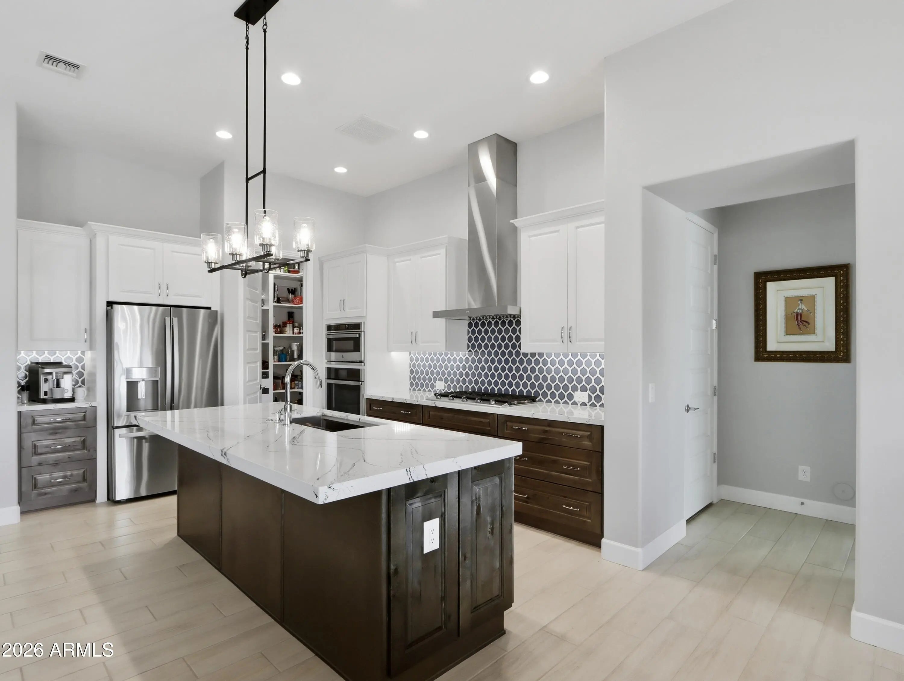 This stunning Mandera model offers a rare opportunity to own an exceptional home in Tuscany Falls at PebbleCreek, the award-winning resort community. Thoughtfully upgraded and impeccably maintained, it delivers refined comfort and effortless resort-style living. At the heart of the home is a chef's kitchen featuring 42'' upper cabinetry with crown molding, dovetail drawers, soft close hinges, pull out shelving, two tone cabinetry, and upgraded hardware. Quartz countertops with a full height backsplash, a spacious island, and stylish pendant lighting offer both beauty and functionality. GE stainless steel appliances include a 5-burner gas cooktop, and the generous breakfast bar and dining nook easily accommodate a full-size table —perfect for effortless entertaining. A charming brick paved walkway and striking front elevation set the stage as you step inside to soaring ceilings, abundant natural light, and designer finishes throughout. The open concept layout is enhanced by 8-foot sliding glass doors that create a seamless connection between indoor and outdoor living. Every detail has been carefully selected, from custom window treatments and tall 5½ inch baseboards to designer lighting, ceiling fans, and elegant 8-foot six panel interior doors. The expansive great room flows naturally from the kitchen, filled with sunlight through tall glass doors and framed by custom window treatmentsan inviting setting for relaxing or gathering with guests. A beautifully designed built in wine bar with wine fridge and additional cabinetry completes the space. The luxurious owner's suite serves as a private retreat, oversized windows, plantation shutters, and a spa inspired en suite bath with a large tile surround shower, dual sink vanity, and a custom walk-in closet with extensive built ins. Step outside to a resort style desert oasis, the true showstopper of the home. With southwestern exposure, the backyard features an extended travertine patio, low maintenance desert landscaping, a filtered misting system, and electronic remote sunshadesenhancing comfort and enjoyment on warm desert days. Additional highlights include an air conditioned 3 stall garage with dedicated golf cart parking, epoxy coated floors, floor to ceiling cabinetry, and a workbench ideal for DIY enthusiasts. The home also includes rain gutters and an H2O Concepts whole house water filtration system for added convenience and peace of mind. Experience not only a beautiful home, but also a friendly, welcoming neighborhood that embraces connection, activity, and the best of resort style living.