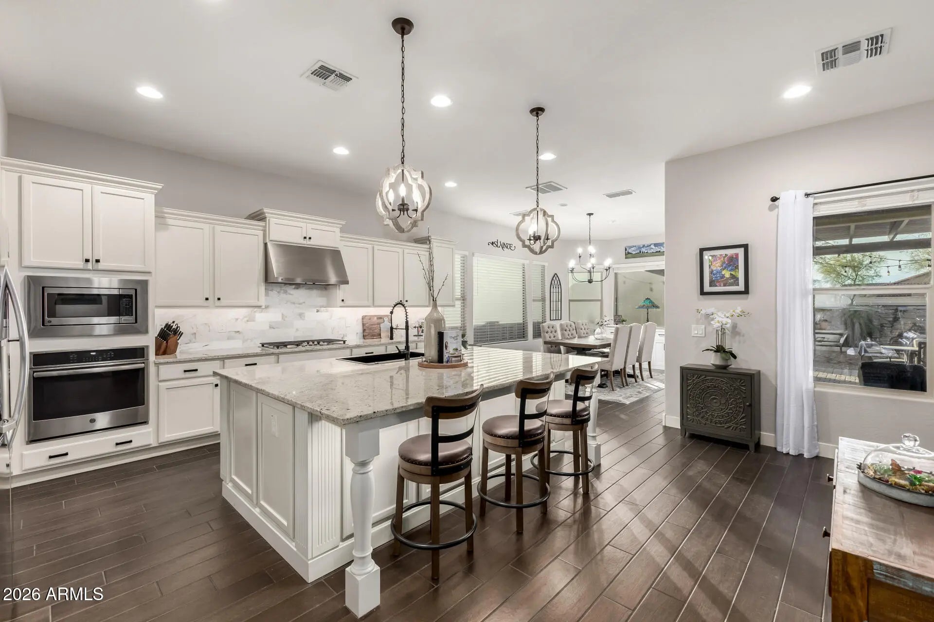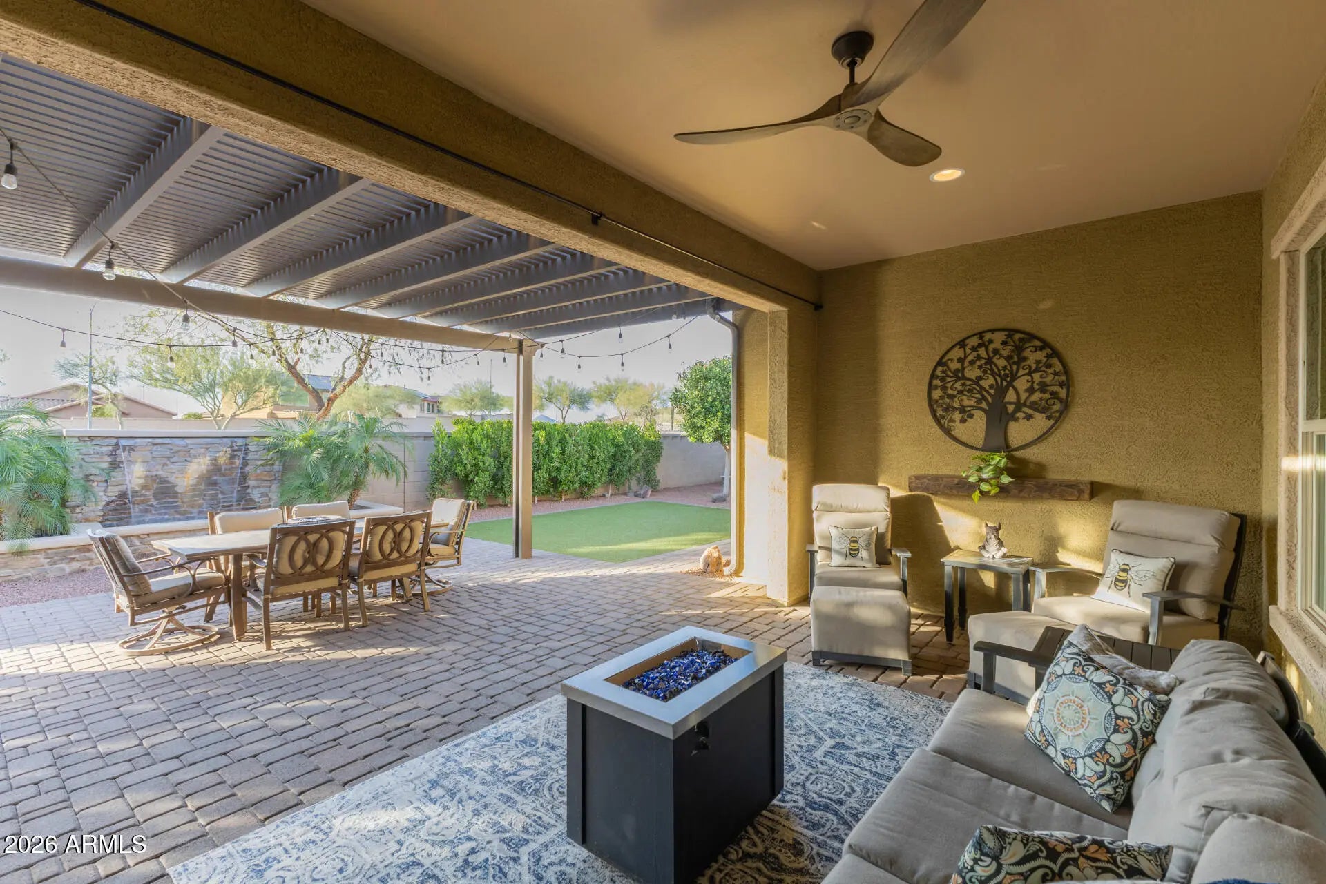 26288 N 106th Drive, Peoria, AZ 85383 is a highly upgraded single-level home located on a private cul-de-sac lot in the desirable Tierra Del Rio community of North Peoria. Offering approximately 2,993 square feet with no interior steps, mountain views, and direct access to hiking trails just across the street, this Woodside Homes Canyon model delivers exceptional indoor-outdoor Arizona living. This thoughtfully designed split floor plan features 3 bedrooms, 2.5 bathrooms, a private den, and a spacious bonus room, providing flexible space for a home office, media room, gym, or guest retreat. The open concept great room is anchored by an oversized kitchen and showcases wood plank tile flooring, 9+ foot ceilings, 8-foot interior doors, abundant natural light, and upgraded lighting and ceiling fans throughout. The chef's kitchen includes granite countertops with a recently re-cut granite sink upgrade, a marble backsplash, gas cooktop, built-in microwave, wall ovens, an oversized center island with breakfast bar seating, and a large walk-in pantry. The kitchen flows seamlessly into the great room and dining space, creating an ideal setting for entertaining. The split primary suite offers privacy and comfort with a generous walk-in closet and a recently upgraded spa-style bathroom featuring new shower panels, updated glass, and modern Moen black fixtures. Secondary bedrooms are well-sized and thoughtfully positioned. Step outside to a true resort-style backyard designed for relaxation and entertaining. Enjoy a rebuilt water feature with custom ledgerstone and planters, an outdoor fireplace with travertine patio completed in 2024, a Bullfrog spa with dedicated electrical run, multiple permitted Alumawood patio covers, artificial turf, raised garden beds, mature landscaping, and no neighbors behind. The cul-de-sac location enhances privacy while capturing mountain views and stunning Arizona sunsets. Additional highlights include an owned 7.4kW roof-mounted solar system installed in 2020, sunscreens on south and west facing windows, dual-pane Low-E windows, owned water softener, Ring doorbell camera plus two additional exterior security cameras, and over $112,000 in documented seller improvements completed between 2020 and 2025. The three-car garage offers extensive storage with built-in cabinetry and overhead racks, plus a fully finished and climate-controlled single-car bay ideal for a home gym, workshop, hobby space, or additional office. Conveniently located near Happy Valley Road and Loop 303 with easy access to shopping, dining, Lake Pleasant recreation, and major North Valley employment corridors, this move-in ready Tierra Del Rio home combines quality construction, thoughtful upgrades, energy efficiency, and a premium lot location.
