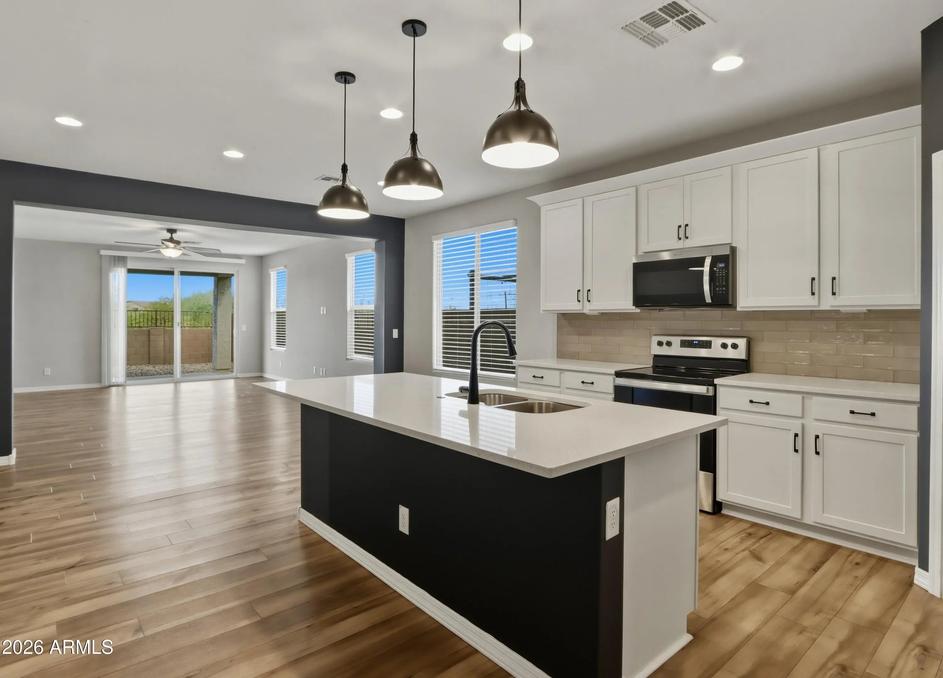 Experience the perfect blend of style and serenity in this recently built 3-bed, 2-bath home plus den. Situated on a premium lot with no neighbors behind, you'll enjoy breathtaking mountain vistas from both the front and back. The chef-inspired kitchen impresses with white shaker cabinets, modern quartz countertops, a custom brick-lay backsplash, and premium stainless appliances. The interior feels brand new with fresh paint and a mix of luxury vinyl plank flooring and plush carpet. Built with the latest energy-efficient tech, this home is located in a vibrant community featuring a pool, fitness center, parks, and trails. Minutes from top-tier shopping and dining. Your turnkey mountain-view retreat awaits! Washer, dryer, and refrigerator included.