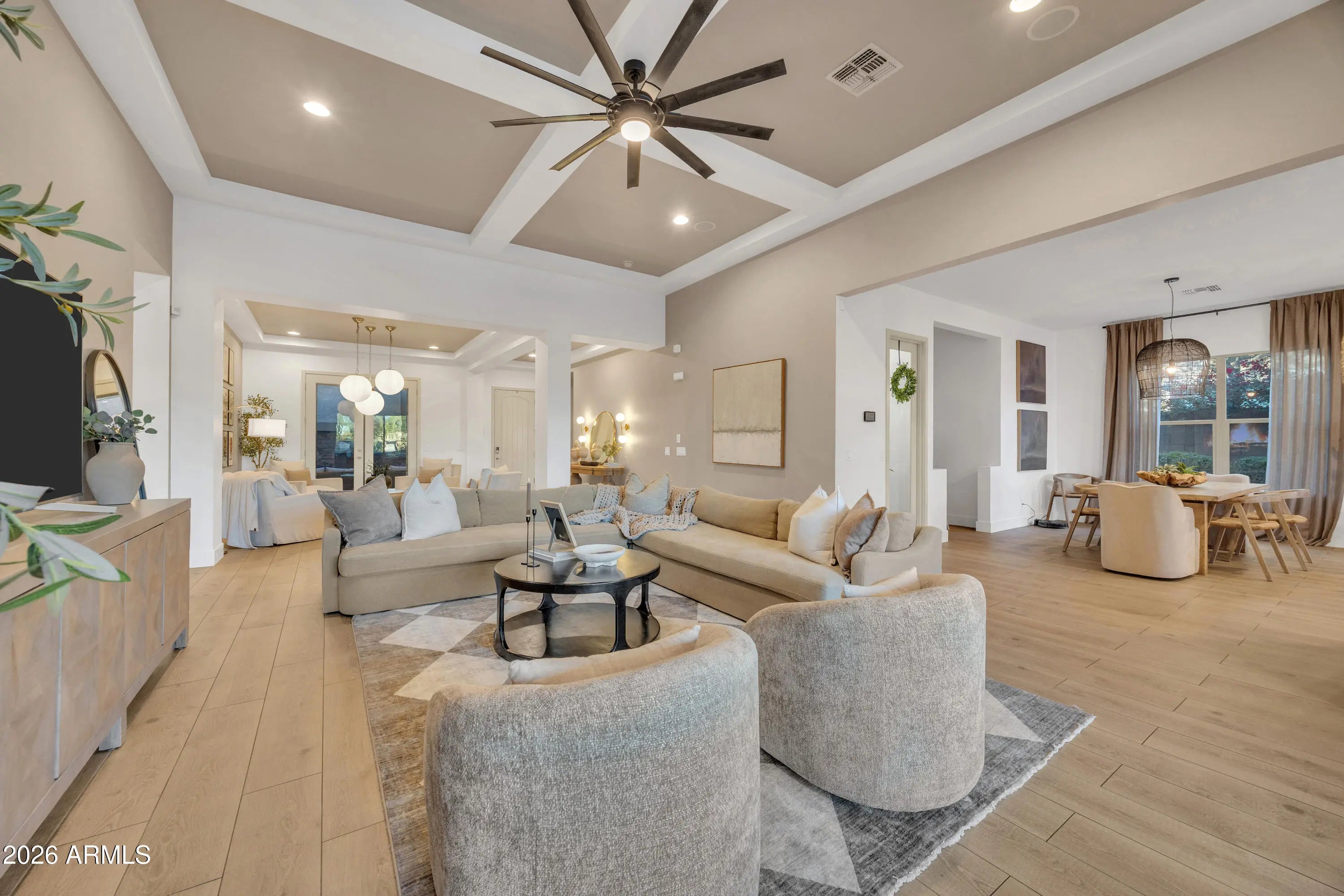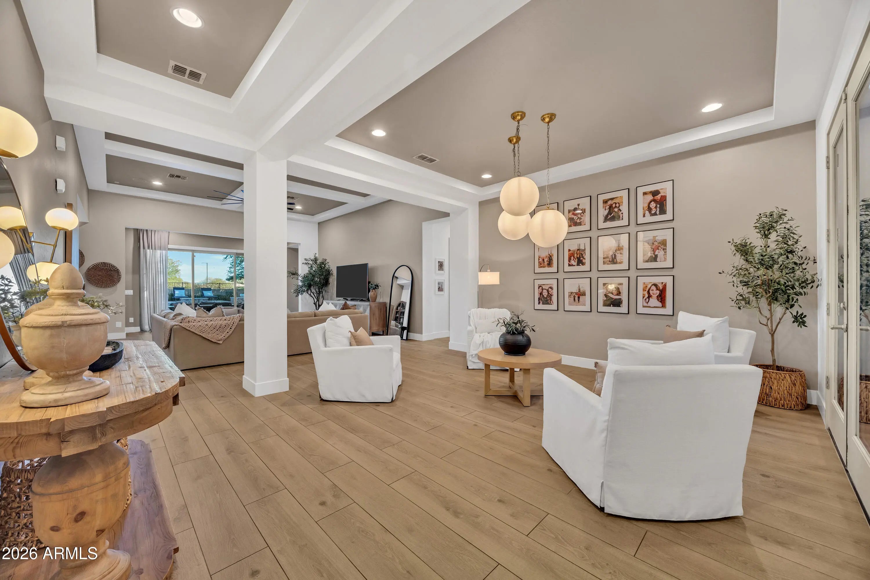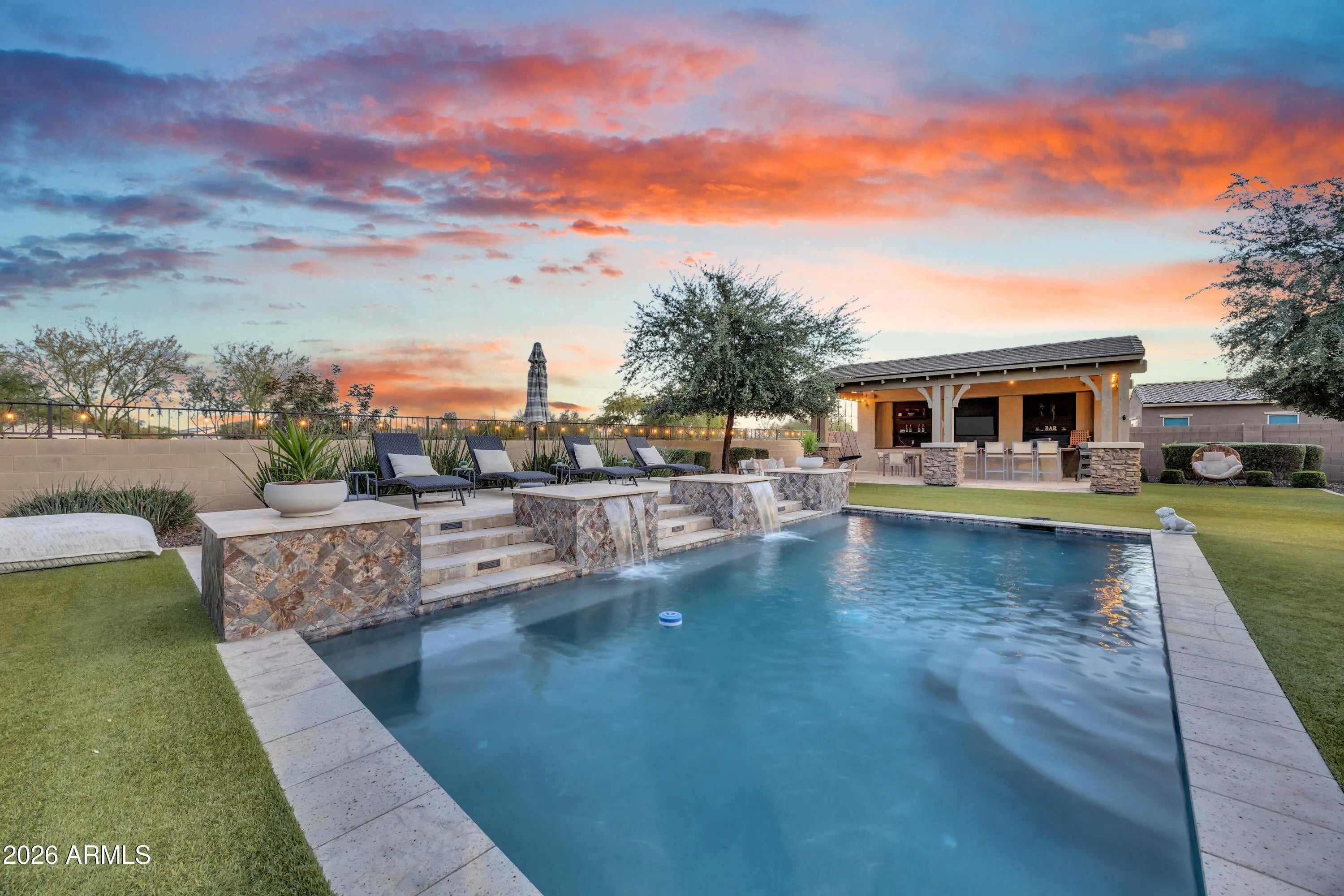 Welcome to refined resort-style living in the highly desirable community of Sedella. This exceptional residence was originally built as a former model home and has since been further enhanced with thoughtful updates and renovations by the current owners. From the moment you arrive, the home impresses with striking curb appeal, stone-accented architecture, and meticulously maintained landscaping. Inside, the open-concept floor plan showcases designer finishes throughout, including wide plank wood flooring, coffered ceilings, custom lighting, and an abundance of natural light that elevates every living space. The chef's kitchen serves as the centerpiece of the home, featuring an oversized quartz island, upgraded cabinetry, double ovens, stainless steel appliances, and a layout ideal for entertaining. The kitchen flows seamlessly into expansive living and dining areas, creating an inviting environment for both everyday living and hosting. The primary suite offers a private retreat with tranquil backyard views and a spa-inspired bathroom complete with a freestanding soaking tub, dual vanities, and a spacious walk-in shower. Step outside to a backyard designed for year-round enjoyment, featuring a custom pool with water features, multiple lounging areas, and a covered outdoor pavilion with a built-in bar, perfect for entertaining. A private front courtyard with a fireplace adds another inviting outdoor living space. Sedella is one of Goodyear's premier master-planned communities, known for its scenic mountain views, community parks, and convenient access to the Loop 303 and I-10. The area continues to experience strong growth with expanding retail, dining, employment centers, golf courses, and outdoor recreation nearby. This home offers the rare combination of model-quality design, owner-improved finishes, and a lifestyle centered on comfort, elegance, and long-term value in one of the West Valley's fastest-growing communities.