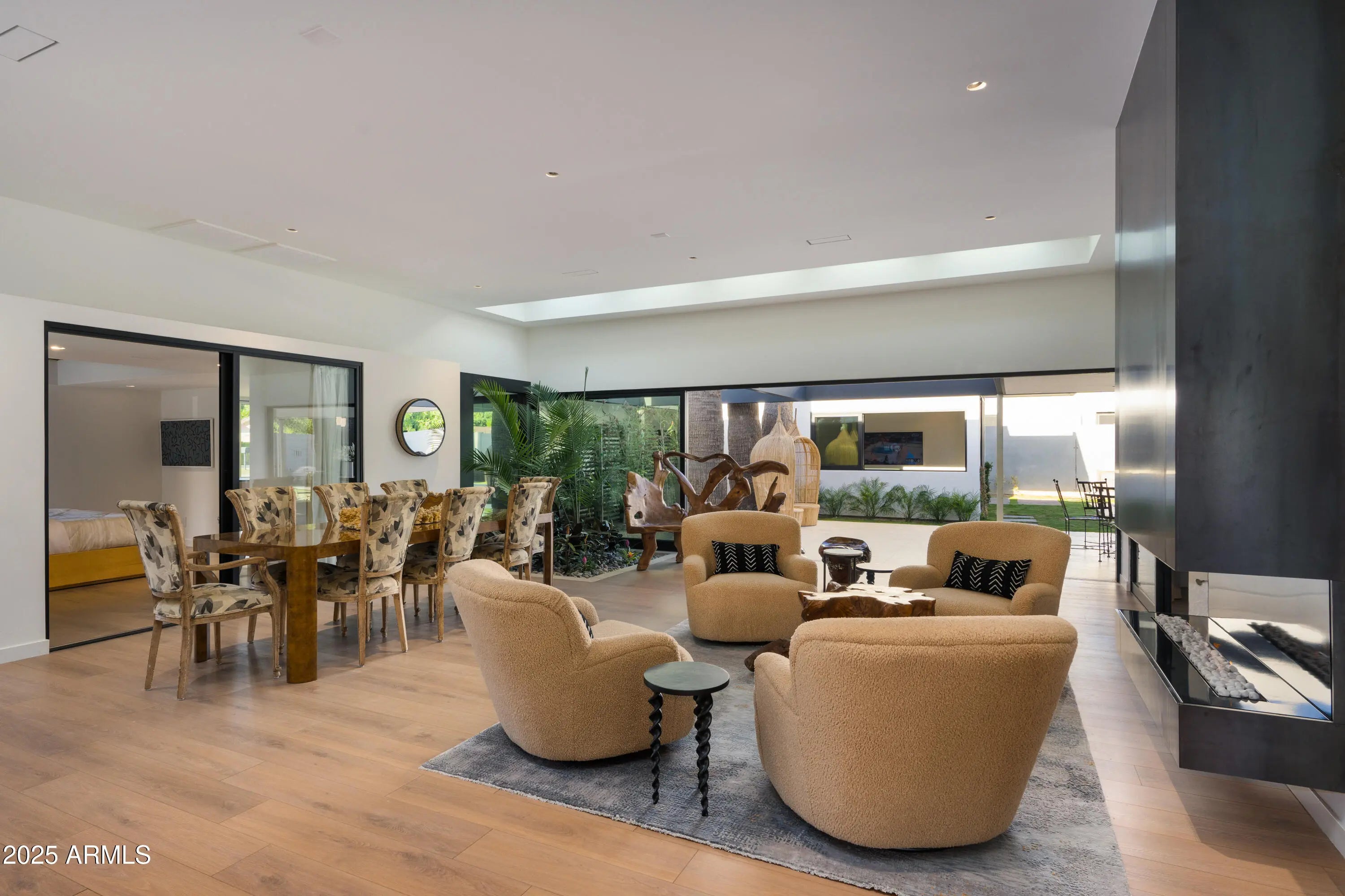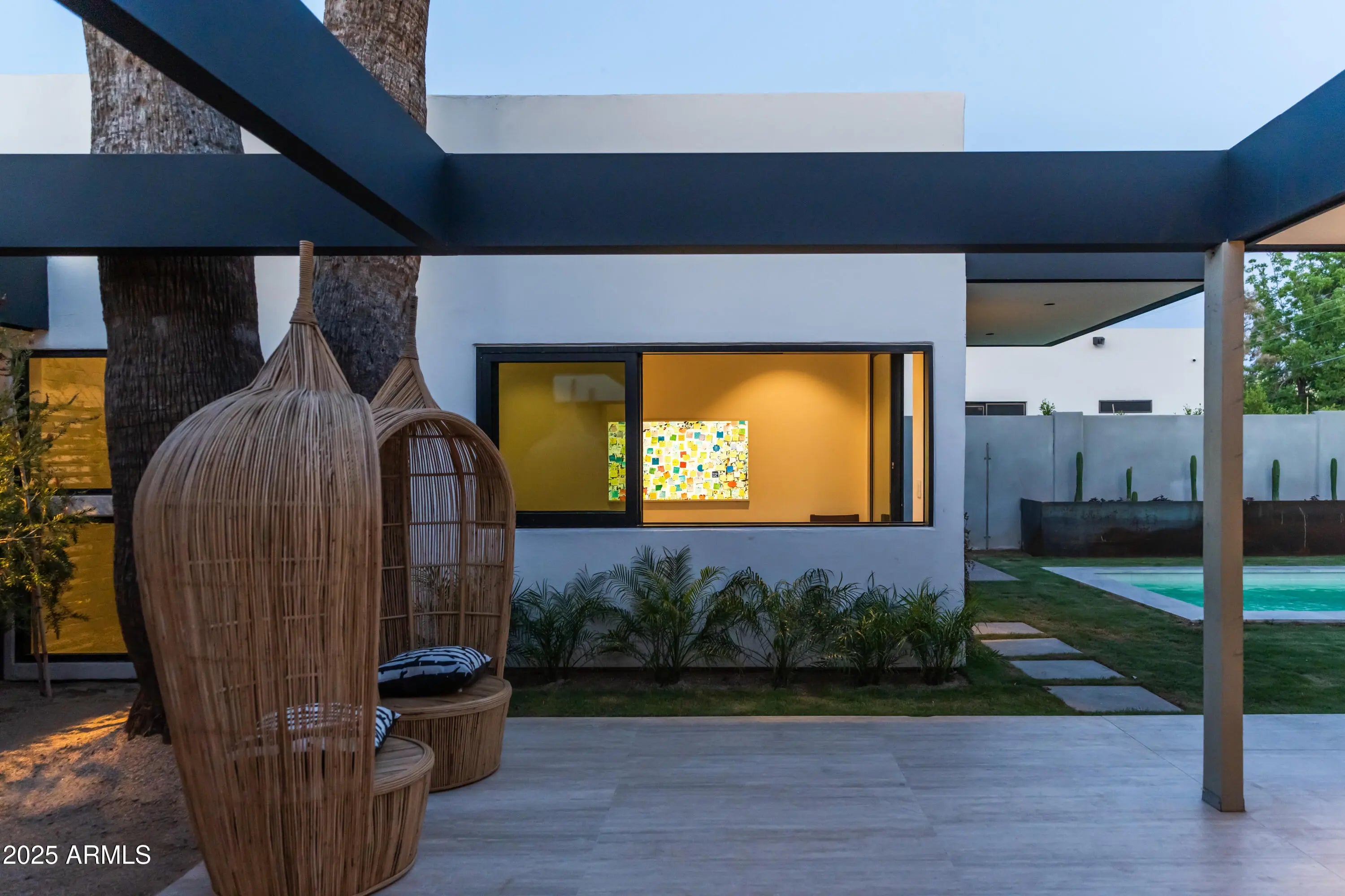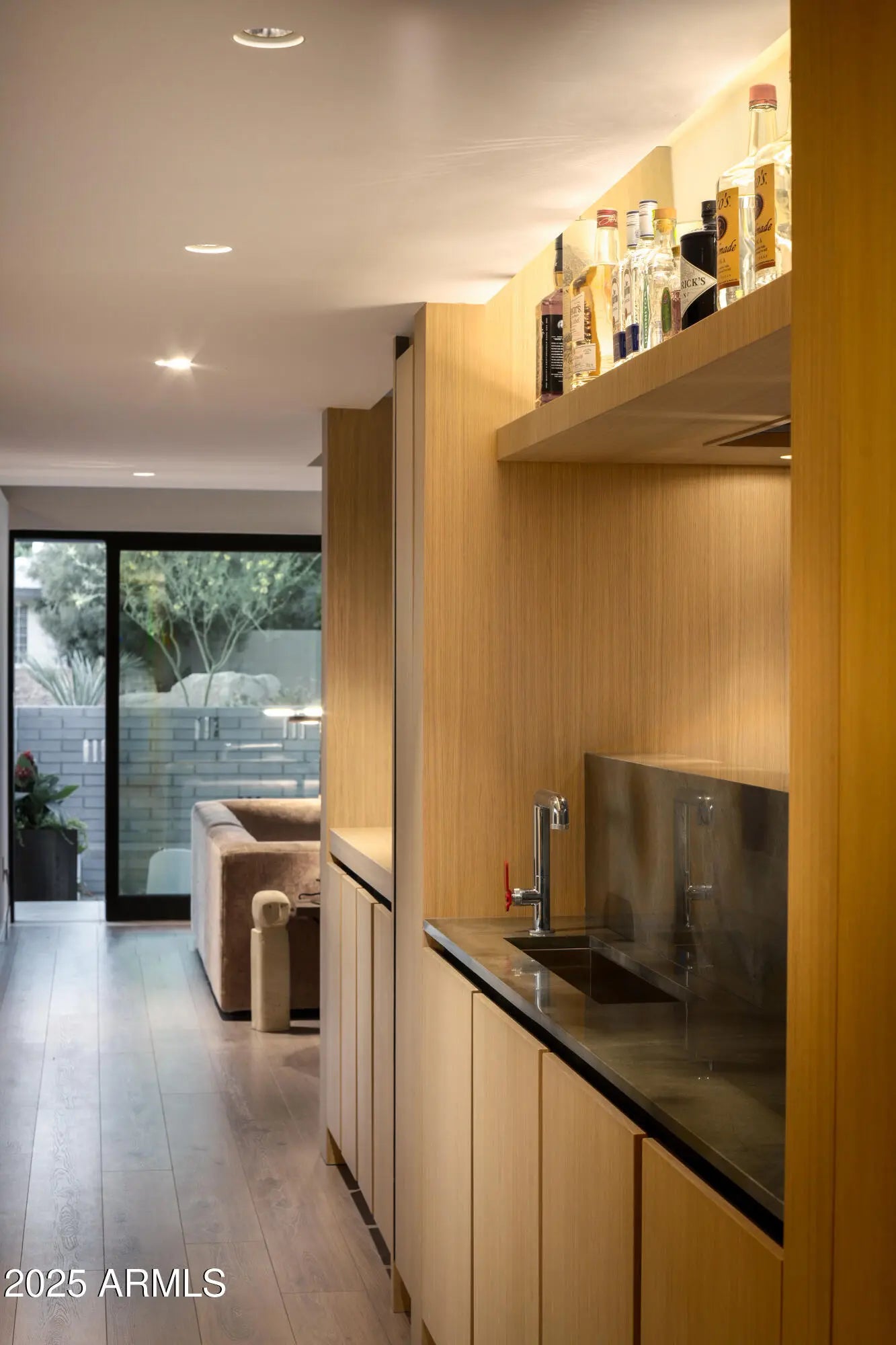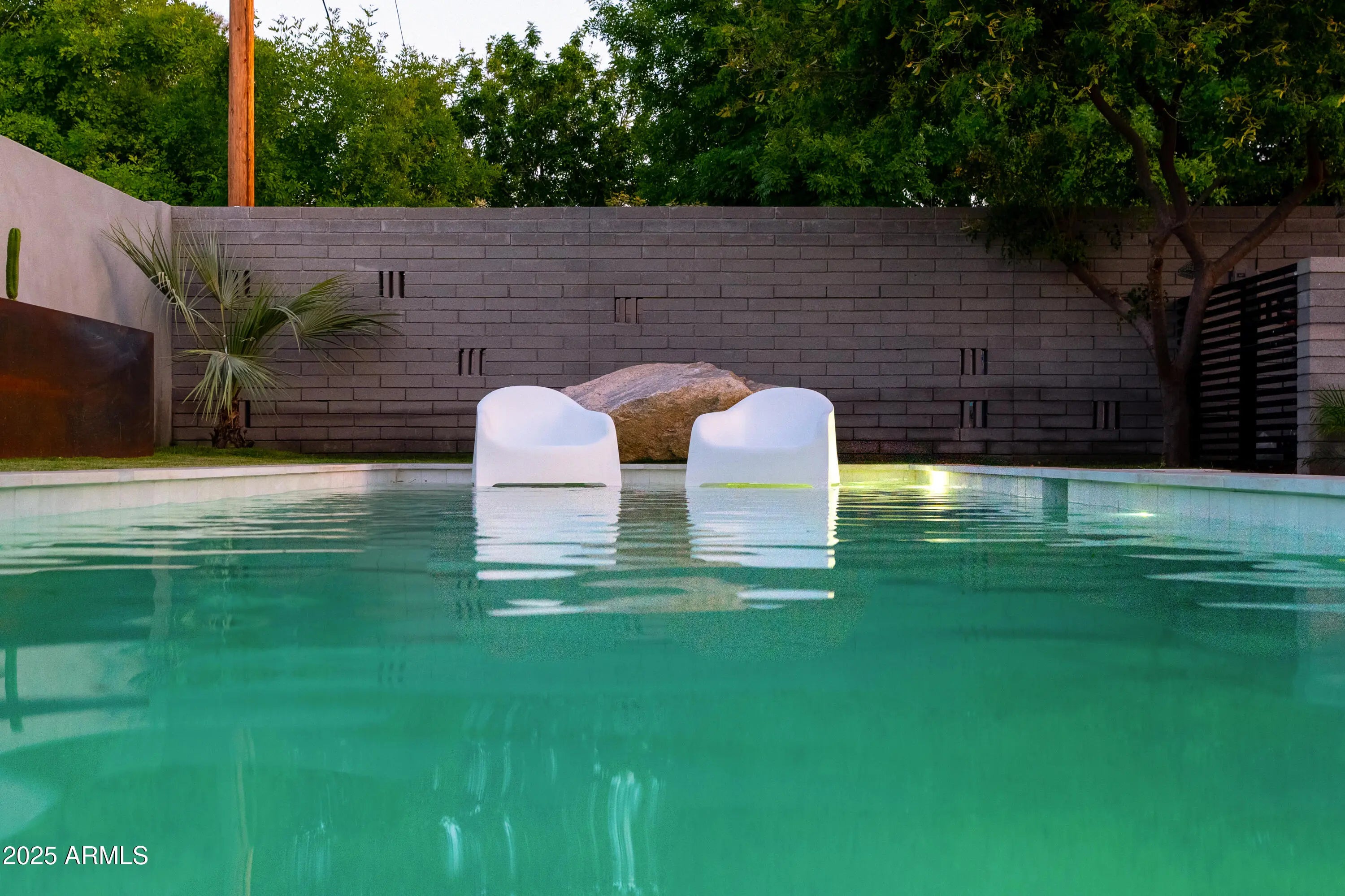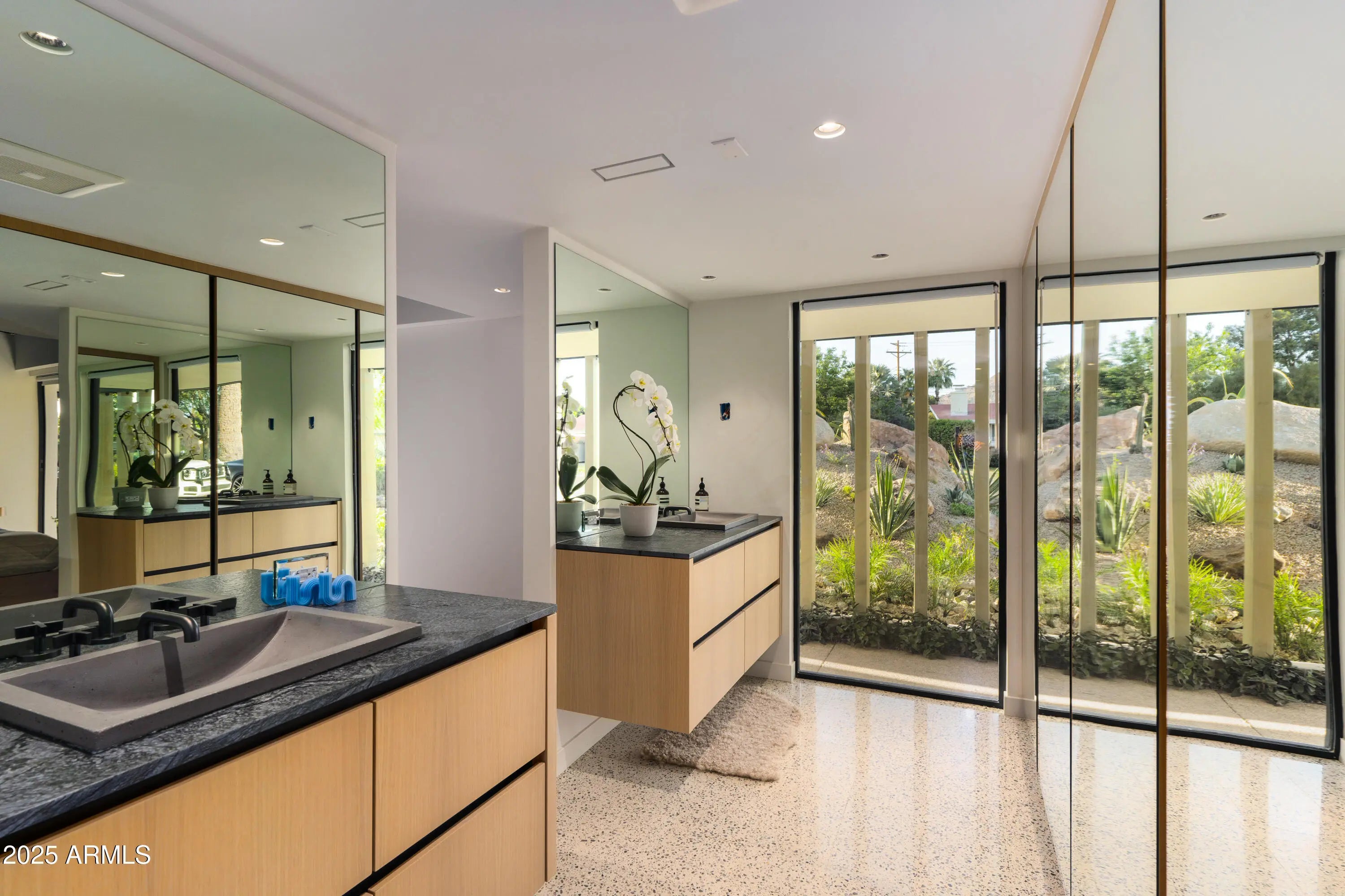 Mid-century icon originally dreamed by William B. Scarbro and reborn by PHX Historic, this residence blurs art, architecture, and landscape. Professionally sculpted grounds wrap the home in desert theater with towering palms, carved boulders, and curated plantings framing every sightline. Inside, a sun-washed great room reveals blonde hardwoods, rift-cut white oak millwork, and slabs of blue Tortuga marble that feel almost aquatic. The culinary core features a Pro-48 Sub-Zero, Wolf 48'' gas range, scullery, and paneled Cove dishwasher. The main house hosts a primary suite with ¾ bath, two guest rooms joined by a jack-and-jill, office, laundry, and a powder mural. A private casita adds a family lounge, bedroom, and ¾ bath. Indoors dissolve into the pool, fenced grounds, and 60-year palms.